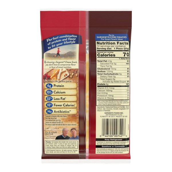 u0026bull;With 6 Grams of Protein per serving*, Sargento® Colby-Jack Natural Cheese Sticks keeps you satisfied through snack time and beyond.u003cbru003eu0026bull;Sargento® Colby-Jack Natural Cheese Sticks are a natural source of Calcium, each individual stick contains 15% Calcium and 60 Calories*. These Percent Daily Values are based on a 2,000 calorie diet. *See Nutrition Information for Total Fat u0026 Saturated Fat Contentu003cbru003eu0026bull;When you need a quick and delicious snack to tide you over, choose Sargento® Reduced Fat Colby-Jack Natural Cheese Sticks to help power you through your day.u003cbru003eu0026bull;This includes one 9-ounce package of Reduced Fat Colby-Jack Natural Cheese sticks that contains 12 individual sticks.u003cbru003eu0026bull;Our Family’s Passion Is Cheese
