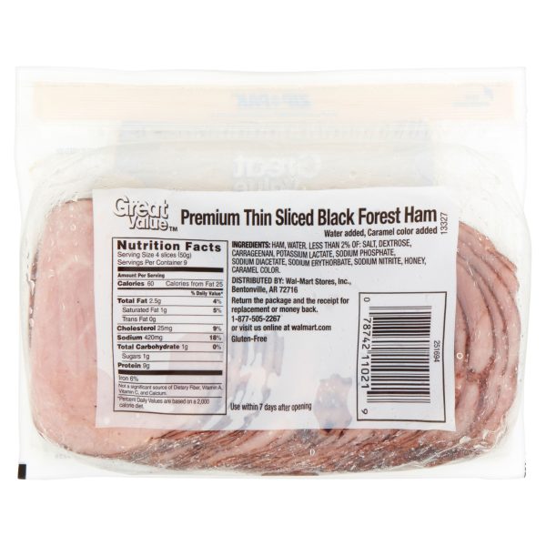 Start off the perfect sandwich with Great Value Black Forest Ham. This deli-style ham is perfect for quick and easy meals you can enjoy at home, in office or on the go. Pile high between your favorite bread and add all your favorite toppings like cheese, tomatoes, lettuce, onions, mayo, mustard, ranch and more. Serve with a side of chips, salad or fruit for a tasty and wholesome lunch. This package contains about 36 slices, making it easy to stock up for the whole week or for the whole family. This sandwich meat is USDA inspected. It comes in an easy open/close package to ensure your deli meat is fresh after every use. Enjoy the fresh from the deli taste with Great Value Black Forest Ham.Great Value products provide families with affordable, high-quality grocery and household consumable options. With our wide range of product categories spanning grocery and household consumables, we offer you a variety of products for your family’s needs. Our products are conveniently available online and in Walmart stores nationwide, allowing you to stock up and save money at the same time.