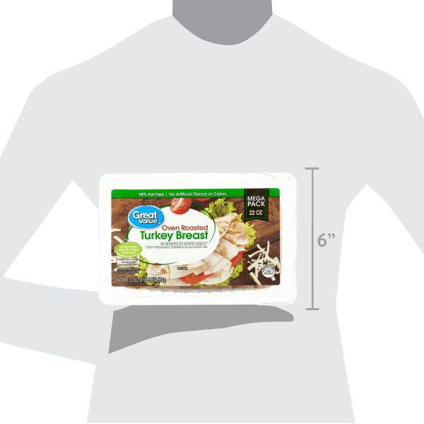 Take your meal to the next level with Great Value Oven Roasted Turkey Breast Mega Pack. Our tasty turkey is an excellent sandwich filler or salad topper that makes for a quick and healthy lunch you’ll love. With only 50 tiny calories and 9 grams of protein per serving, you can afford to pile a triple-decker club or classic sub high with this deli meat. Our convenient mega pack comes with 22 ounces of delicious turkey, so you’ll have enough on hand for the entire family. Love lunchtime, dinnertime, or anytime with Great Value Oven Roasted Turkey Breast Mega Pack.