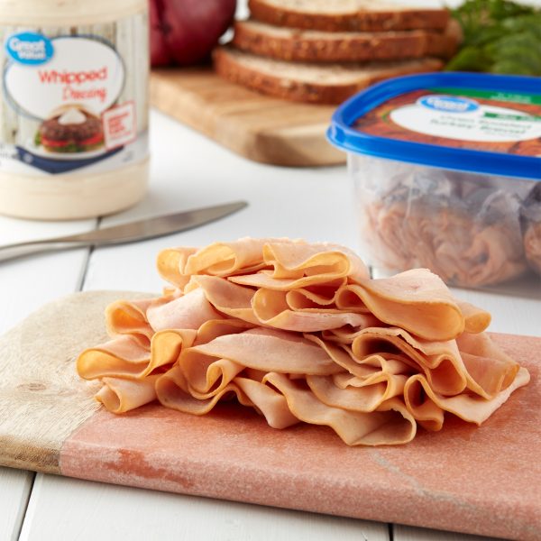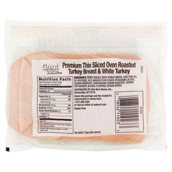 Start off the perfect sandwich with Great Value Premium Thin Sliced Oven Roasted Turkey Breast and White Turkey. This package features thin sliced, oven roasted turkey breast and white turkey. This deli-style turkey is perfect for quick and easy meals you can enjoy at home, in office or on the go. Pile high between your favorite bread and add all your favorite toppings like cheese, tomatoes, lettuce, onions, mayo, mustard, ranch and more. Serve with a side of chips, salad or fruit for a tasty and wholesome lunch. Each package contains about 36 slices, making it easy to stock up for the whole week or for the family. This deli meat is also gluten-free and USDA inspected. It comes in a zip-pak to ensure your deli meat is fresh after every use. Enjoy the fresh from the deli taste with Great Value Premium Thin Sliced Oven Roasted Turkey Breast and White Turkey.Great Value products provide families with affordable, high quality grocery and household consumable options. With our wide range of product categories spanning grocery and household consumables, we offer you a variety of products for your family’s needs. Our products are conveniently available online and in Walmart stores nationwide, allowing you to stock up and save money at the same time.