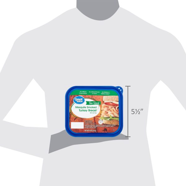 No deli sandwich is complete without a few slices of Great Value Thin Sliced Mesquite Smoked Turkey Breast. Mesquite has a unique taste that’s sweet and piney, making this deli meat a flavorful powerhouse that stands out from the rest. It pairs perfectly with mild slices of Provolone cheese and dijon mustard or thick slices of beefsteak tomatoes and fresh, crisp lettuce. Our tasty turkey only has 50 tiny calories per serving and is gluten free, making it an excellent choice for people pursuing a healthy lifestyle. Lunch doesn’t have to be boring when you choose Great Value Thin Sliced Mesquite Smoked Turkey Breast.