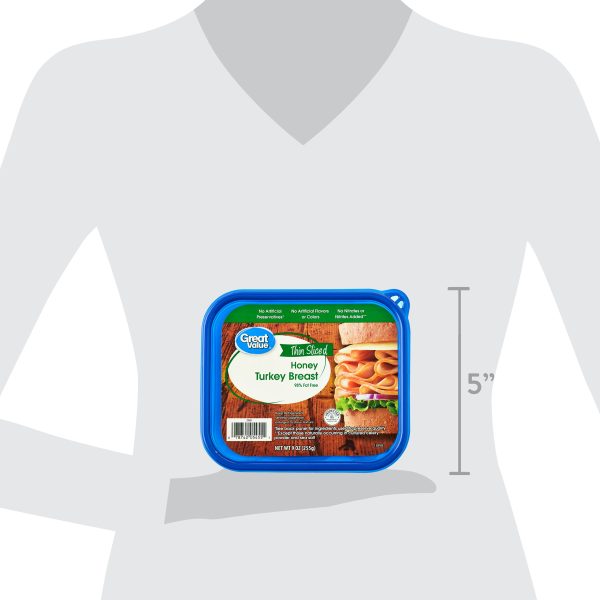 Great Value Thin Sliced Honey Turkey Breast is a 98% fat-free lunch meat that packs a delicious punch of flavor. With 9 grams of protein per serving, this lunch meat is perfect for the most hearty appetites and also a great snack option. Layer it with freshly sliced tomatoes and your favorite cheese for a wholesome sandwich, cut it into strips and add it to a salad, or enjoy a slice on its own right from the package. Made without artificial preservatives, colors, flavors, or added nitrates, Great Value Thin Sliced Honey Turkey Breast is an excellent option for healthy lifestyles.