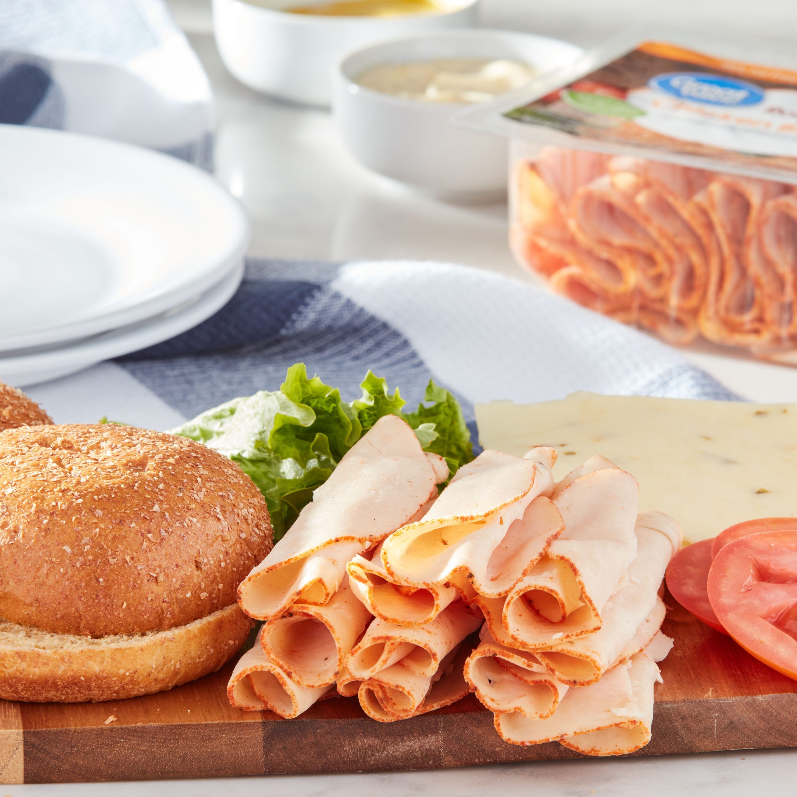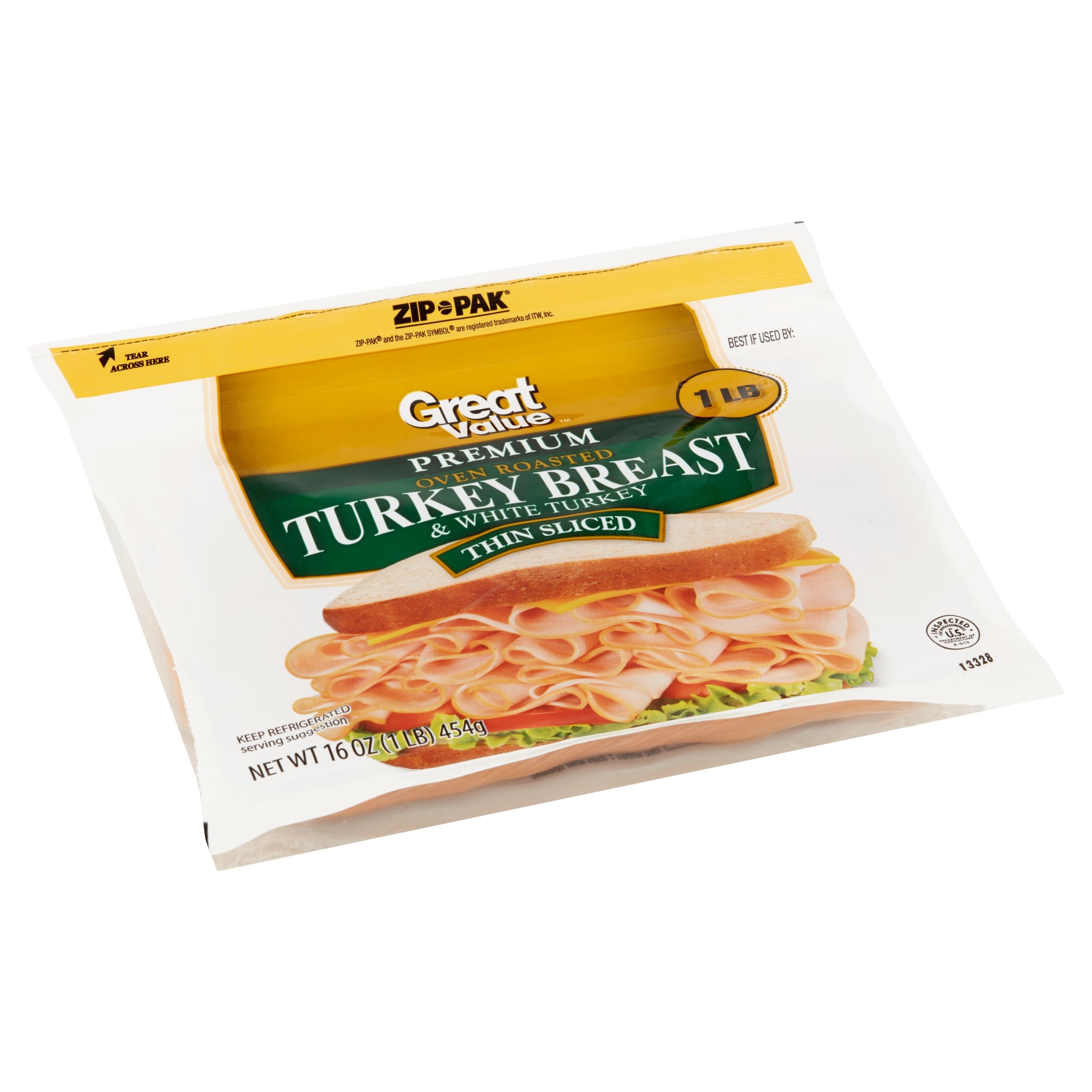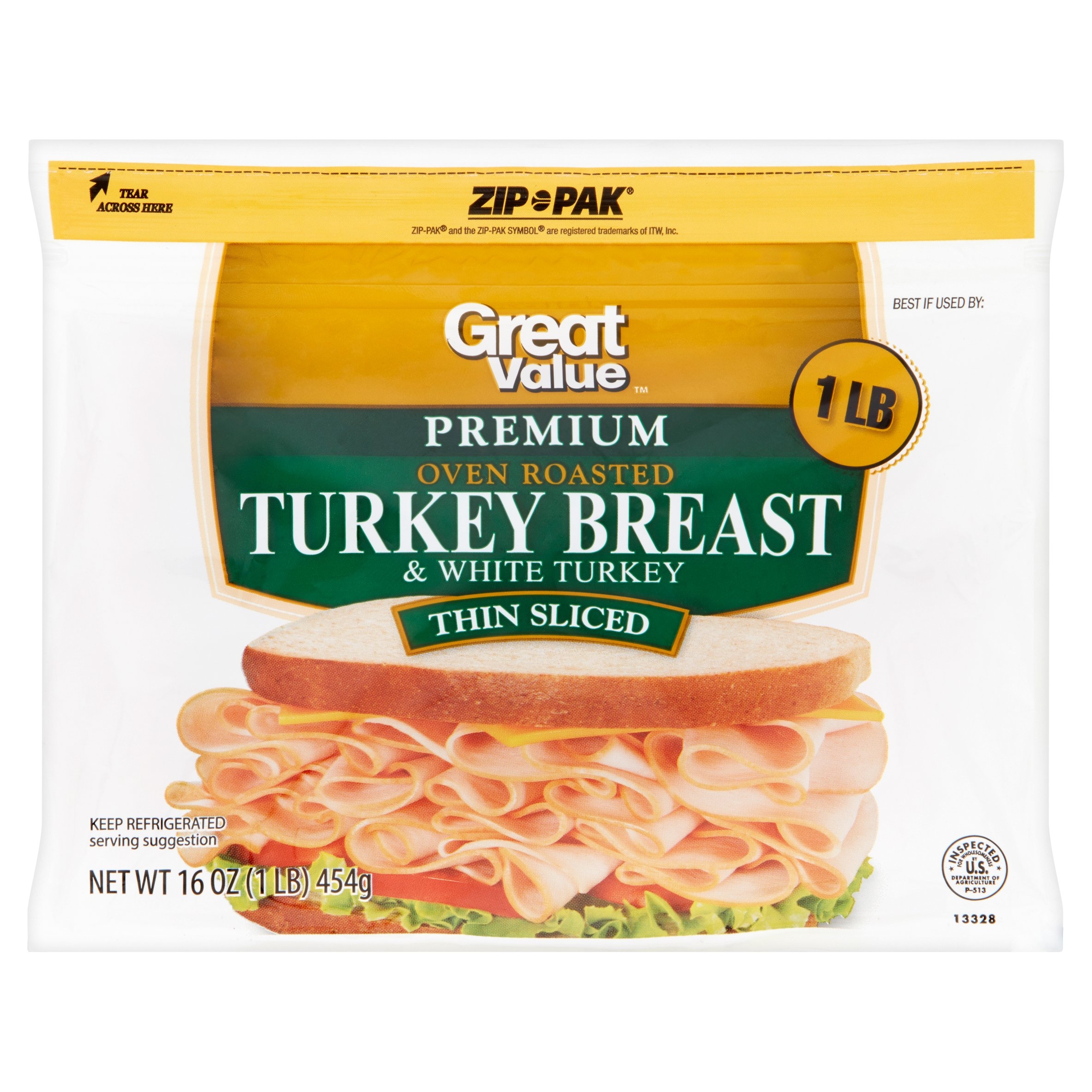 Start off the perfect sandwich with Great Value Premium Thin Sliced Oven Roasted Turkey Breast and White Turkey. This package features thin sliced, oven roasted turkey breast and white turkey. This deli-style turkey is perfect for quick and easy meals you can enjoy at home, in office or on the go. Pile high between your favorite bread and add all your favorite toppings like cheese, tomatoes, lettuce, onions, mayo, mustard, ranch and more. Serve with a side of chips, salad or fruit for a tasty and wholesome lunch. Each package contains about 36 slices, making it easy to stock up for the whole week or for the family. This deli meat is also gluten-free and USDA inspected. It comes in a zip-pak to ensure your deli meat is fresh after every use. Enjoy the fresh from the deli taste with Great Value Premium Thin Sliced Oven Roasted Turkey Breast and White Turkey.Great Value products provide families with affordable, high quality grocery and household consumable options. With our wide range of product categories spanning grocery and household consumables, we offer you a variety of products for your family’s needs. Our products are conveniently available online and in Walmart stores nationwide, allowing you to stock up and save money at the same time.