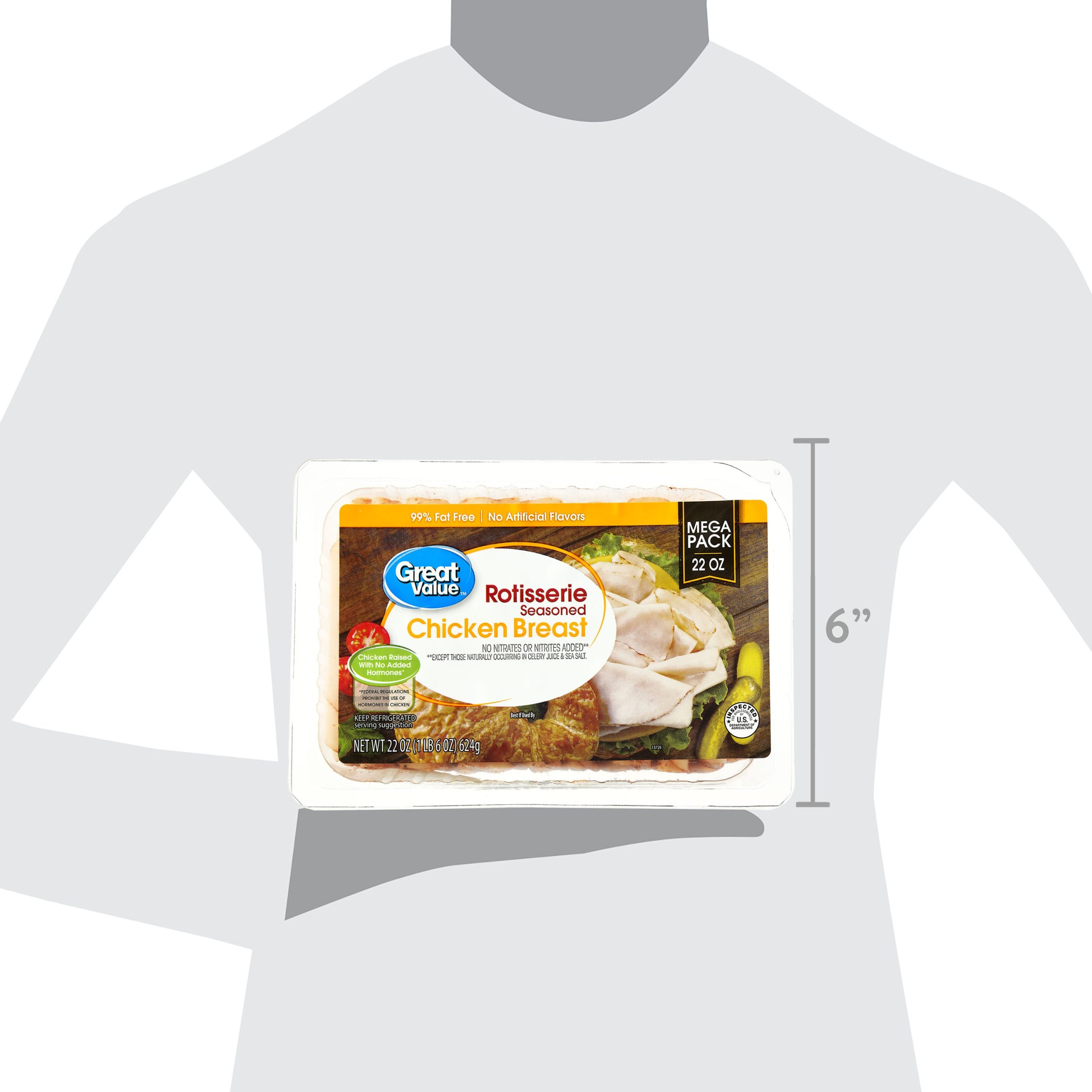 Great Value Rotisserie Seasoned Chicken Breast Mega Pack is the perfect choice for feeding large groups including families, sports teams, and party guests. This 99% fat-free lunch meat is a smart choice for healthy lifestyles and can be enjoyed in a variety of ways. Layer this sliced chicken breast in a sliced croissant, a panini, or your favorite sandwich bread and prepare to take lunch to a whole new level! Great Value Rotisserie Seasoned Chicken Breast Mega Pack contains no artificial flavors and is so appetizing, you may make this your new go-to lunch meat.