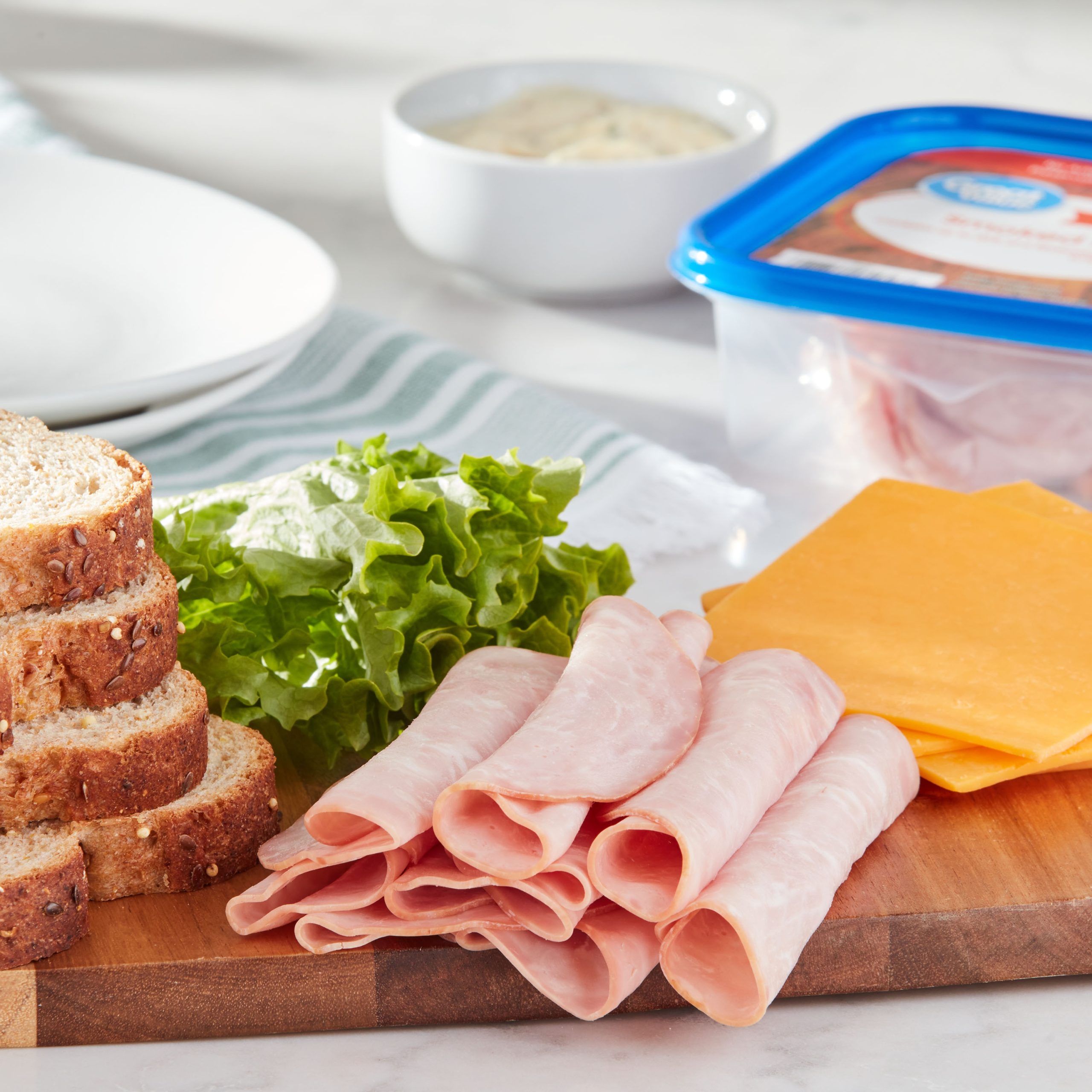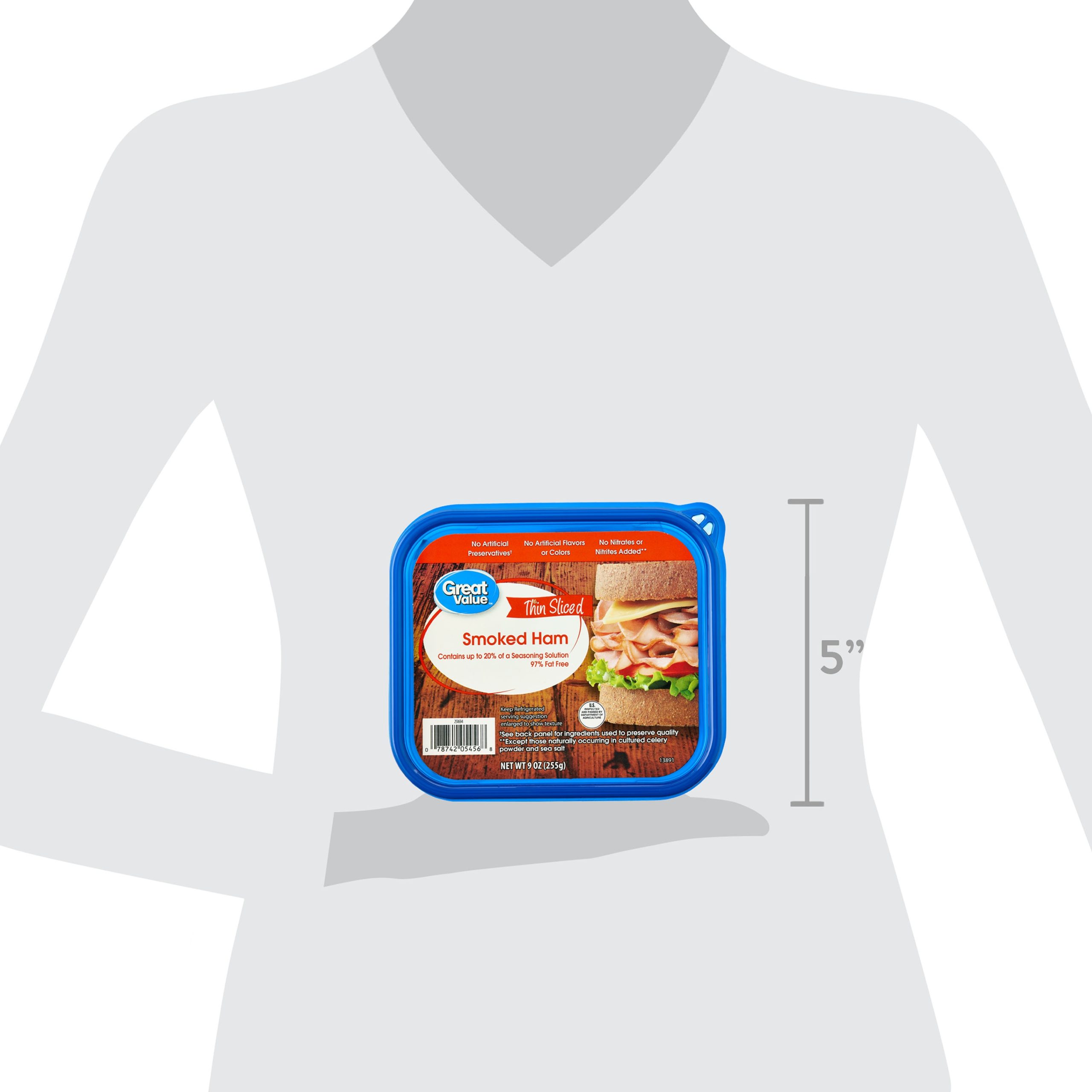 Whether you are making yourself a sandwich or preparing an appetizer for your next party, Great Value Thin Sliced Smoked Ham is the deli meat for you. Each 9-ounce tub offers a ready-to-enjoy treat that is deliciously seasoned and perfectly sliced. This meat does not contain any artificial flavors, colors, or added nitrates or nitrites, making it a healthy option for the whole family. It is also 97 percent fat free and packaged in a resealable container that maintains freshness when properly stored in the refrigerator. Make Great Value Thin Sliced Smoked Ham your go-to deli meat!