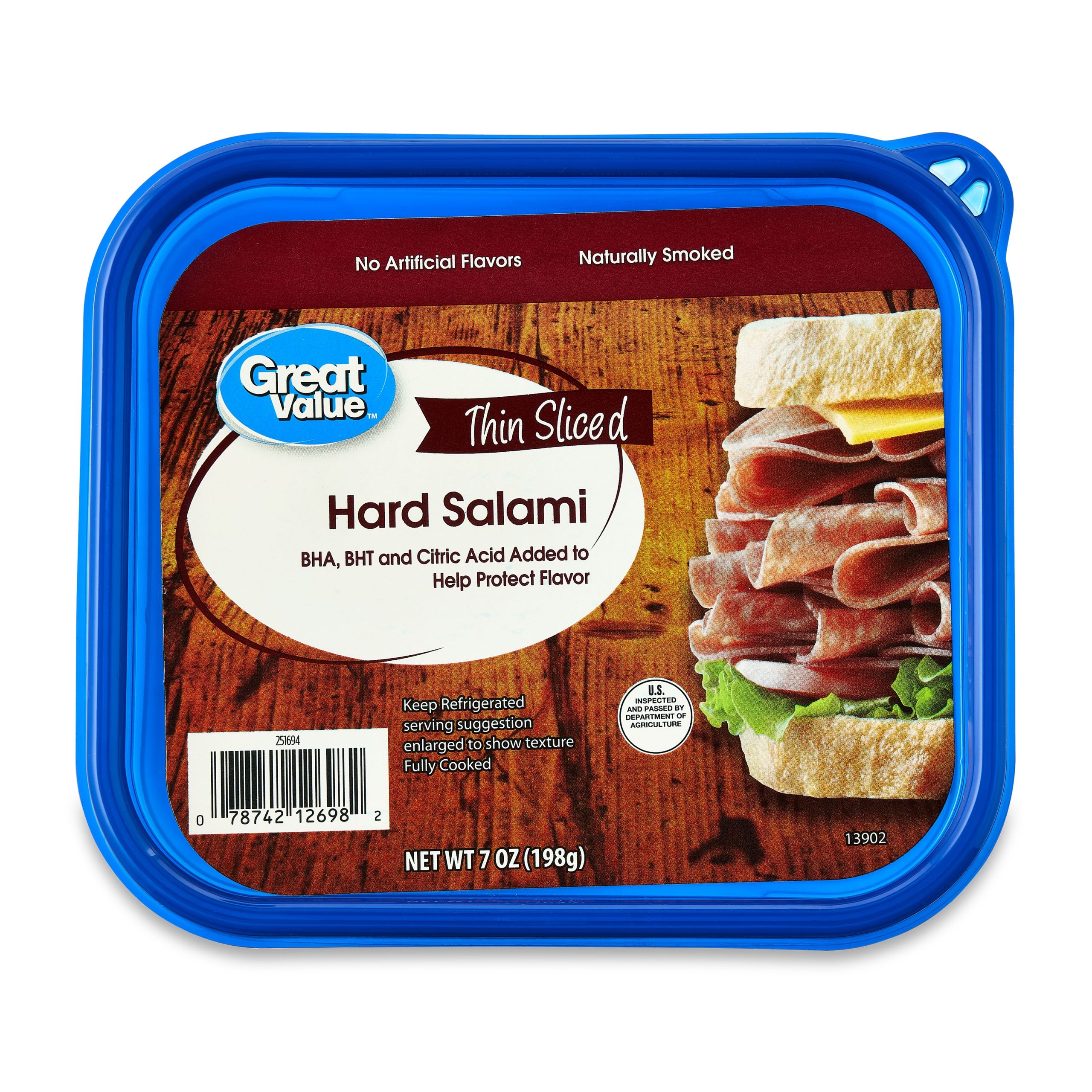 No refrigerator is quite complete without the delicious and bold flavor of Great Value Thin Sliced Hard Salami. Each 7-ounce resealable tub contains seven total servings of thinly sliced, ready-to-eat, naturally-smoked salami that is perfect for paninis, charcuterie boards, pizzas, and more! You can even grab a slice on its own whenever hunger strikes. Be sure to keep the container refrigerated to ensure your meat stays fresh and flavorful. Add Great Value Thin Sliced Hard Salami to your grocery shopping list today!