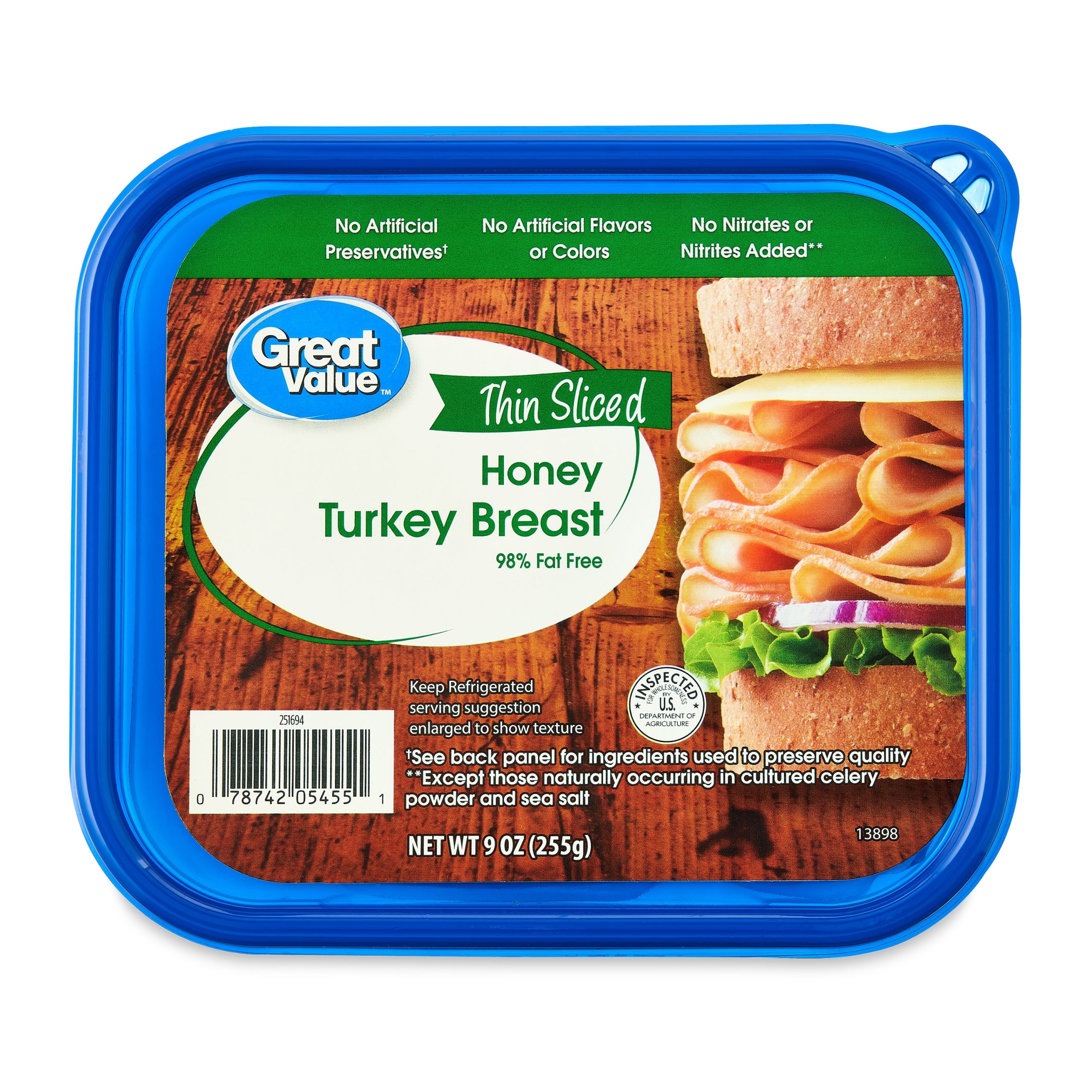 Great Value Thin Sliced Honey Turkey Breast is a 98% fat-free lunch meat that packs a delicious punch of flavor. With 9 grams of protein per serving, this lunch meat is perfect for the most hearty appetites and also a great snack option. Layer it with freshly sliced tomatoes and your favorite cheese for a wholesome sandwich, cut it into strips and add it to a salad, or enjoy a slice on its own right from the package. Made without artificial preservatives, colors, flavors, or added nitrates, Great Value Thin Sliced Honey Turkey Breast is an excellent option for healthy lifestyles.