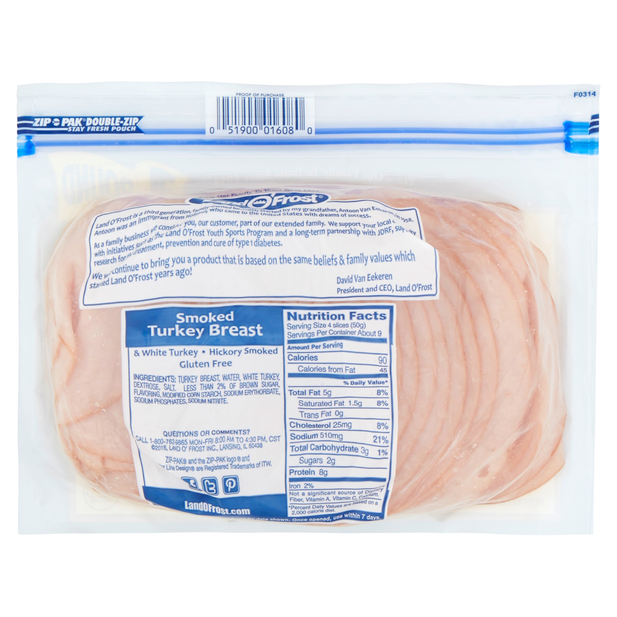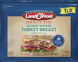 Land O’Frost Premium Hickory Smoked Turkey Breast and White Turkey is affordable, high quality lunchmeat. Made with no by-products, no added hormones* and no artificial flavors, these lean slices are a superior protein option for quick lunches, dinners and snacks. The popular Land O’Frost Premium meats are packed in blue resealable pouches with special double zip lock seals to help keep your slices fresh and delicious. When it comes to flavor, Land O’Frost Premium Hickory Smoked Turkey luncheon meats are naturally smoked the old fashioned way, never made with artificial smoke additives. Stuff these savory slices into your sandwiches, wraps, casseroles, snacks and more! *Federal regulations prohibit the use of hormones in poultry, excludes beef.