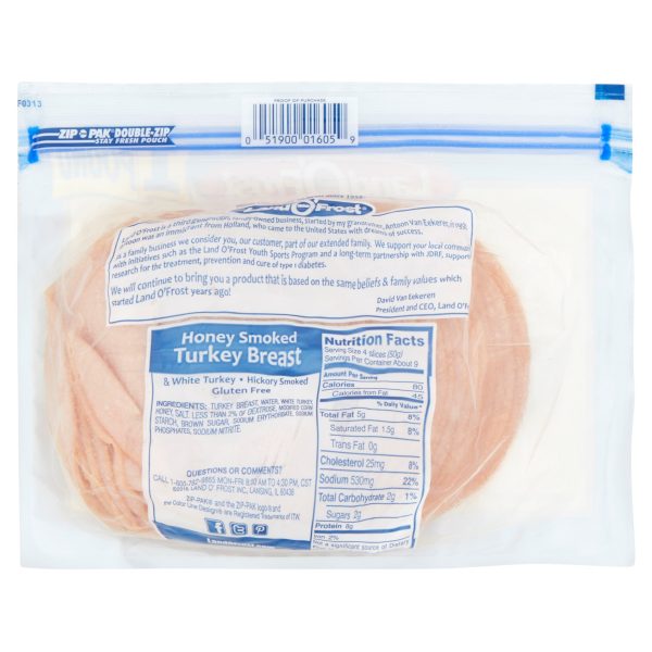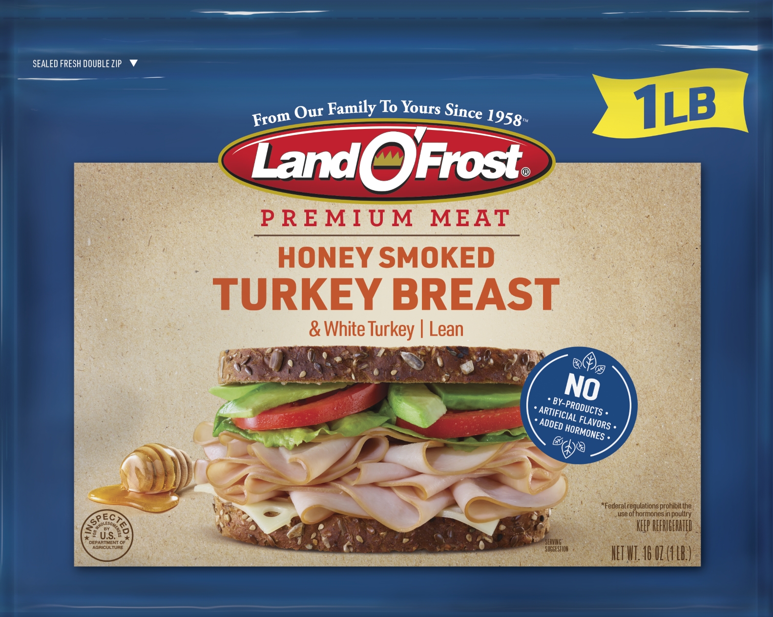 Land O’Frost Premium Honey Smoked Turkey Breast is affordable, high quality lunchmeat. Made with no by-products, no added hormones* and no artificial flavors, these lean slices are a superior protein option for quick lunches, dinners and snacks. The popular Land O’Frost Premium cold cuts are packed in blue resealable pouches with special double zip lock seals to help keep your slices fresh and delicious. When it comes to flavor, Land O’Frost Premium Honey Smoked Turkey luncheon meats are naturally smoked the old fashioned way, never made with artificial smoke additives. One way to enjoy these sweet slices is to pair them with fruit and cheese, a tasty little snack pack for home or on the go! *Federal regulations prohibit the use of hormones in poultry, excludes beef