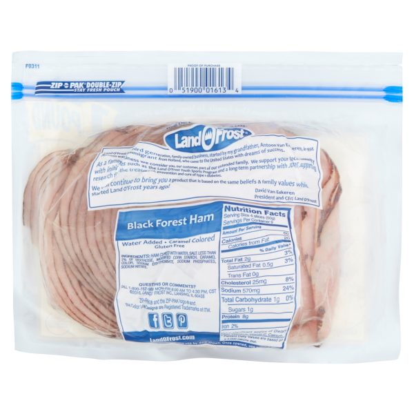 Land O’Frost Premium Old World Style Black Forest Ham is affordable, high quality lunchmeat. Made with no by-products, no added hormones* and no artificial flavors, these lean slices are the best protein option for quick lunches, dinners and snacks. The popular Land O’Frost Premium cold cuts are packed in blue resealable pouches with special double zip lock seals to help keep your slices fresh and delicious. When it comes to flavor, Land O’Frost Premium Old World Style Black Forest Ham luncheon meats are naturally smoked the old fashioned way, never made with artificial smoke additives. Mix these slices into a chopped salad, roll them in a wrap, or pile them on a platter with cheese, fruit and some of your other favorite snacks. There are so many ways to enjoy this lunchmeat! *Federal regulations prohibit the use of hormones in poultry, excludes beef