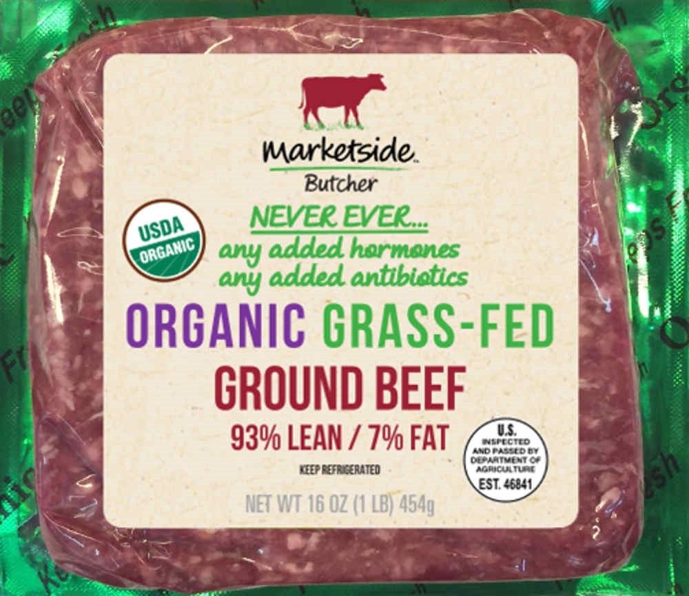 Make a smart choice by selecting Marketside Butcher 93% Lean / 7% Fat Organic Grass-Fed Ground Beef. This 100% grass-fed and grass-finished beef is from cattle that are never given any hormones, antibiotics, or steroids. Our free-range cattle are raised in pastures where they are able to roam and graze, resulting in delicious, tender beef. High in protein and iron, this tasty meat can provide necessary nutrients for your next meal. This 16-ounce package freezes easily so you can stock up for future meals. Marketside Butcher 93% Lean / 7% Fat Organic Grass-Fed Ground Beef is high-quality meat you can feel good about serving to your loved ones.