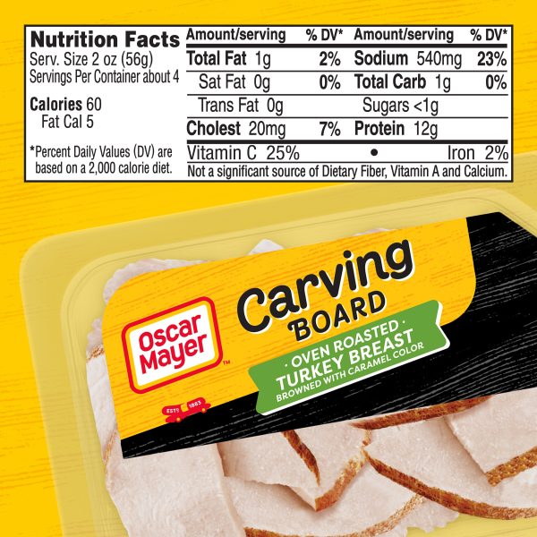 Enjoy thick, flavorful slices of turkey without the need to get out your own knife and carving board. Oscar Mayer Carving Board Oven Roasted Turkey Breast, Browned With Caramel Color, Lunch Meat is made with quality turkey breast and contains no saturated fat. Our carving board turkey lunch meat has a rich, classic turkey flavor. Fully cooked and ready to eat, our turkey slices are the perfect choice for sandwiches, salads, recipes and more. Use Oscar Mayer Carving Board deli meat to make a classic turkey and cheese sandwich or a turkey melt in a panini press. Keep each 7.5-ounce package of deli turkey refrigerated to maintain freshness. If you enjoy our oven roasted deli turkey, be sure to try the other varieties of Oscar Mayer lunch meat.