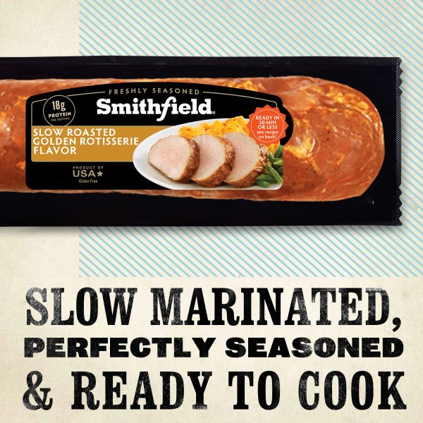 Smithfield Slow Roasted Golden Rotisserie Flavor Fresh Pork Tenderloin delivers mouthwatering slow-roasted flavor in every bite. Every tenderloin is marinated to add deep flavor and tenderness and dry rubbed with a rotisserie-style seasoning for amazing taste. This gluten free pork has no artificial ingredients and is easy to cook in the oven or on the grill. Bring the family together and choose a Smithfield Slow Roasted Golden Rotisserie Flavor Fresh Pork Tenderloin for a flavor-packed meal.