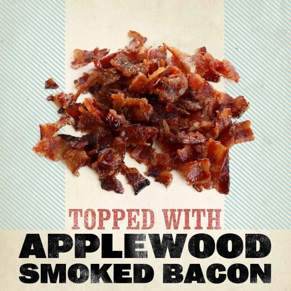 - Dry rubbed with savory seasoning and topped with real applewood smoked bacon