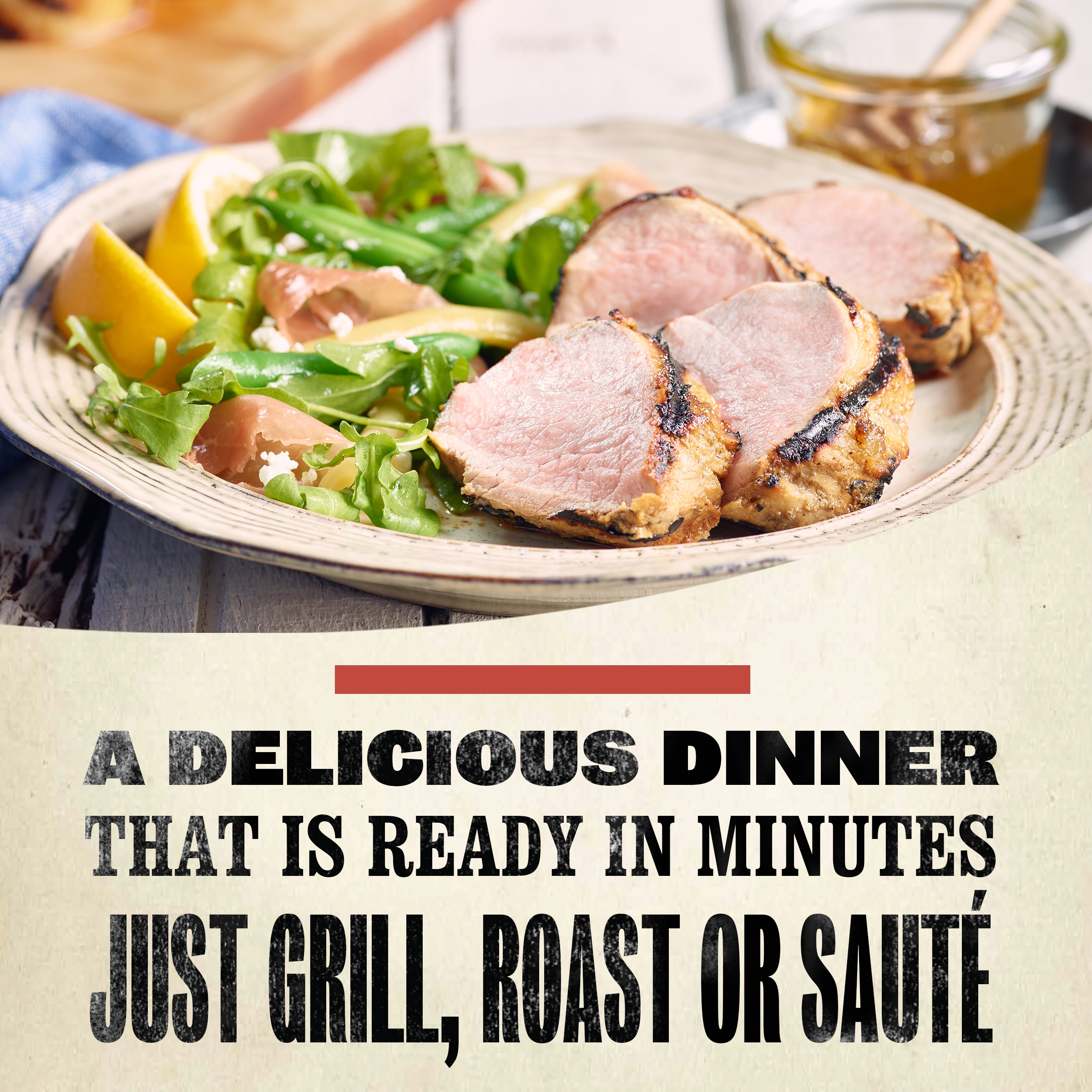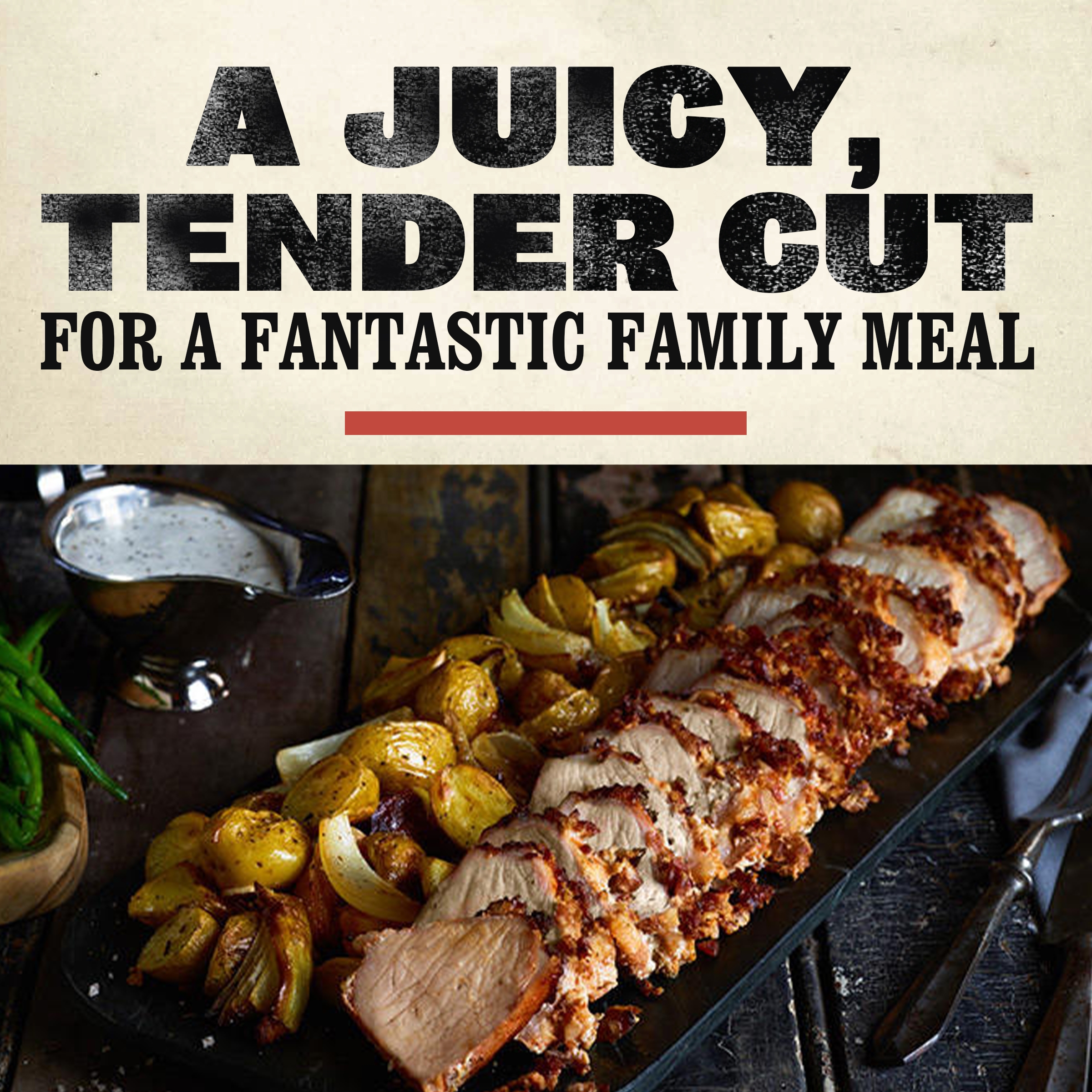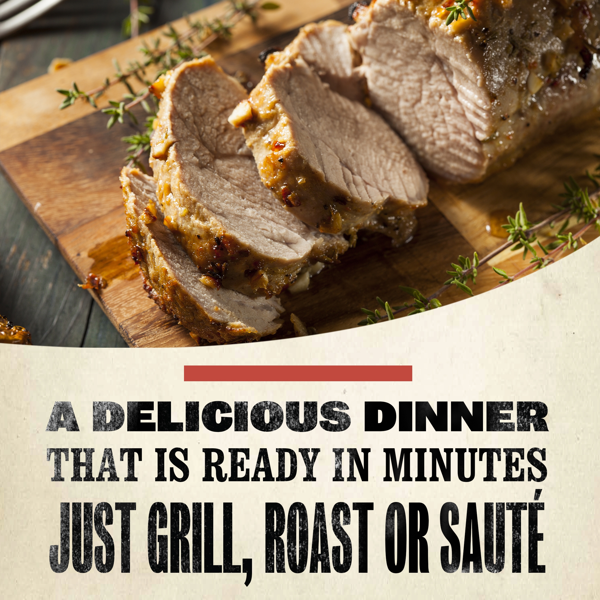 - 1 Smithfield Roasted Garlic & Herb Fresh Pork Loin Filet, cut into ¾-inch thick slices