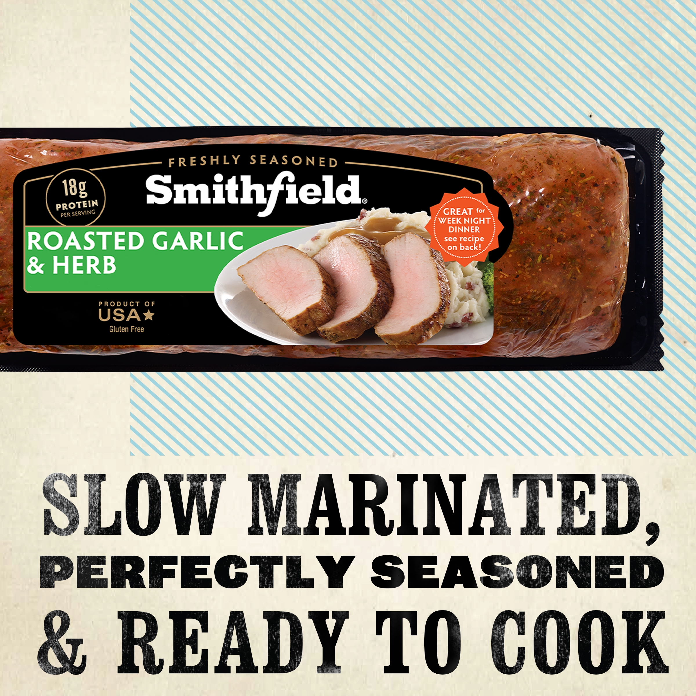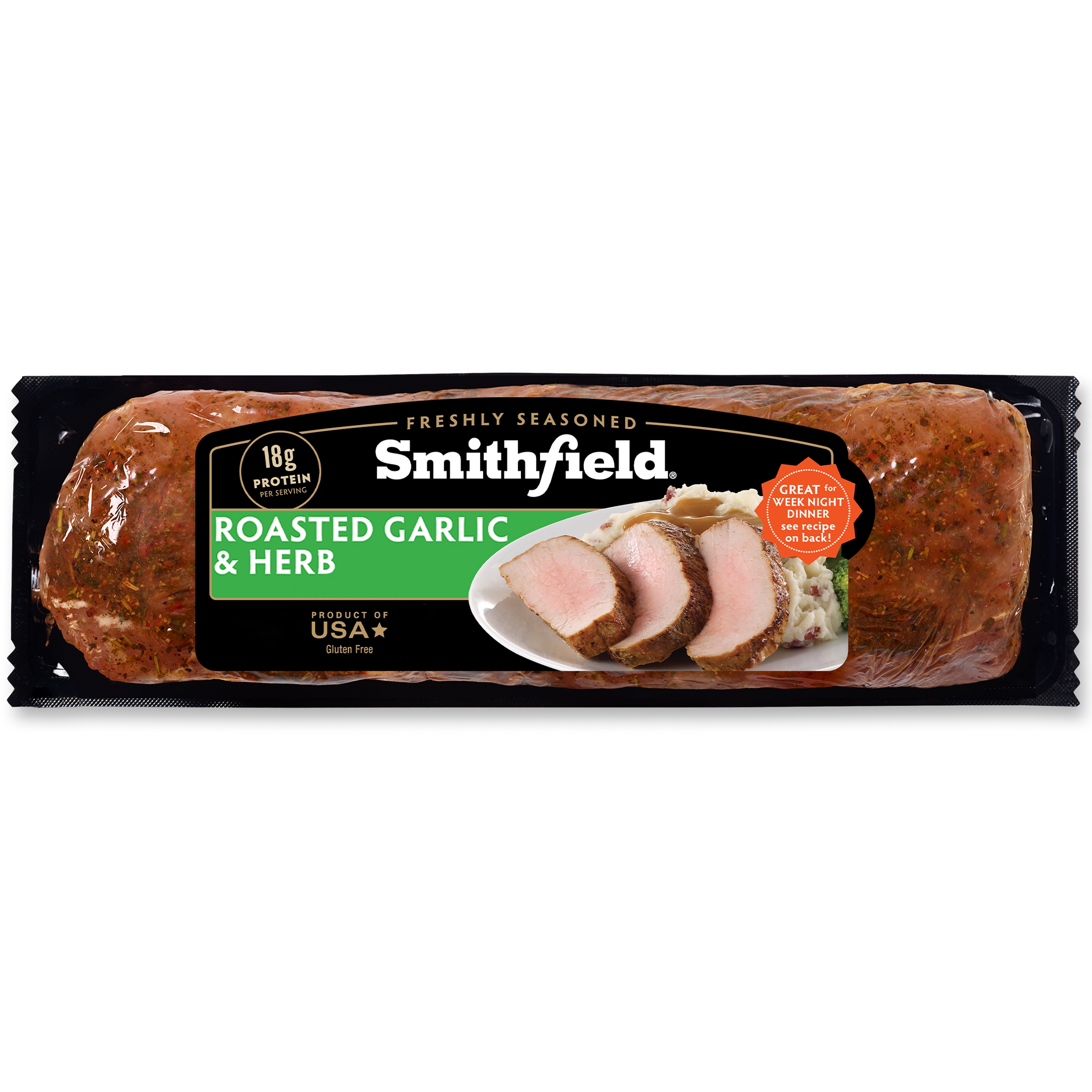Smithfield Roasted Garlic and Herb Fresh Pork Loin Filet delivers irresistibly fresh and savory pork flavor in every bite. Each pork loin filet is specially marinated to add juicy flavor and extra tenderness right out of the package. This Smithfield pork loin filet is dry rubbed with a blend of savory seasonings and roasted garlic for mouthwatering flavor. With no artificial ingredients, this gluten free pork is easy to cook in the oven or on the grill, for a tasty meal you can trust. Bring the family together and choose Smithfield Roasted Garlic and Herb Fresh Pork Filet for a high-quality dinnertime meal.