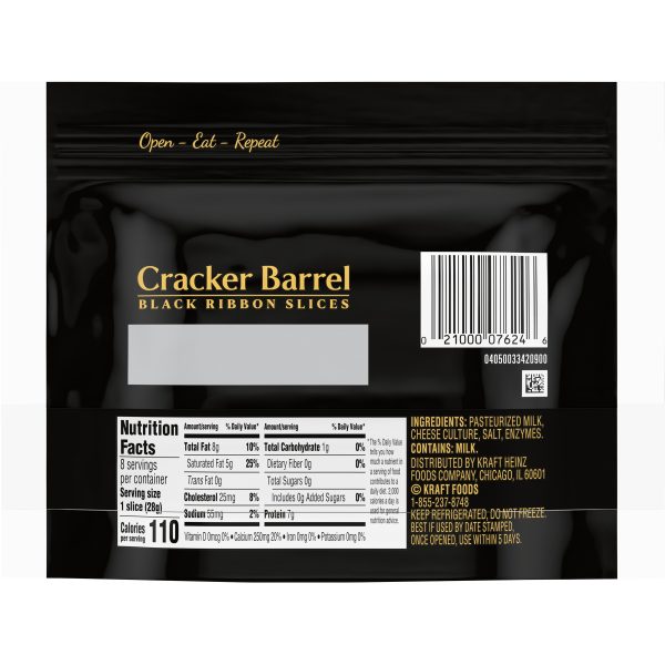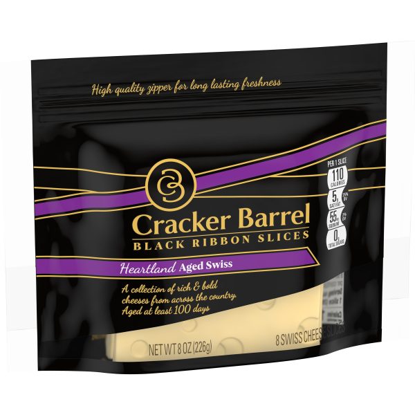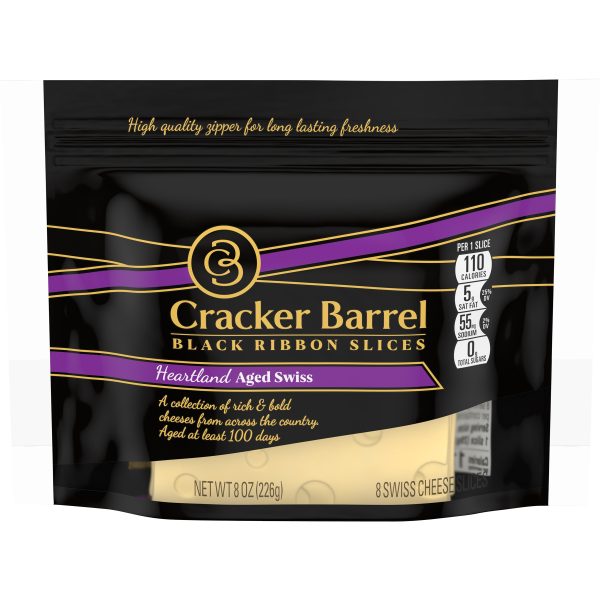 Cracker Barrel Black Ribbon Natural Slices Heartland Aged Swiss Cheese Slices are part of our collection of rich and bold cheeses sourced from different regions of the US. These Cracker Barrel Aged Swiss Cheese Slices offer that nutty yet slightly sweet taste you love. Cracker Barrel Wisconsin Mozzarella has a rich and bold taste to enhance all your deli sandwiches. The deliciously distinct taste of Cracker Barrel cheese provides that balanced flavor that’s perfect for topping hamburgers. These aged Swiss slices add that little extra flavor at lunchtime and pair well with crackers on a cheese platter. One 8 ounce package of Cracker Barrel Swiss Cheese Slices comes with 8 thick fresh cut cheese slices, while the Zip-Pak seal on every package makes for easy storage and helps lock in flavor.