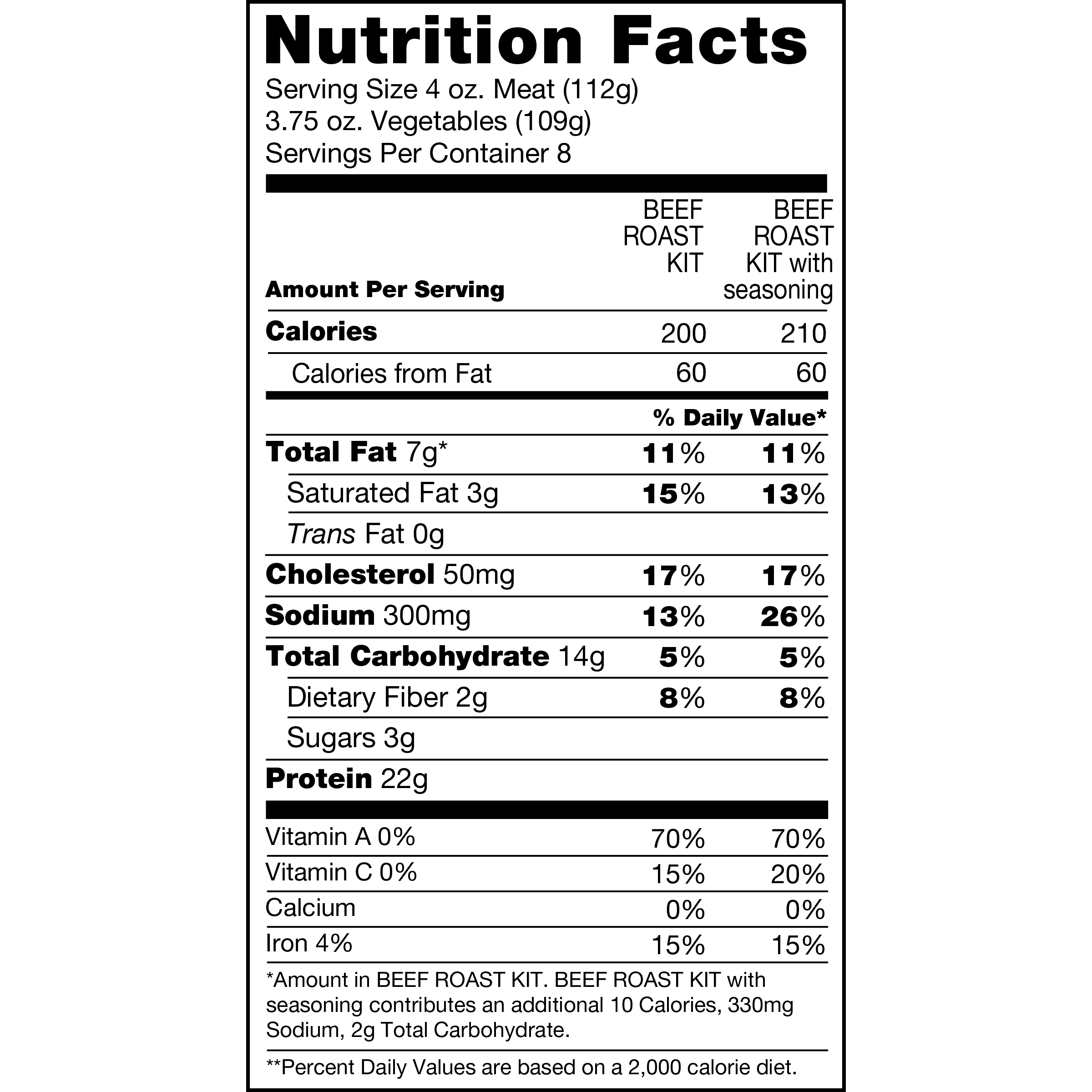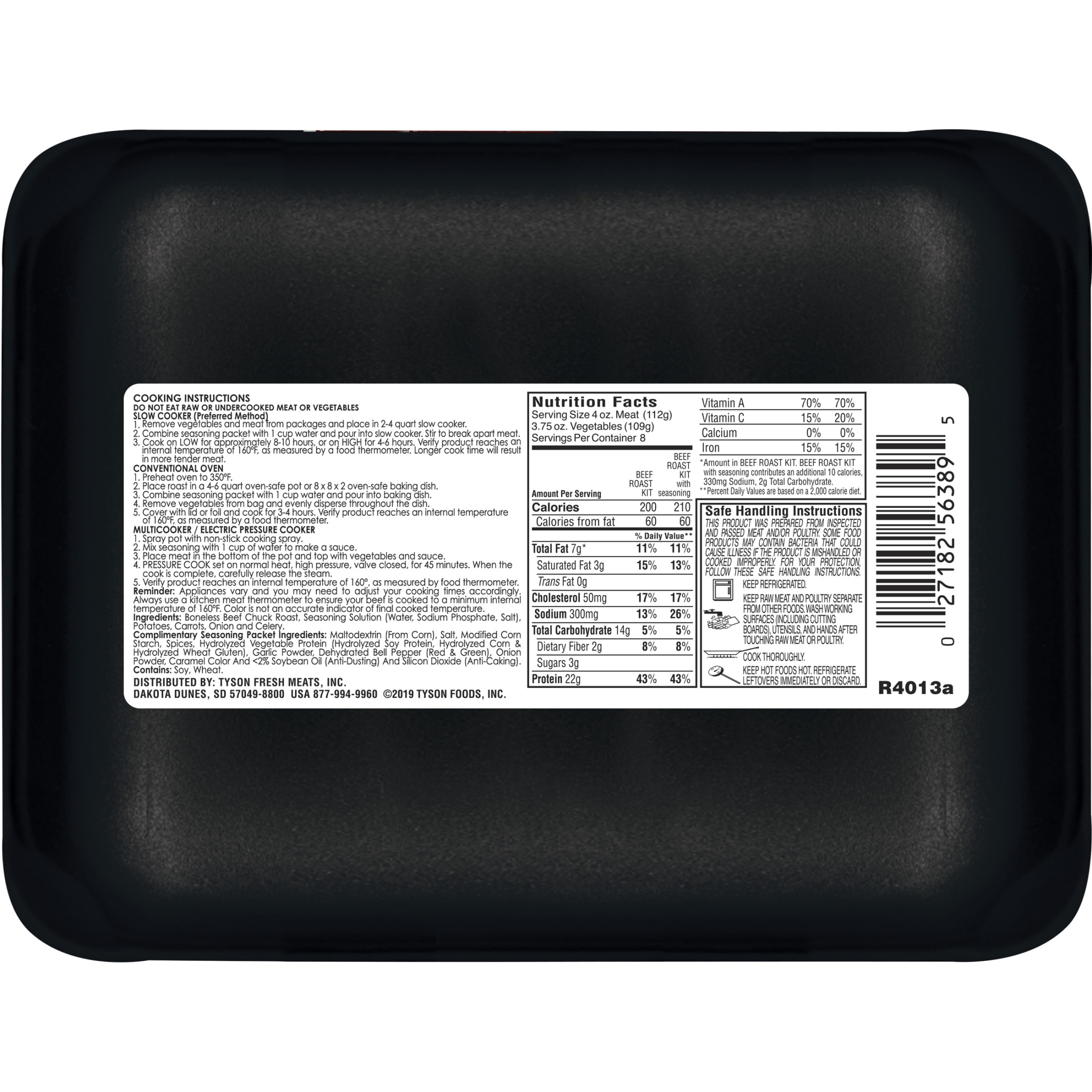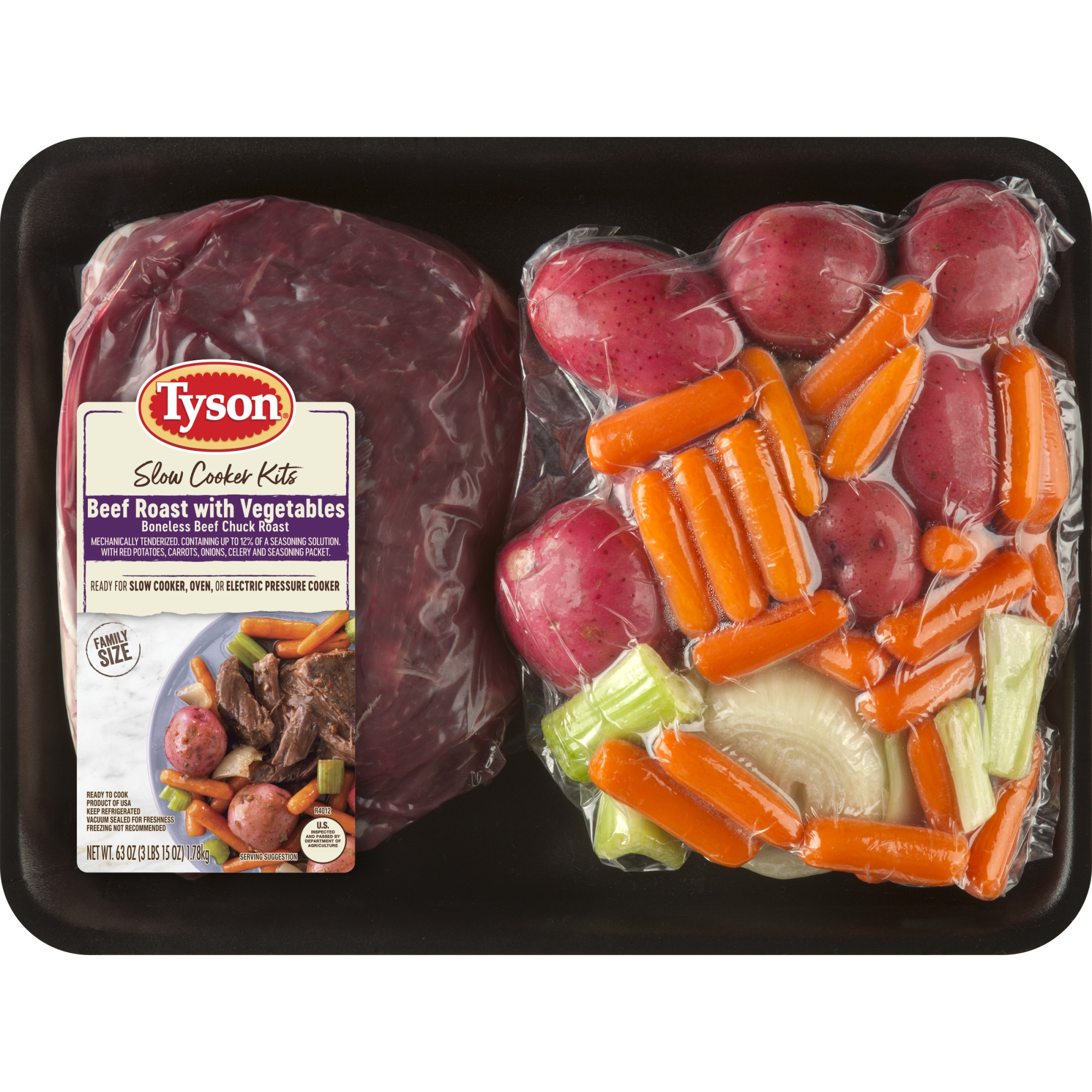 Try something new for dinner this week with a Tyson Ready for Slow Cooker Beef Roast with Vegetables Meal Kit. Each package includes a hearty chuck roast, potatoes, carrots and onions for a family sized meal that is perfect for crock pot roast beef or oven baked pot roast. Our roasting beef is an excellent source of protein, vitamin B6, vitamin B12, zinc, niacin and selenium, as well as a good source of phosphorous, riboflavin and iron. All 9 essential nutrients are naturally found in beef and are a flavorful way to give your body nutrients to help power through the day. Ready in just 3 easy steps, our meal kits make family dinners convenient and delicious. Simply cook and serve for a savory weeknight pot roast meal. Includes one fresh meat meal kit.