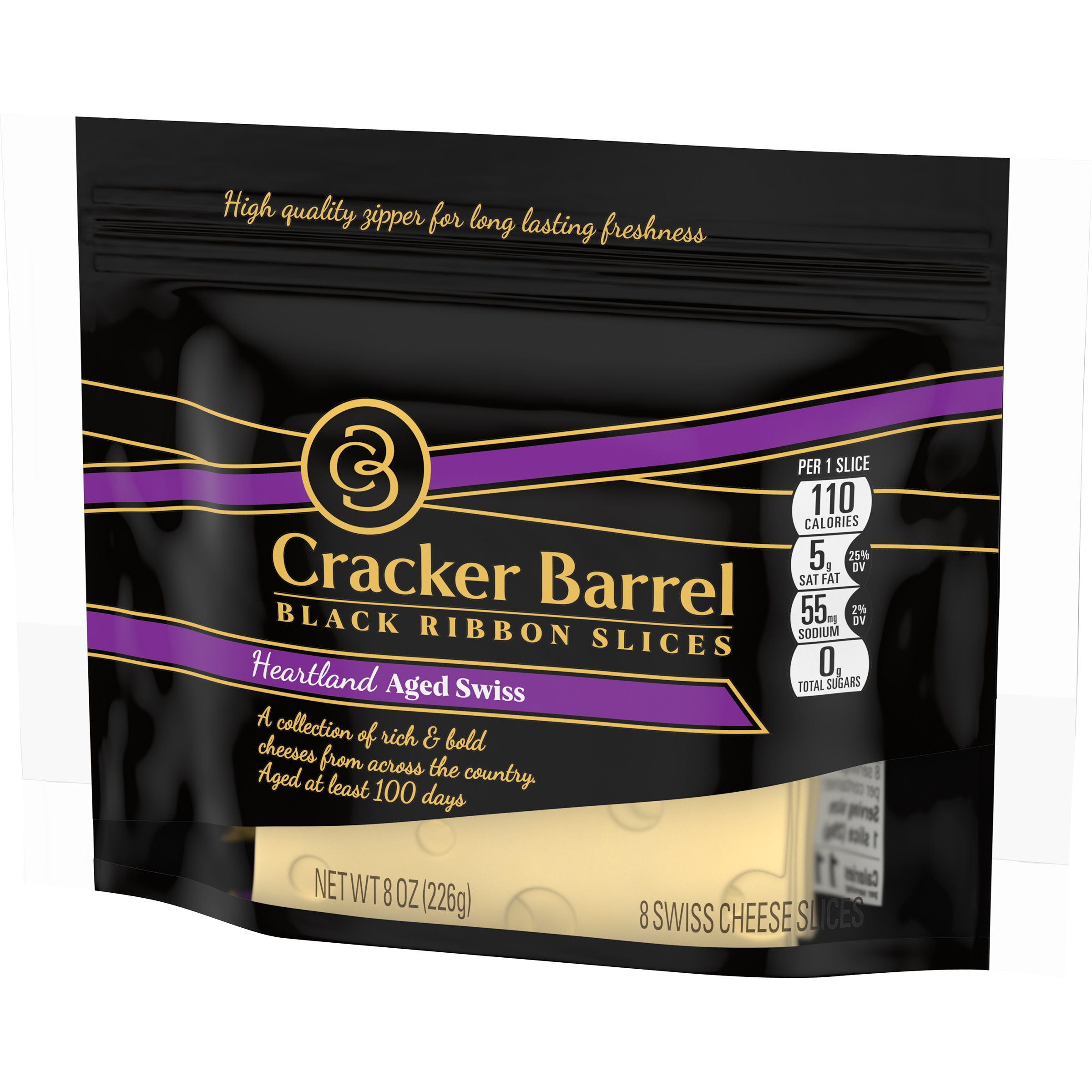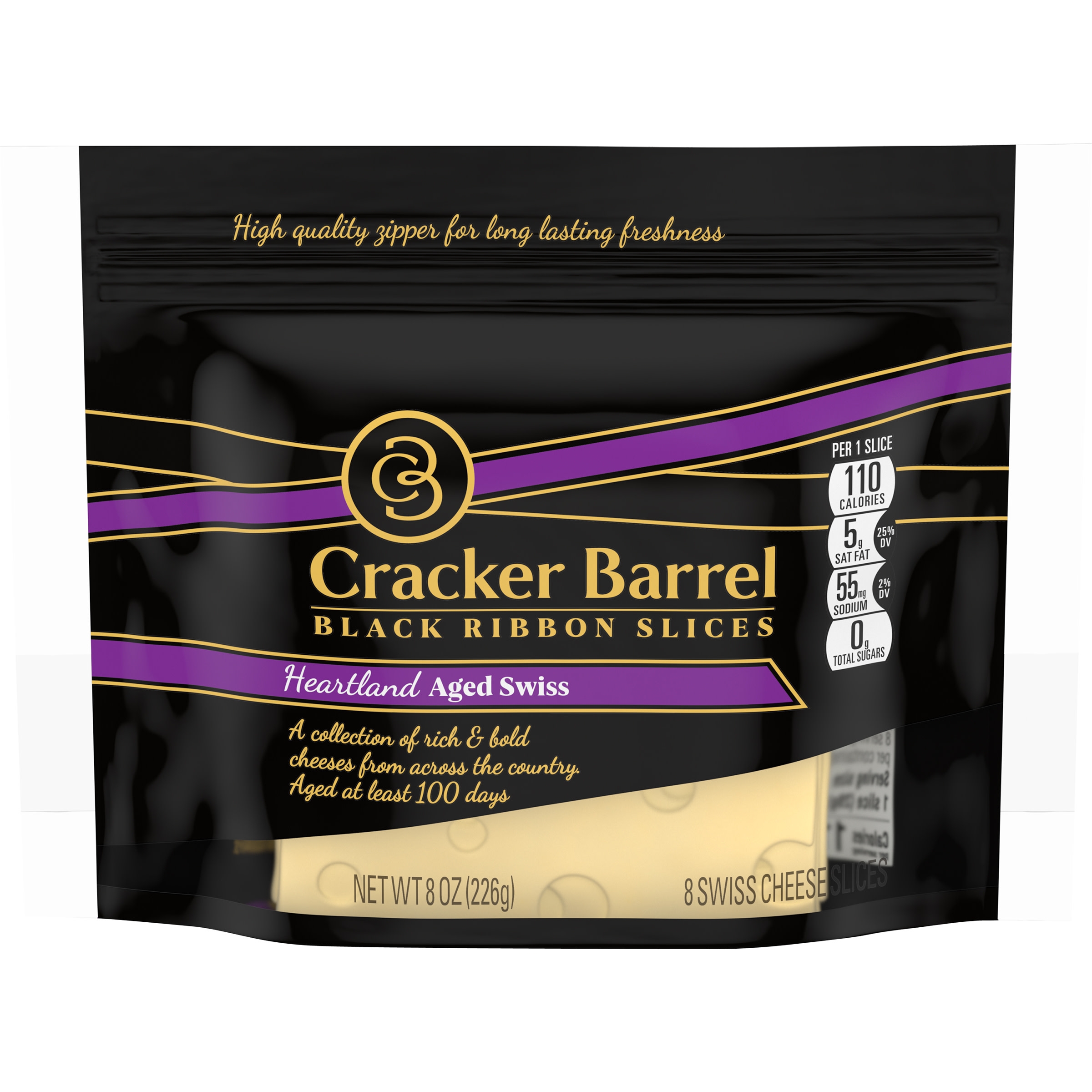 Cracker Barrel Black Ribbon Natural Slices Heartland Aged Swiss Cheese Slices are part of our collection of rich and bold cheeses sourced from different regions of the US. These Cracker Barrel Aged Swiss Cheese Slices offer that nutty yet slightly sweet taste you love. Cracker Barrel Wisconsin Mozzarella has a rich and bold taste to enhance all your deli sandwiches. The deliciously distinct taste of Cracker Barrel cheese provides that balanced flavor that’s perfect for topping hamburgers. These aged Swiss slices add that little extra flavor at lunchtime and pair well with crackers on a cheese platter. One 8 ounce package of Cracker Barrel Swiss Cheese Slices comes with 8 thick fresh cut cheese slices, while the Zip-Pak seal on every package makes for easy storage and helps lock in flavor.