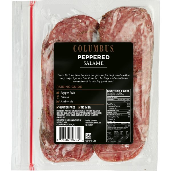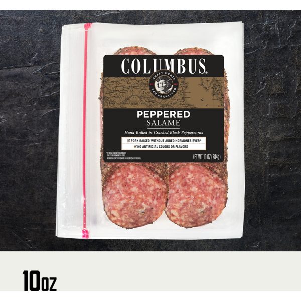 COLUMBUS Sliced Peppered Salame is our Italian Dry rolled in just the right amount of freshly cracked black peppercorns to give it a spicy bite followed by the true flavor of our original Salami. It is carefully slow aged to perfect its taste. Can be eaten alone as a snack, in a sandwich, salad or used for charcuterie boards. Pairs well with sharp cheddar, provolone, pepper jack or mahon cheeses. Enjoy it with a glass of pinot noir, Barolo, amber beer or pilsner. Pair the salami with accoutrements like roasted red peppers, hummus, peppadews or Spanish olives for the ultimate charcuterie experience. All trademarks, logos and images are owned by Hormel Foods Corporation, its subsidiaries and affiliates. Copyright Columbus Manufacturing, Inc.
