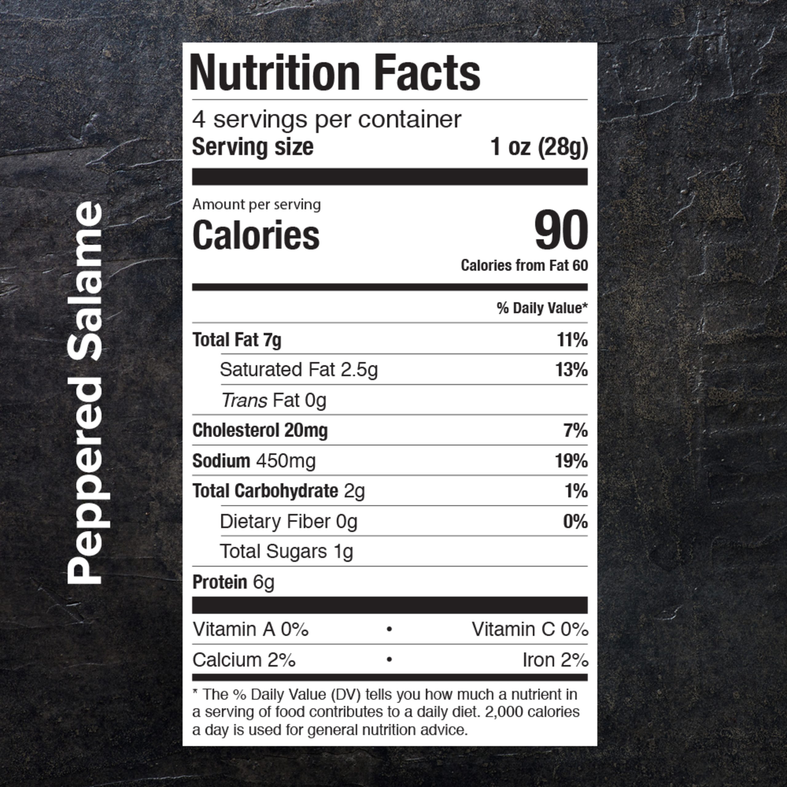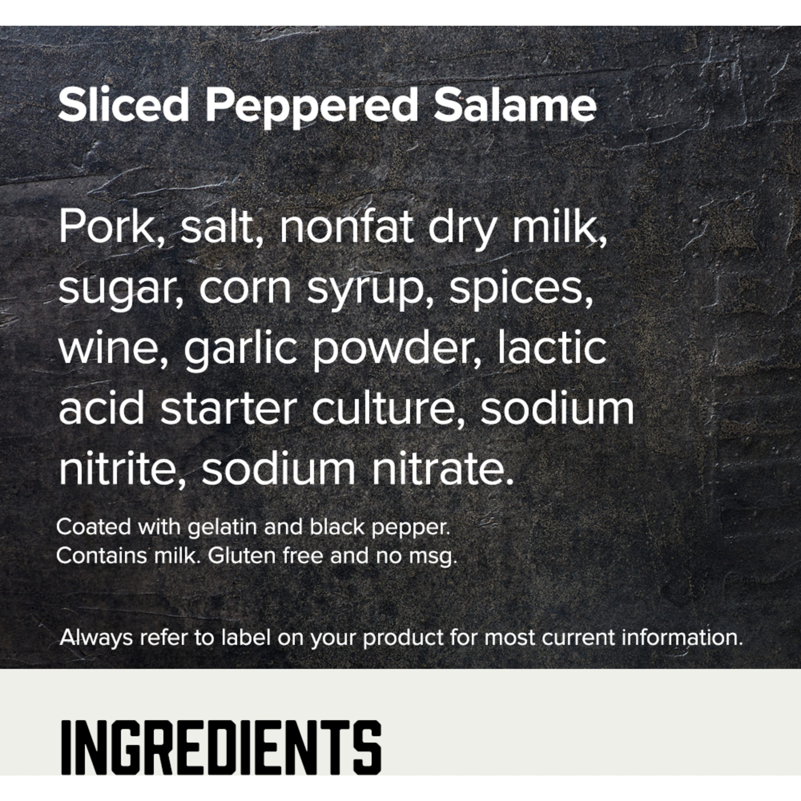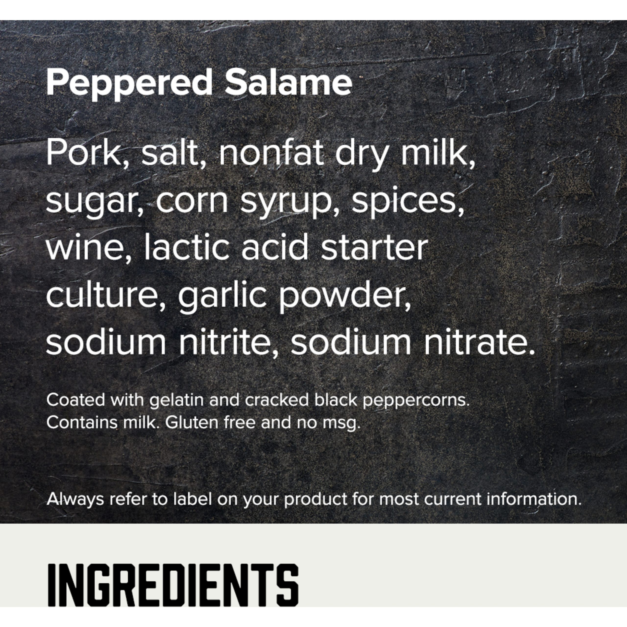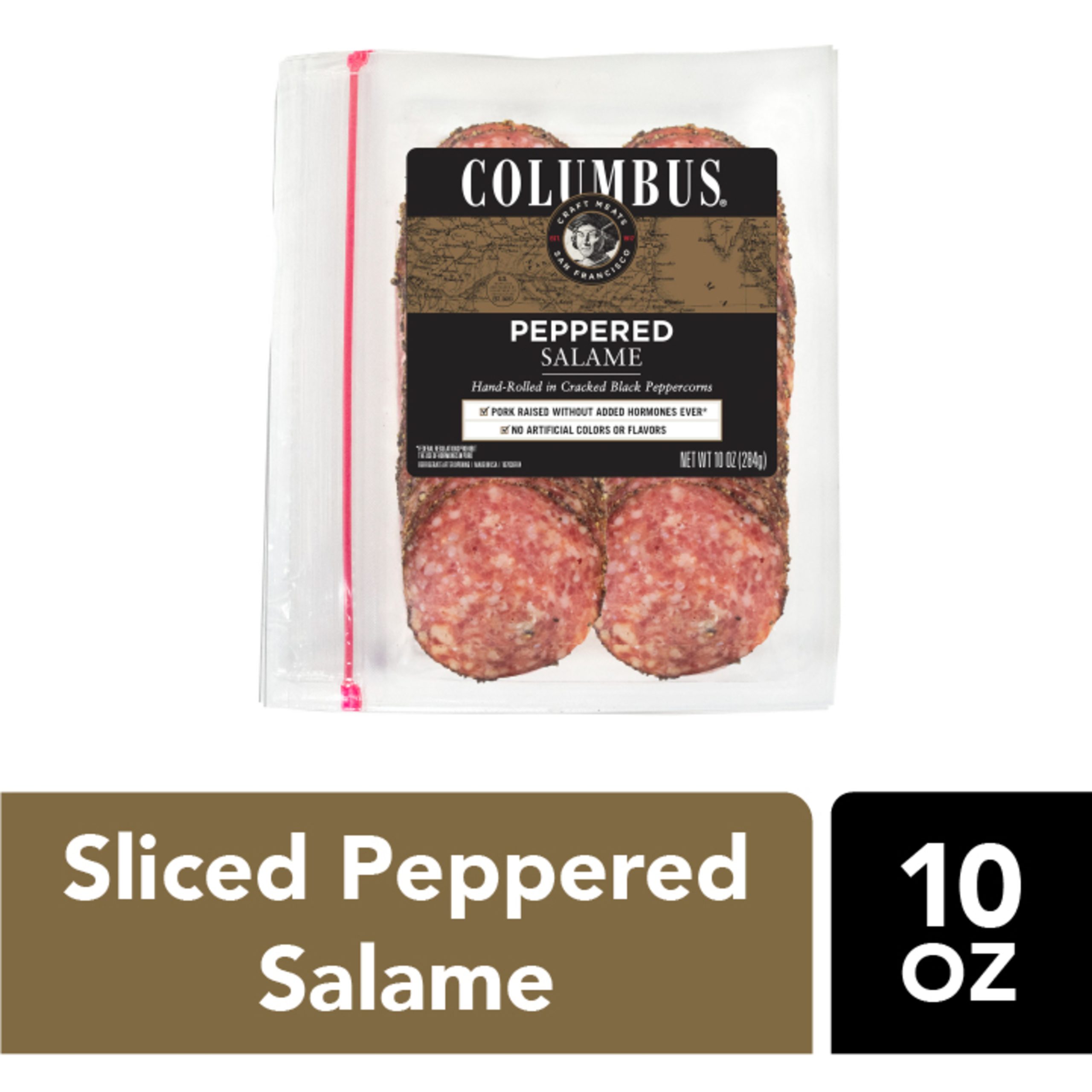 COLUMBUS Sliced Peppered Salame is our Italian Dry rolled in just the right amount of freshly cracked black peppercorns to give it a spicy bite followed by the true flavor of our original Salami. It is carefully slow aged to perfect its taste. Can be eaten alone as a snack, in a sandwich, salad or used for charcuterie boards. Pairs well with sharp cheddar, provolone, pepper jack or mahon cheeses. Enjoy it with a glass of pinot noir, Barolo, amber beer or pilsner. Pair the salami with accoutrements like roasted red peppers, hummus, peppadews or Spanish olives for the ultimate charcuterie experience. All trademarks, logos and images are owned by Hormel Foods Corporation, its subsidiaries and affiliates. Copyright Columbus Manufacturing, Inc.
