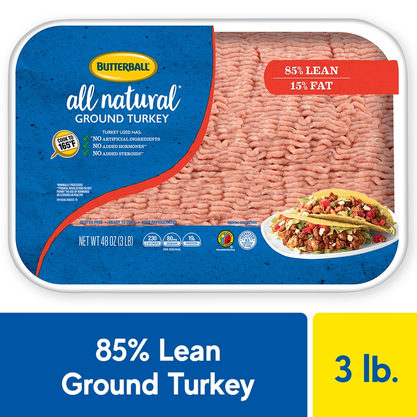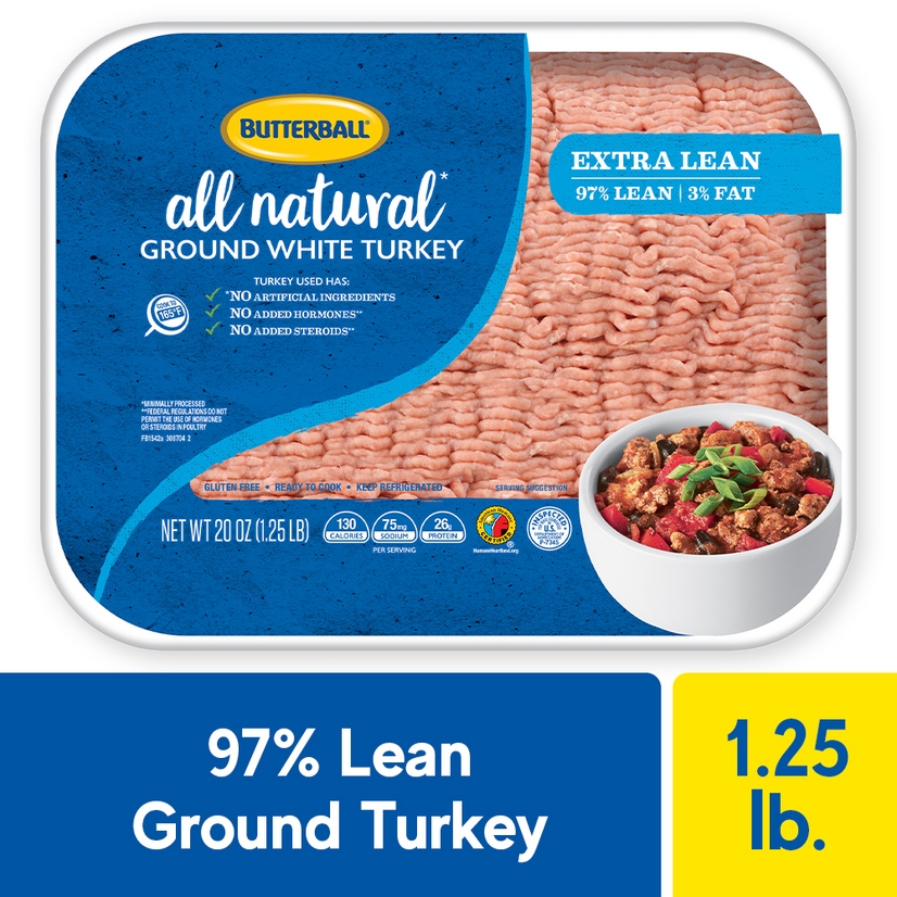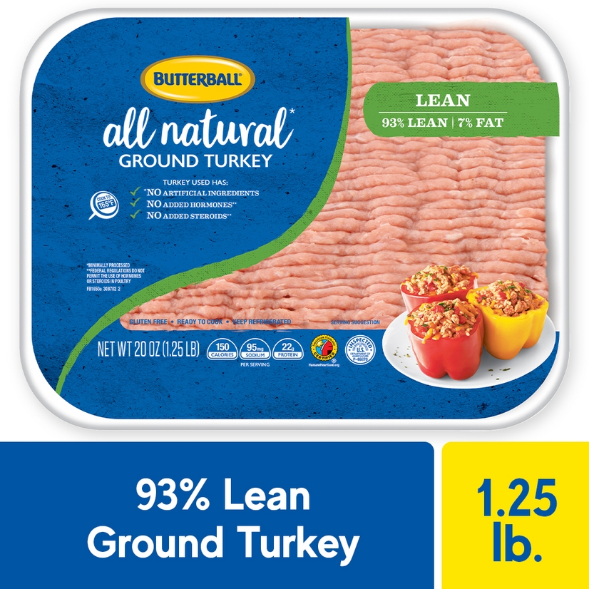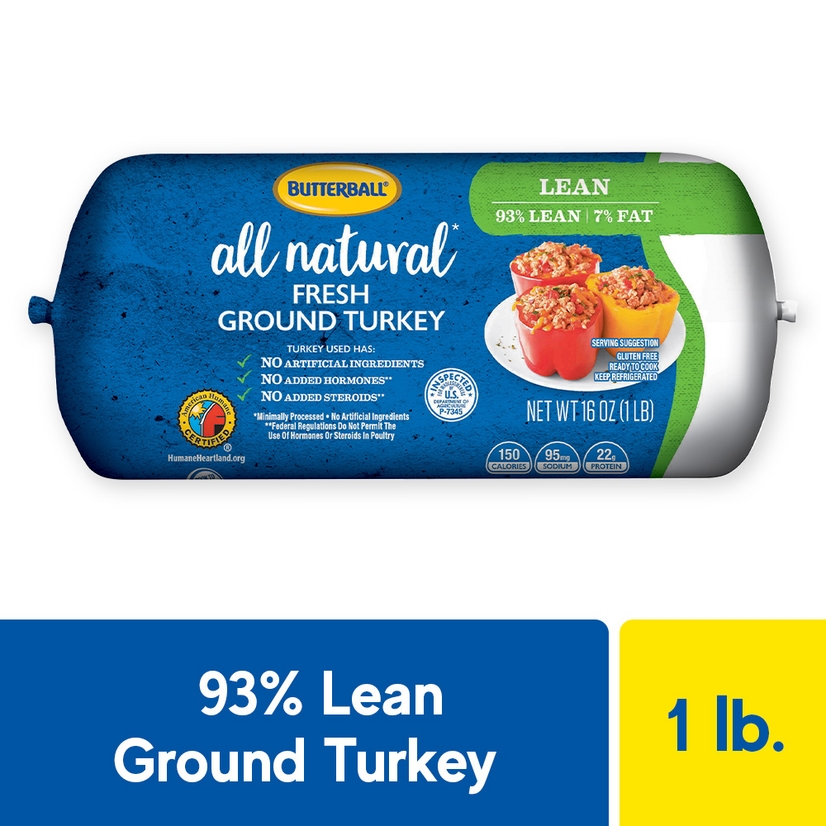 Always tender and juicy, All Natural Butterball ground turkey is minimally processed and has no artificial ingredients, hormones or steroids. Use lean Butterball turkey meat as the star of your favorite recipe for a low-fat, gluten-free choice. Family dinner, party appetizers or lunch from the grill, you can enjoy fresh Butterball turkey all year long.