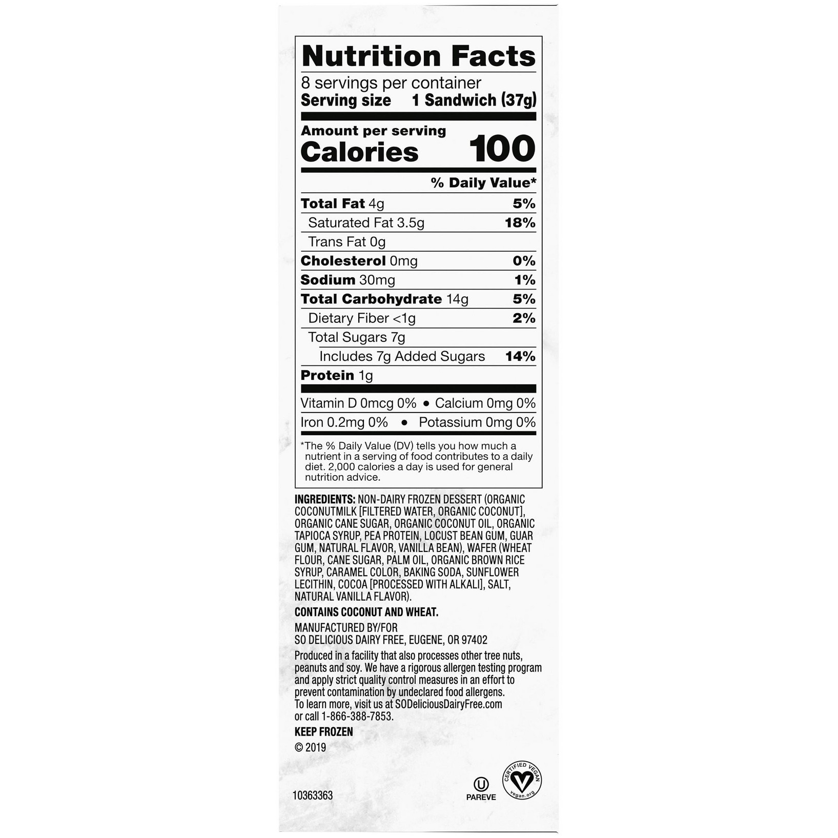 u0026bull;Dairy-free frozen dessert sandwichu003cbru003eu0026bull;Vanilla bean flavoru003cbru003eu0026bull;Made with coconutmilku003cbru003eu0026bull;100 calories per servingu003cbru003eu0026bull;Certified veganu003cbru003eu0026bull;Non-GMO Project Verified