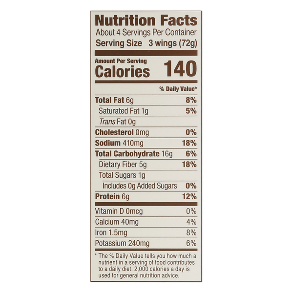 A delicious meat-free addition to any diet, MorningStar Farms Buffalo Wings are spicy and buffalo seasoned with a crispy, crunchy breading outside and tender inside. With 56% less fat than regular chicken wings*, these veggie wings provide a good source of protein (13 grams per serving; 17% of daily value) and a good source of fiber (contains 8 grams total fat per serving). Stock this convenient resealable bag in the freezer for an exciting anytime meal you can pair with your favorite dips, celery, or serve in a wrap. Whether you’re looking for a winning snack to share with friends on game night, or just a quick and convenient lunch or dinner, MorningStar Farms Buffalo Wings are a delicious choice sure to please meat-lovers and vegetarians alike. *Regular breaded and fried chicken wings with skin contain 19 grams total fat per serving (85 grams); MorningStar Farms Buffalo Wings contain 8 grams total fat per serving (85 grams).
