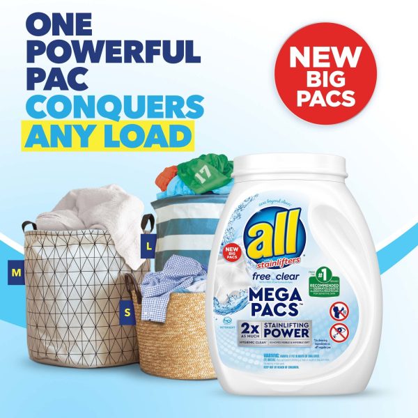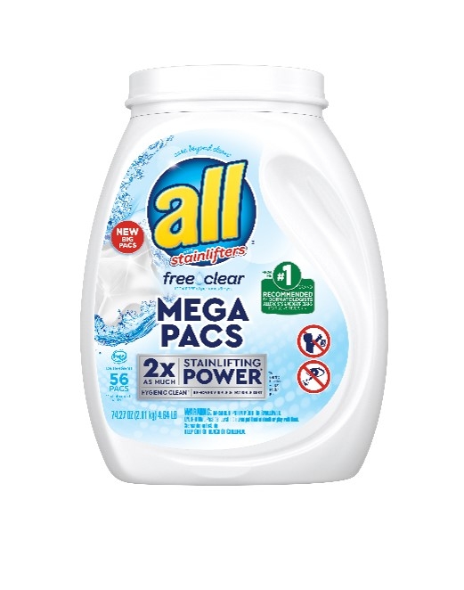 all free clear mighty pacs are 100% free of perfumes and dyes with concentrated cleaning power in a convenient pac. all free clear is the #1 recommended detergent brand by dermatologists, allergists and pediatricians for sensitive skin. These hypoallergenic mighty pacs are Tough on Stains, Gentle on Skin. Use with all free clear fabric softener and dryer sheets for clean and soft clothes with static cling reduction in the dryer. all free and clear mighty pacs are unscented, fragrance free, and are safe to use in any washing machine including high efficiency (HE) and they dissolve completely even in cold water. Add pac(s) to washing machine drum before adding clothes. Use 1 pac for small and medium loads or 2 pacs for larger loads then wash as usual. all mighty pacs are safe for septic systems and contain no phosphates. This package contains one all Mighty Pacs Laundry Detergent Mega Pacs, enough for 30 wash loads.