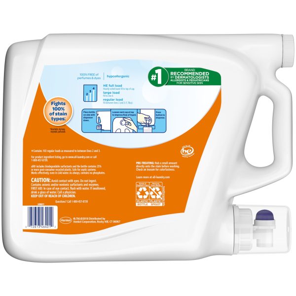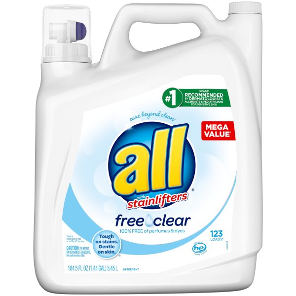 When it comes to laundry care for sensitive skin, all Liquid Laundry Detergent is the obvious choice. This all hypoallergenic laundry detergent is the #1 recommended detergent brand by dermatologists, allergists and pediatricians for sensitive skin. 100% free of perfumes and dyes, all free clear is hypoallergenic and gentle on sensitive skin. Use with all free and clear fabric softener and dryer sheets for clean and soft clothes with static cling reduction in the dryer. This unscented, fragrance free detergent is safe to use in any washing machine including high efficiency (HE) and at any water temperature. All free and clear is also available in convenient mighty pacs. This package includes one 184.5-fluid-ounce bottle of all free clear liquid laundry detergent, enough for 123 loads. Medium Load, fill slightly below halfway. Large load, fill to top of cap. Pre-Treating: Rub a small amount directly onto the stain before washing. Check an inseam for colorfastness.