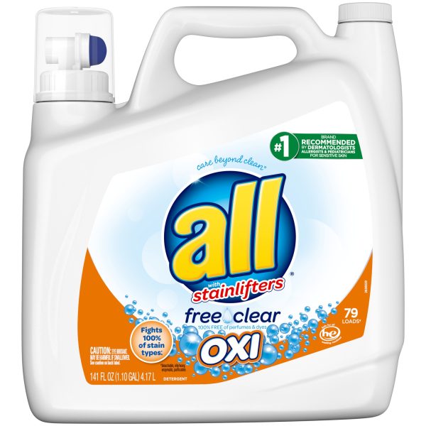 When it comes to laundry care for sensitive skin, all Liquid Laundry Detergent with OXI stain removers and whiteners is the obvious choice. Full of concentrated cleaning power with OXI for whitening & brightening. From the #1 detergent brand recommended by dermatologists, allergists, and pediatricians – all Free Clear Oxi is Tough on Stains, Gentle on Skin. 100% dye-free and fragrance-free, this hypoallergenic laundry detergent is gentle on sensitive skin. Safe to use in any washing machine and at any water temperature, including cold water. Use with all Free Clear fabric softener and all Free Clear dryer sheets for clean and soft clothes with static cling reduction in the dryer. This package includes one 141-ounce bottle of all Free Clear Oxi liquid laundry detergent, enough for 79 loads.