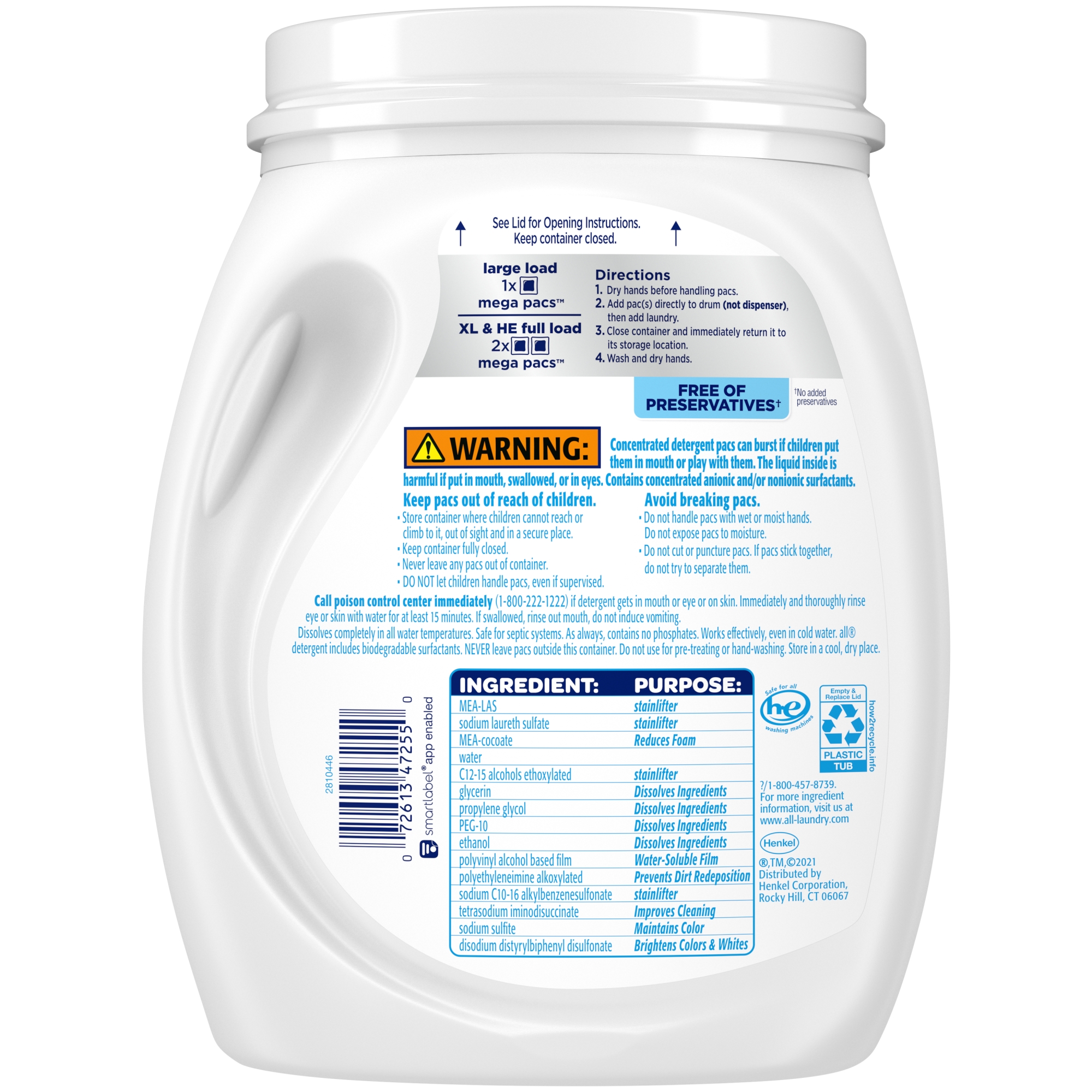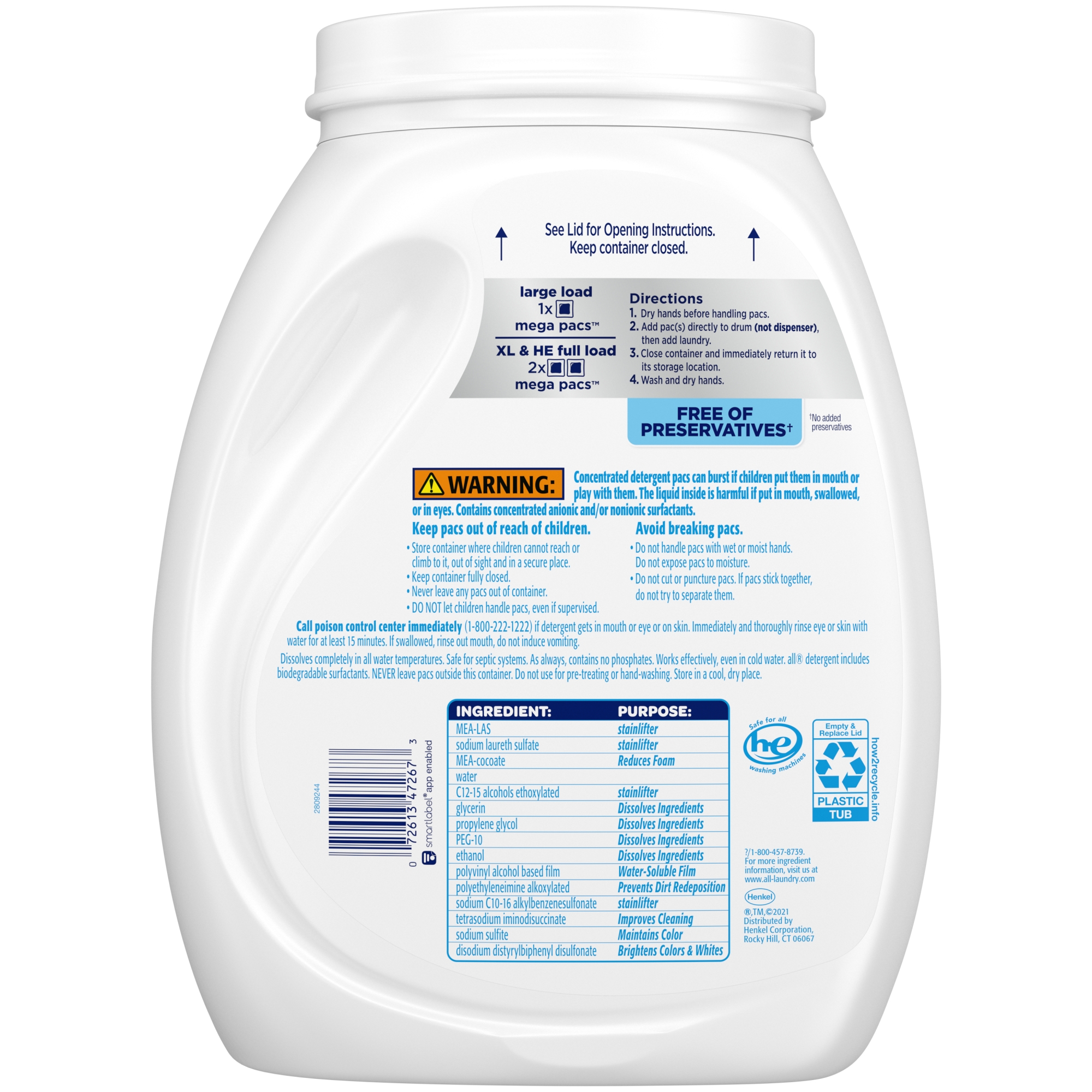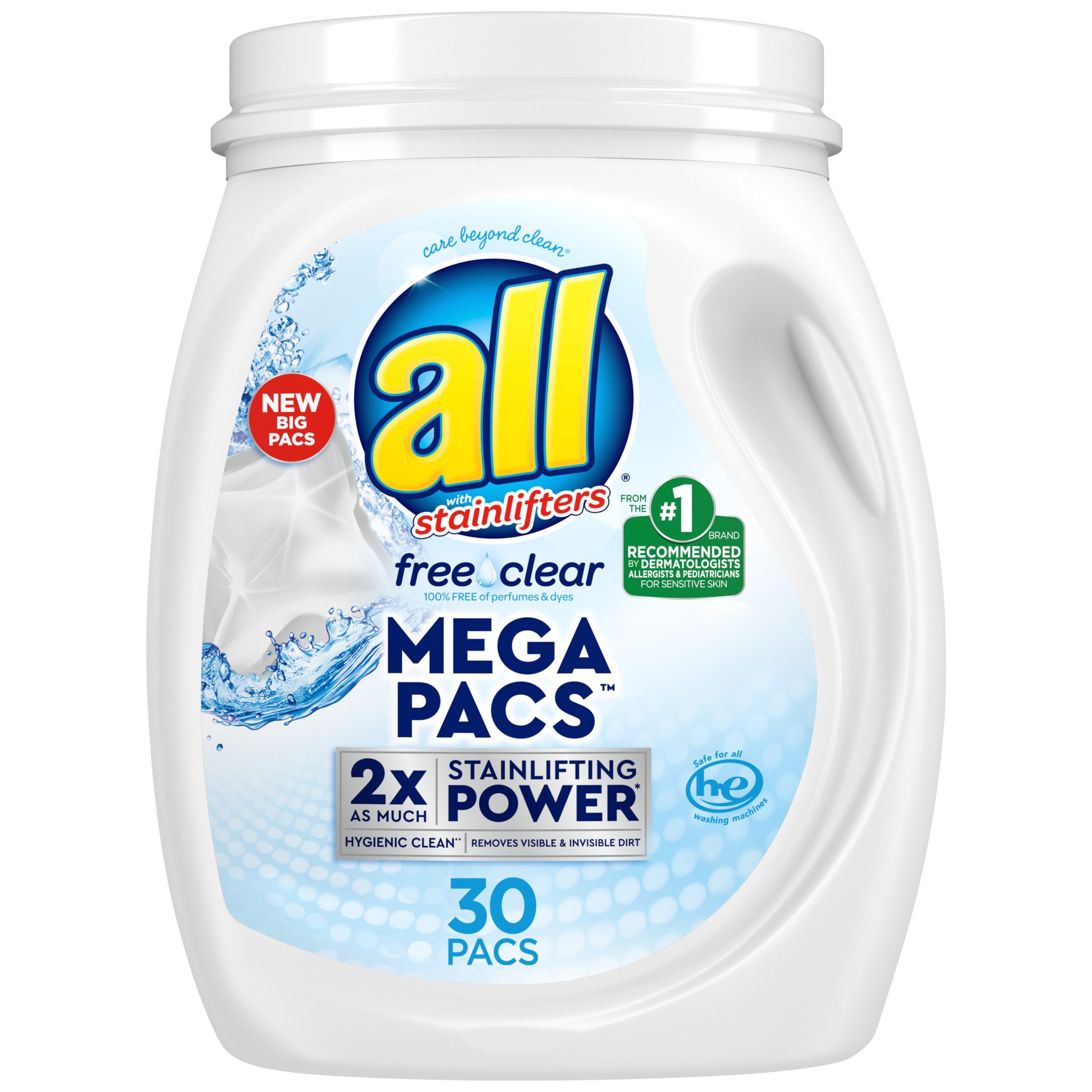 all Mega Laundry Detergent Pacs, Free Clear for Sensitive Skin, Unscented and Dye Free, 30 Count