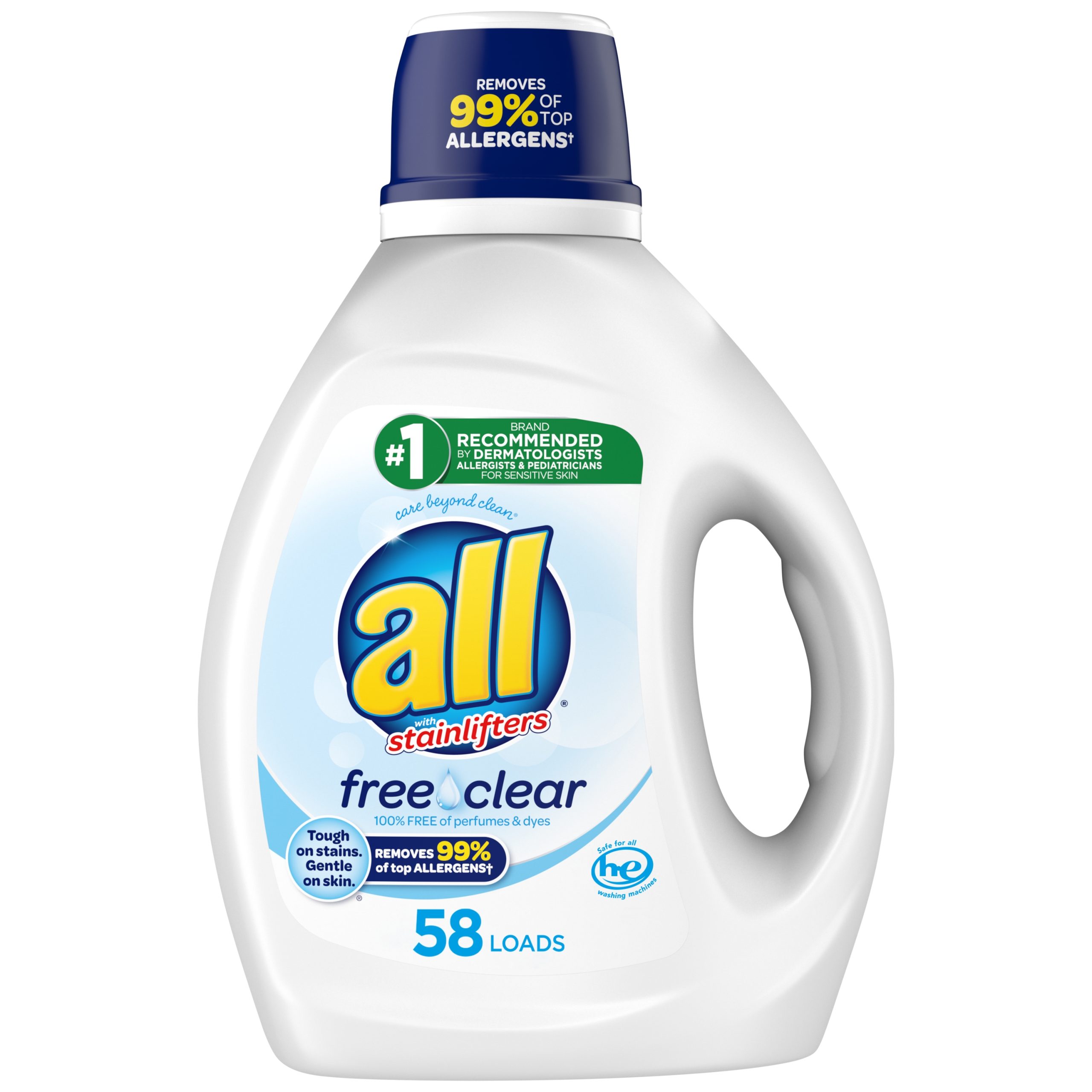 When it comes to laundry care for sensitive skin, all Liquid Laundry Detergent is the obvious choice. This hypoallergenic laundry detergent is the #1 recommended detergent brand by dermatologists, allergists and pediatricians for sensitive skin. 100% free of perfumes and dyes, all free clear is hypoallergenic and gentle on sensitive skin. Use with all free and clear fabric softener and dryer sheets for clean and soft clothes with static cling reduction in the dryer. Directions: Medium Load, fill slightly below halfway. Large load, fill to top of cap. Pre-Treating: Rub a small amount directly onto the stain before washing. Check an inseam for colorfastness. This unscented, fragrance free detergent is safe to use in any washing machine including high efficiency (HE) and at any water temperature. All free and clear is also available in convenient mighty pacs. This package includes one 141-fluid-ounce bottle of all free clear liquid laundry detergent, enough for 94 loads.