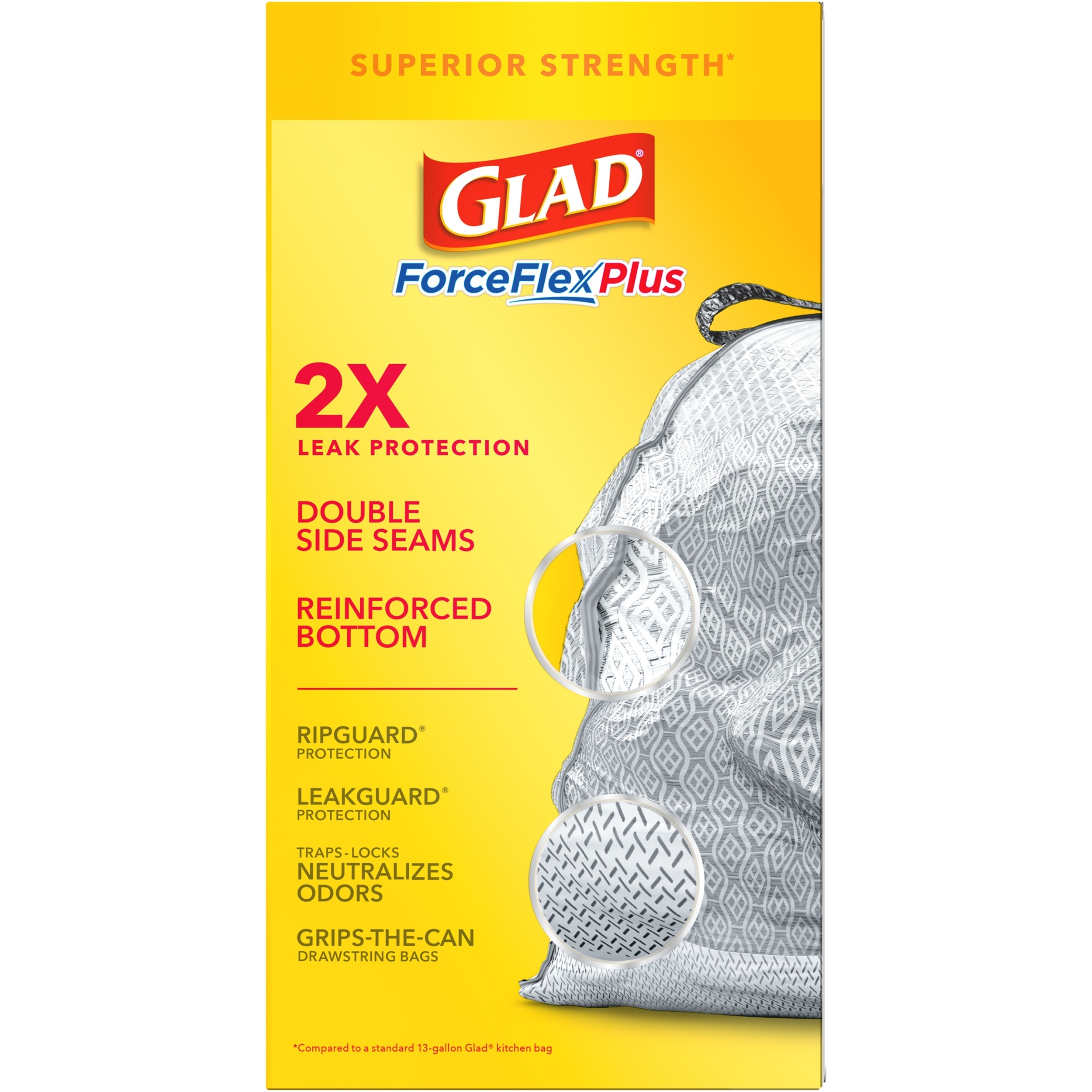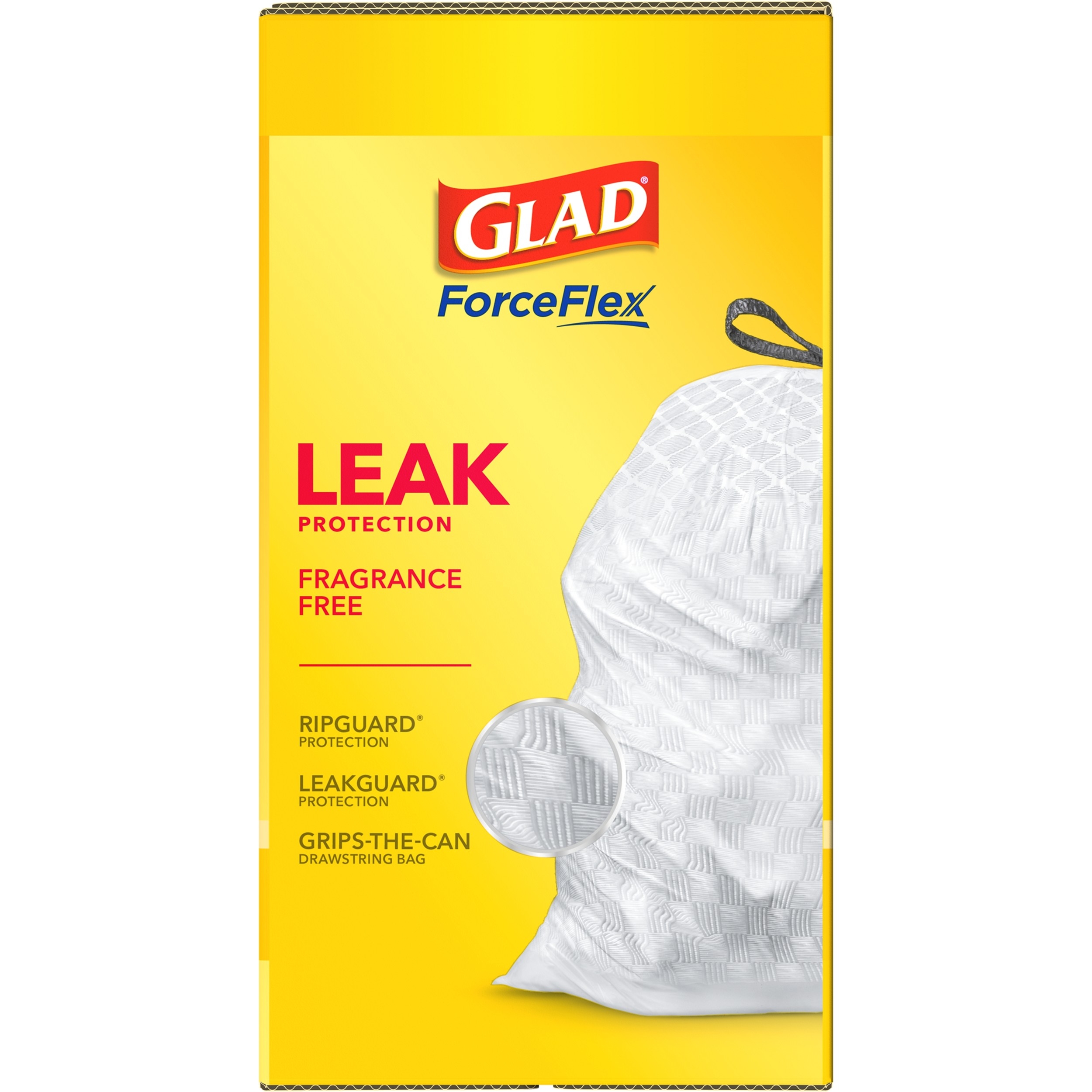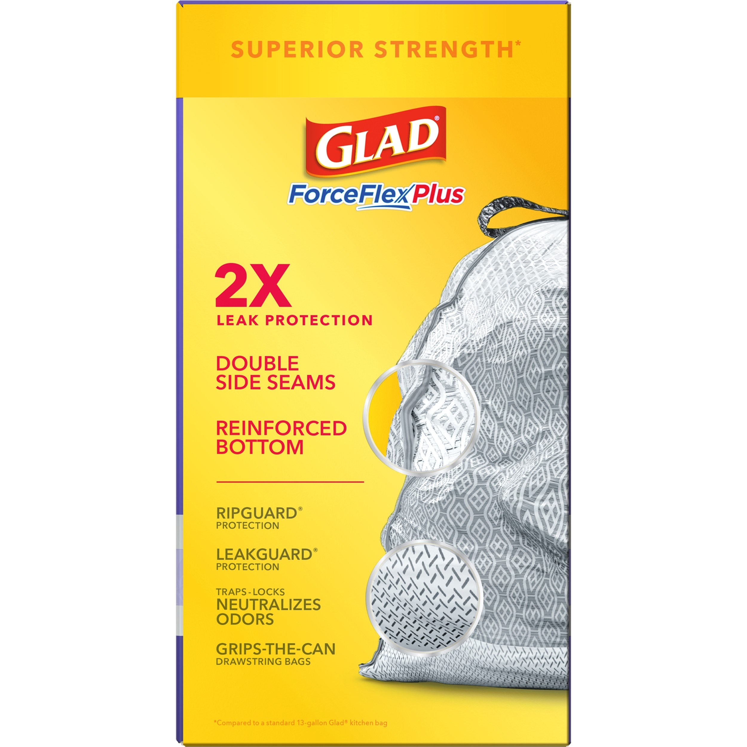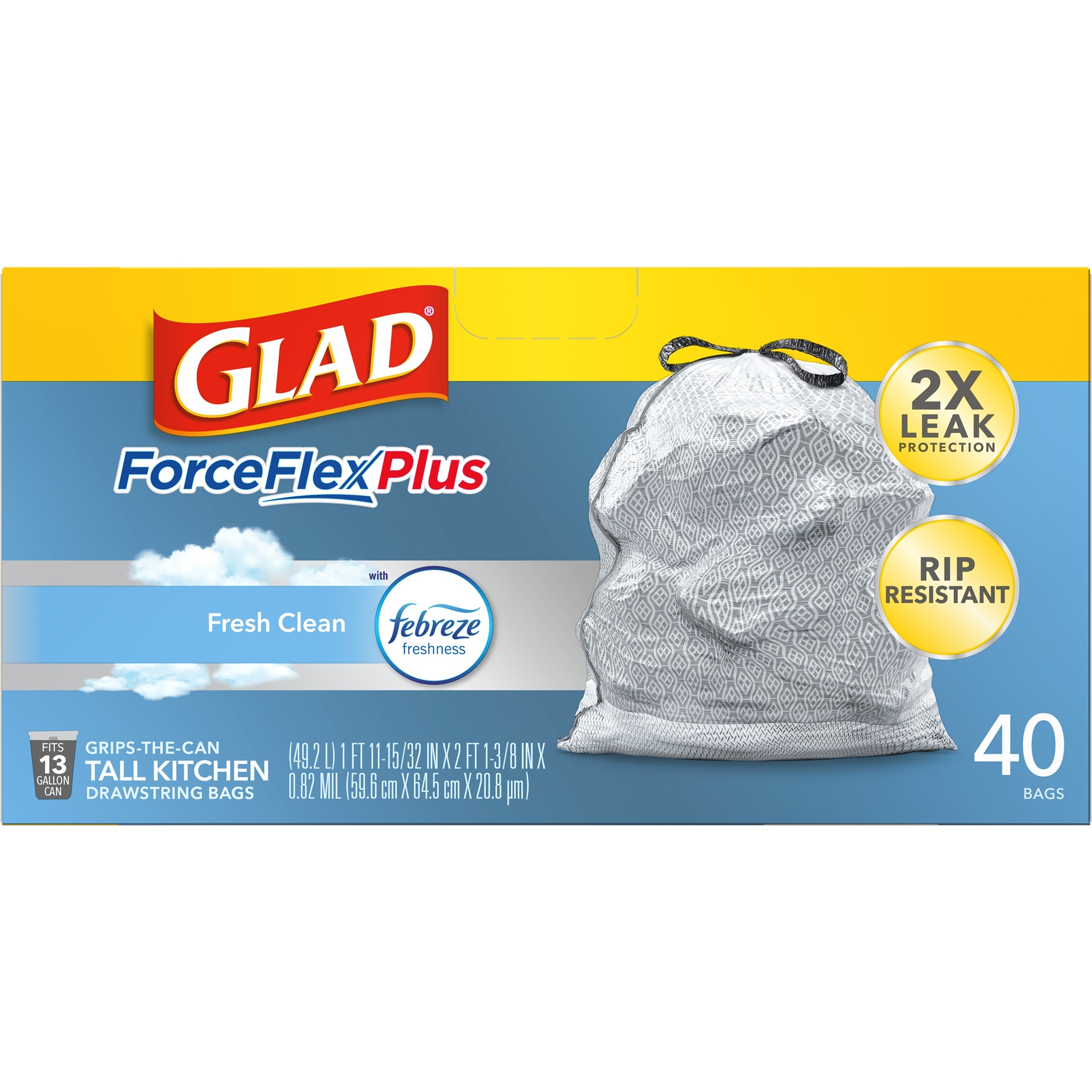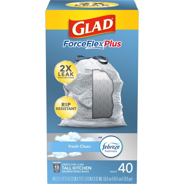 Glad ForceFlexPlus Tall Kitchen Drawstring Trash Bags provide 2X leak protection with double side seams and a reinforced bottom to guard against leaks and trap liquids in the bag. Designed with ForceFlexPlus technology, these trash bags provide two layers of strength and stretch for 2X Leak Protection. Plus, they trap, lock and neutralize odors with lasting Febreze freshness in Fresh Clean scent. What goes in the trash, stays in the trash with Glad, featuring RipGuard and LeakGuard technology. Glads two durable layers handle the most demanding trash, with an outer layer to protect against leaks and a strong inner layer to prevent rips and tears. The Grips-The-Can Drawstring ensures that the bag stays in place, making it easy to close and carry out the trash.