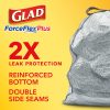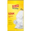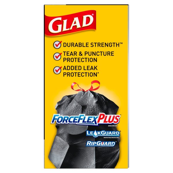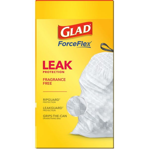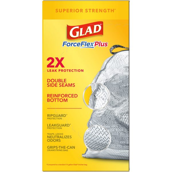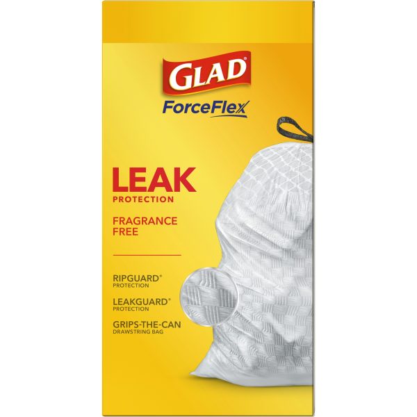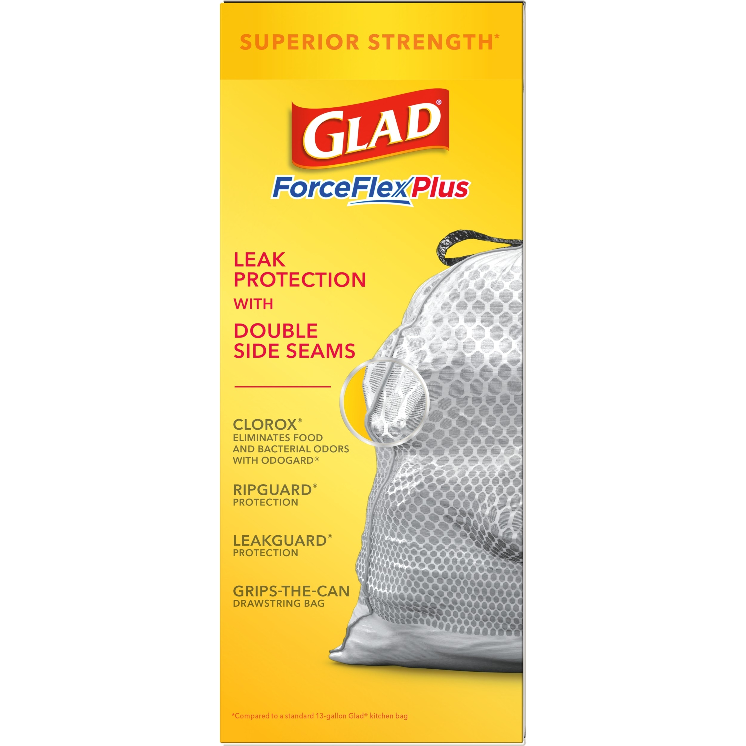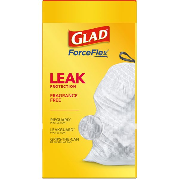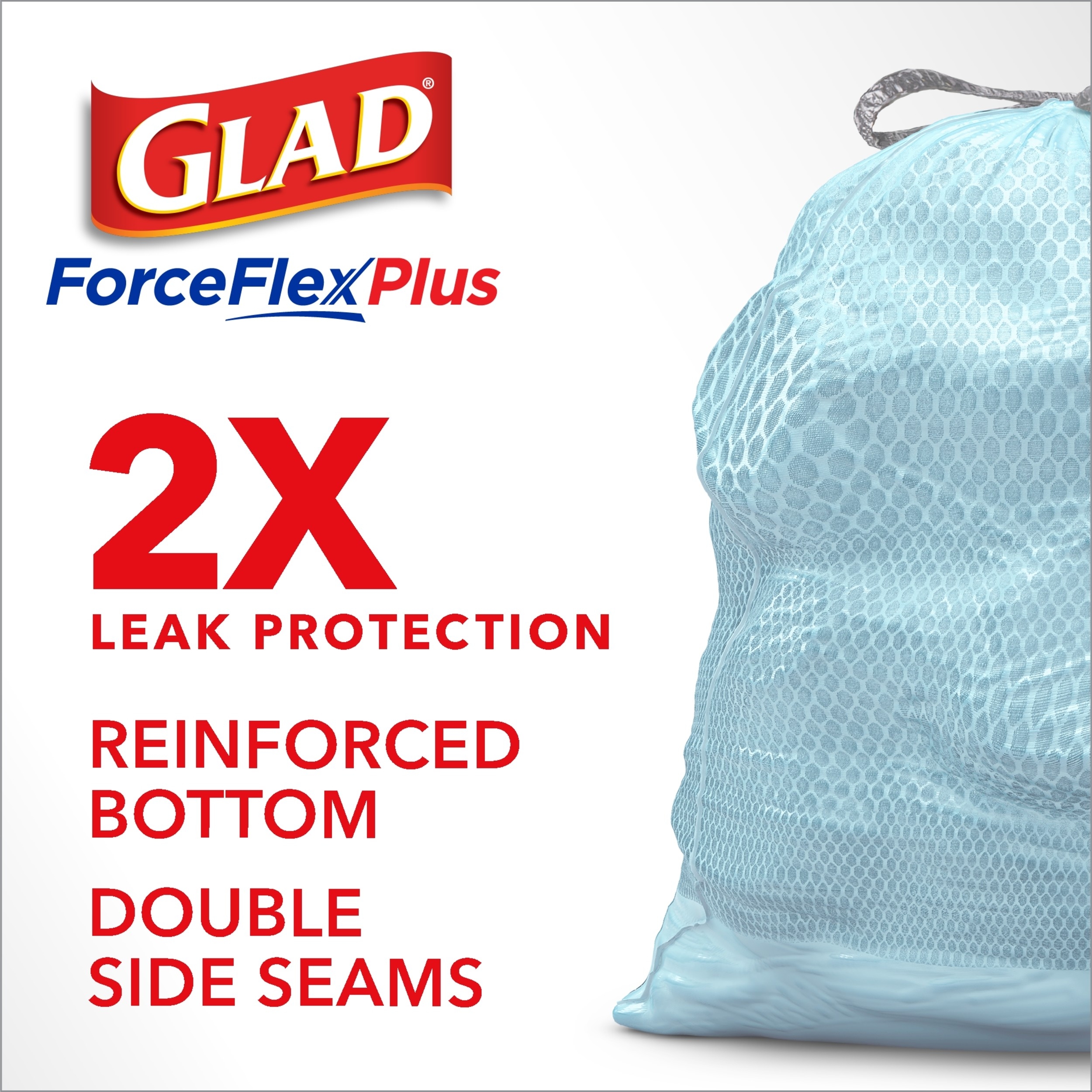 Glad ForceFlexPlus Tall Kitchen Drawstring Trash Bags provide 2X leak protection with double side seams and a reinforced bottom to guard against leaks and trap liquids in the bag. Designed with ForceFlexPlus technology, these trash bags provide two layers of strength and stretch for 2X Leak Protection. Plus, they trap, lock and neutralize odors with lasting Febreze freshness in Fresh Clean scent. What goes in the trash, stays in the trash with Glad, featuring RipGuard and LeakGuard technology. Glads two durable layers handle the most demanding trash, with an outer layer to protect against leaks and a strong inner layer to prevent rips and tears. The Grips-The-Can Drawstring ensures that the bag stays in place, making it easy to close and carry out the trash.