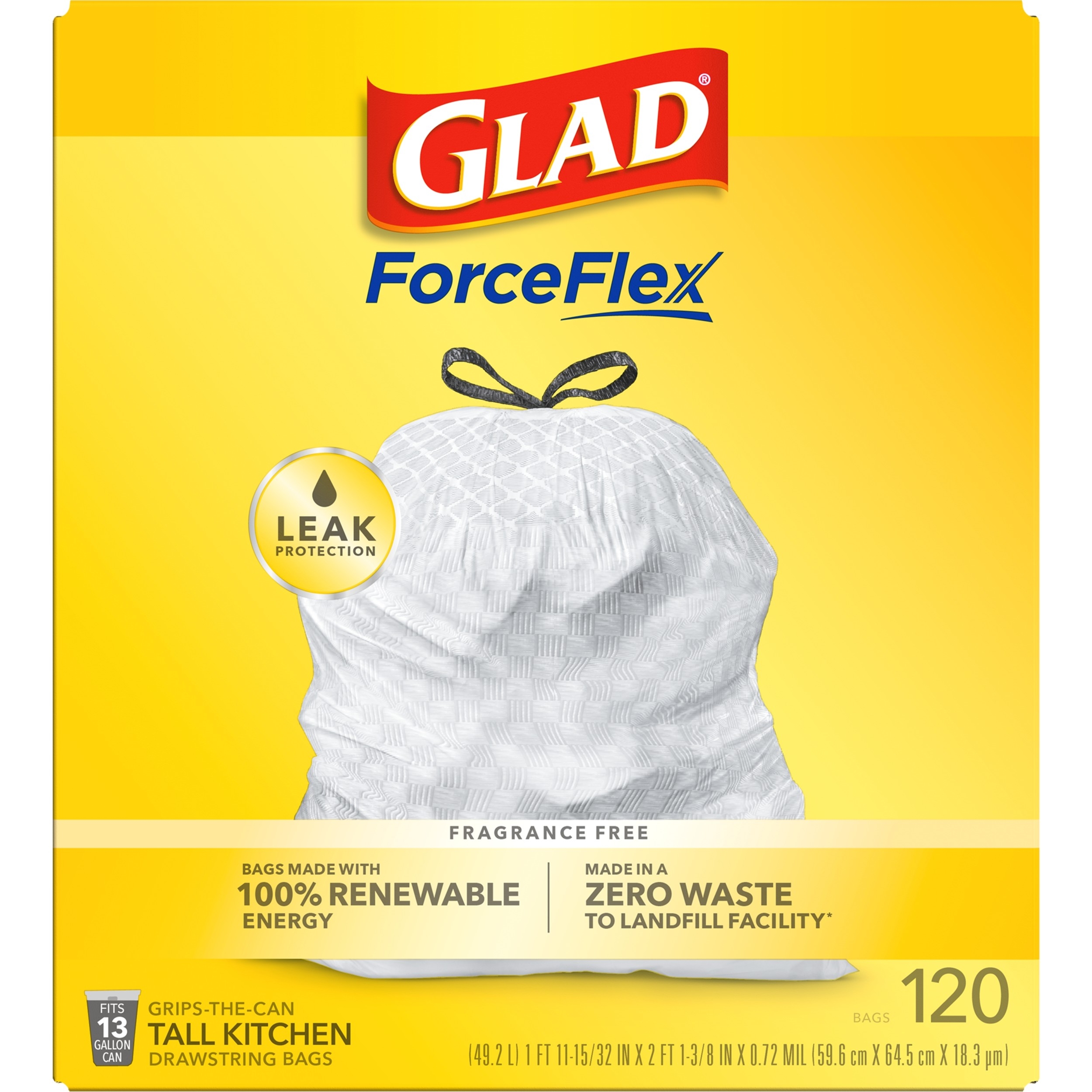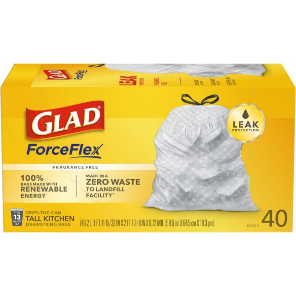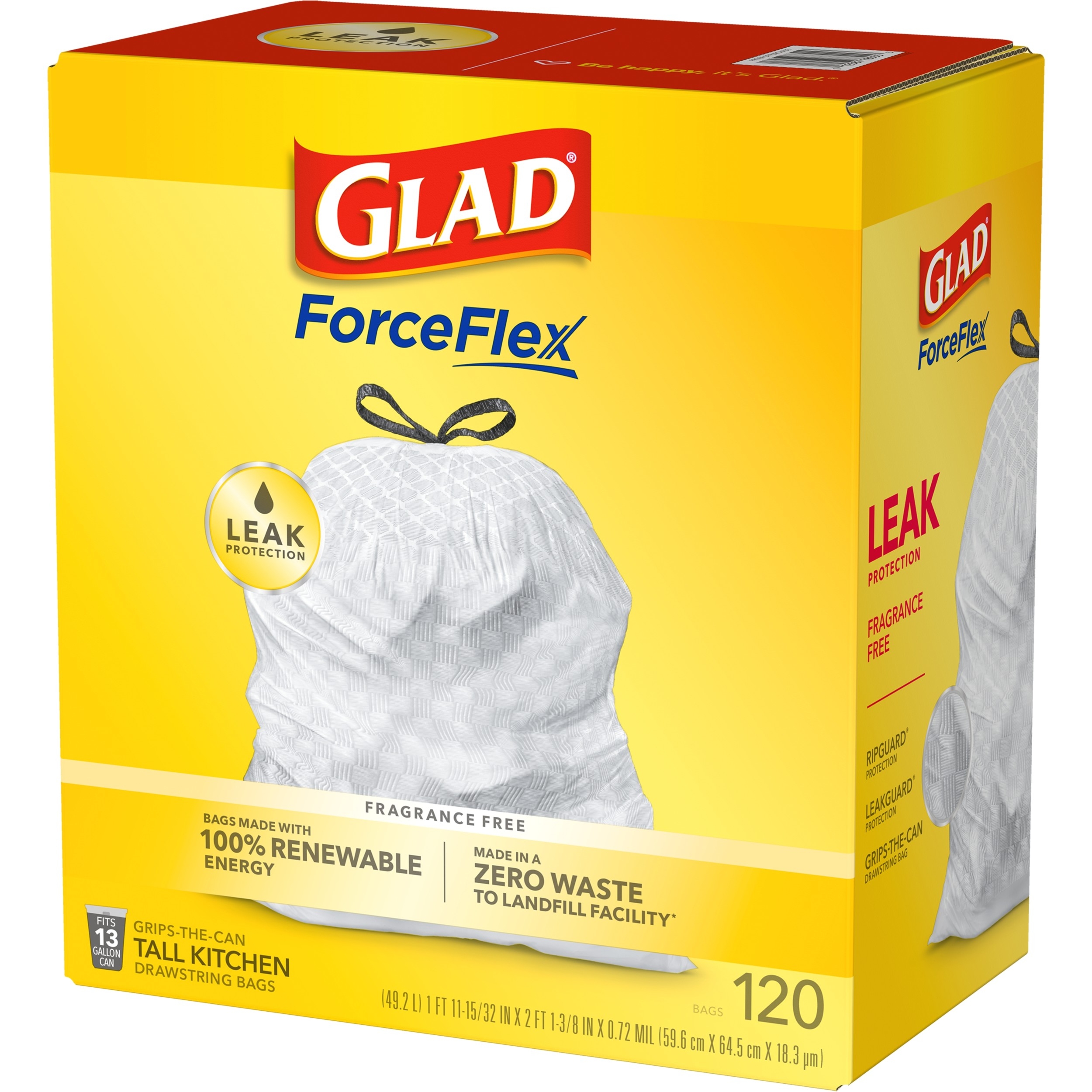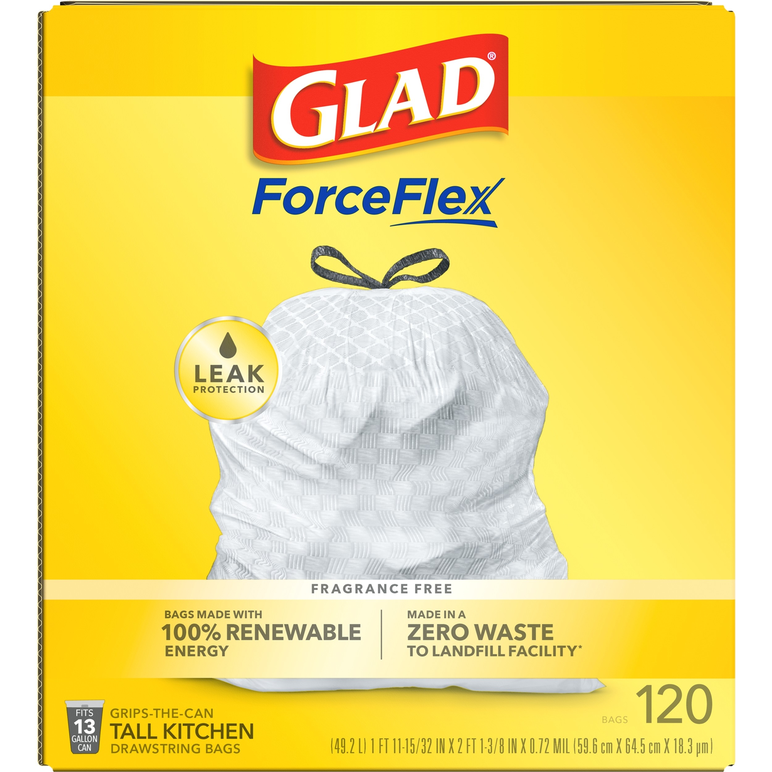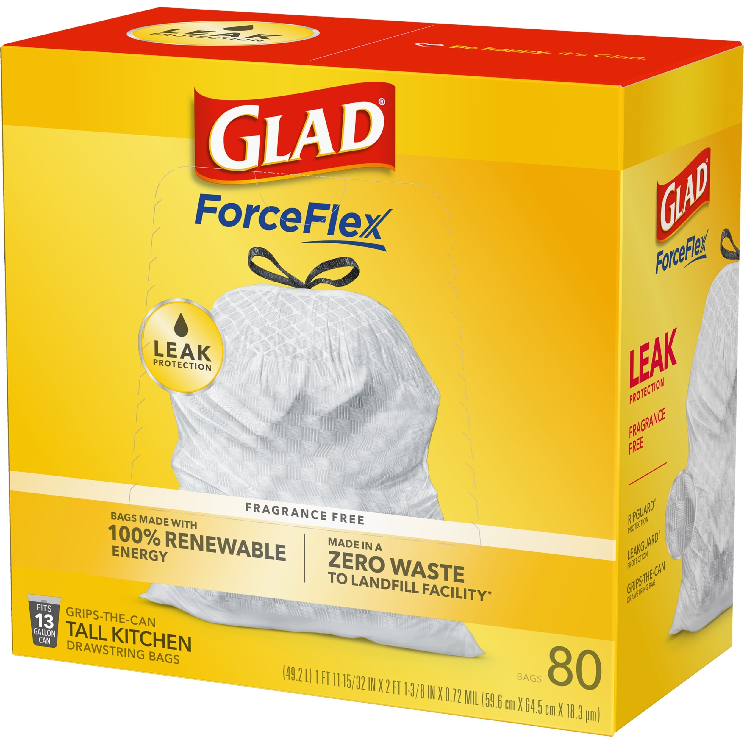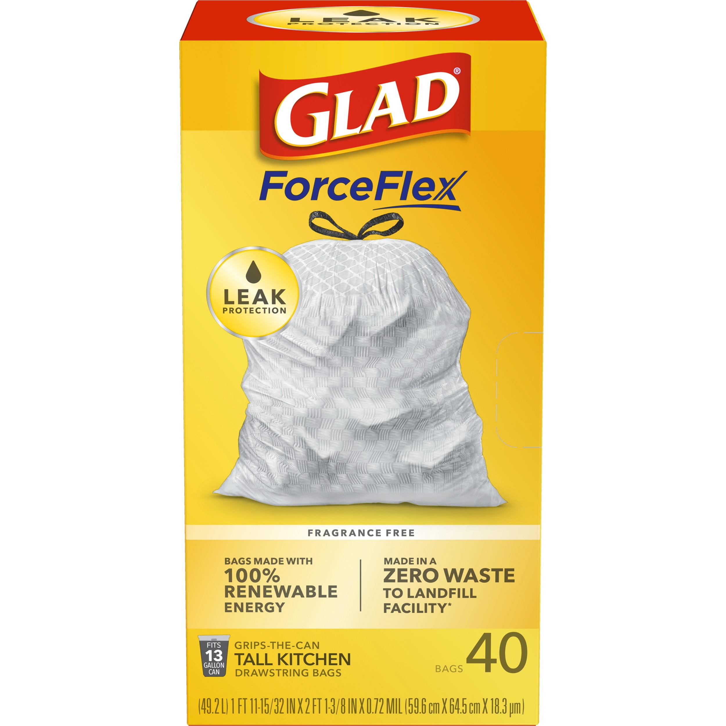 These tall kitchen garbage bags are a more sustainable choice. The bags are made with 100% renewable energy in a zero waste to landfill facility that means that 90% of our waste gets recycled or repurposed and 10% or less gets sent to a waste-to-energy facility. Heres something cool: if everyone in the U.S. chose Glad drawstring trash bags, it would save 100 million pounds of plastic from going into landfills every year. Glad tall kitchen trash bags are designed with ForceFlex technology to give extra flex as it expands around sharp edges and heavy loads, so you can pack it in without ripping. These dual-layered garbage bags feature leak protection technology to resist punctures, rips and tears and the seepage of liquids. Let the stretchable strength of Glad handle all the messes our busy daily life can throw at it and then some. The durable Grips-The-Can Drawstring ensures that the bag stays in place, and provides a sturdy 3-ply handle, making it easy to lift, carry and toss the bag. Tough and resilient, Glad can handle some abuse, so shake the trash deeper into the bag while keeping everything contained. Take on trash with the confidence of Glad.