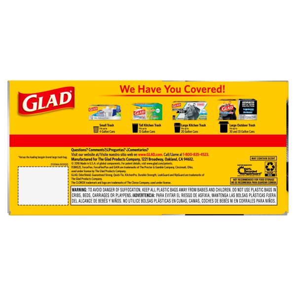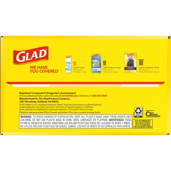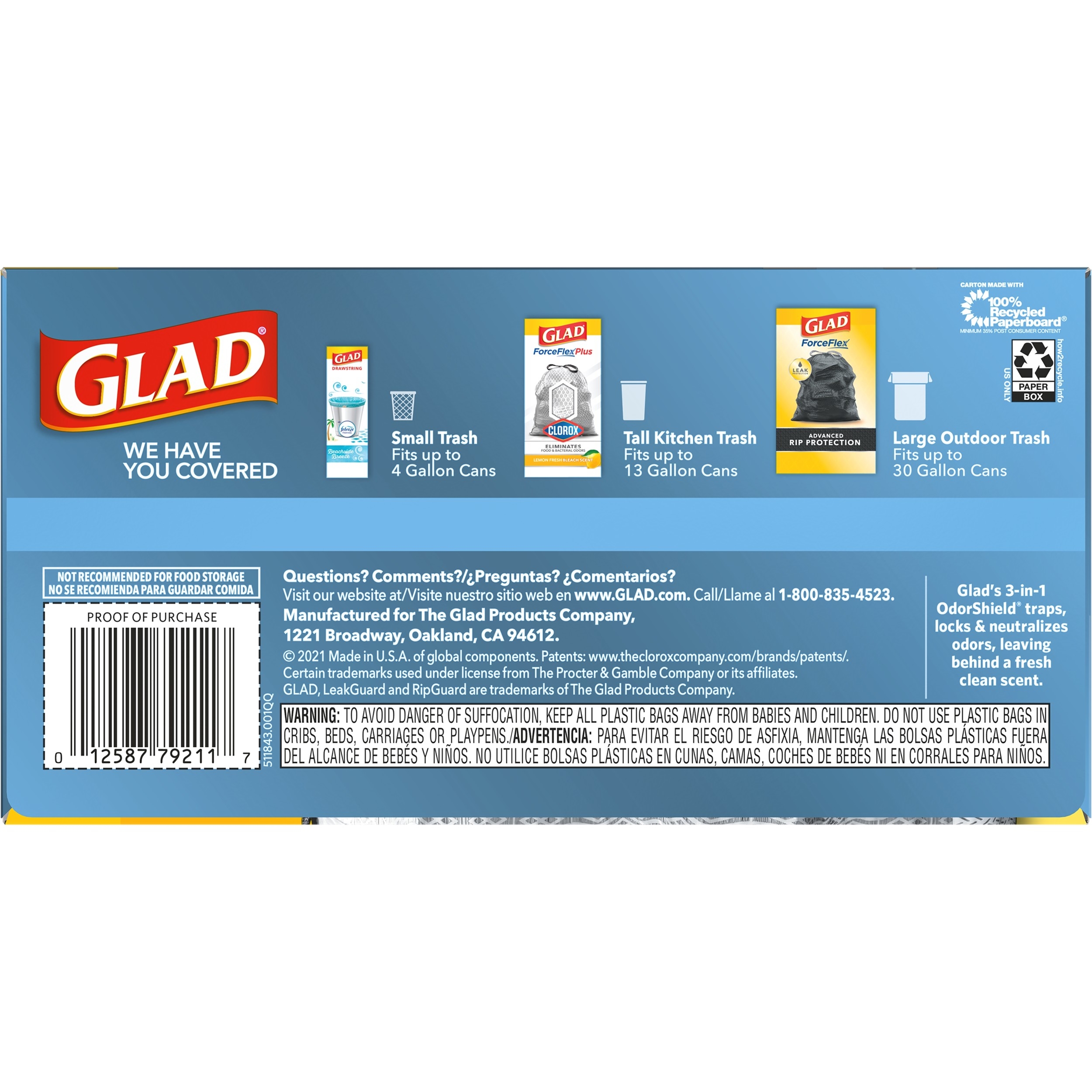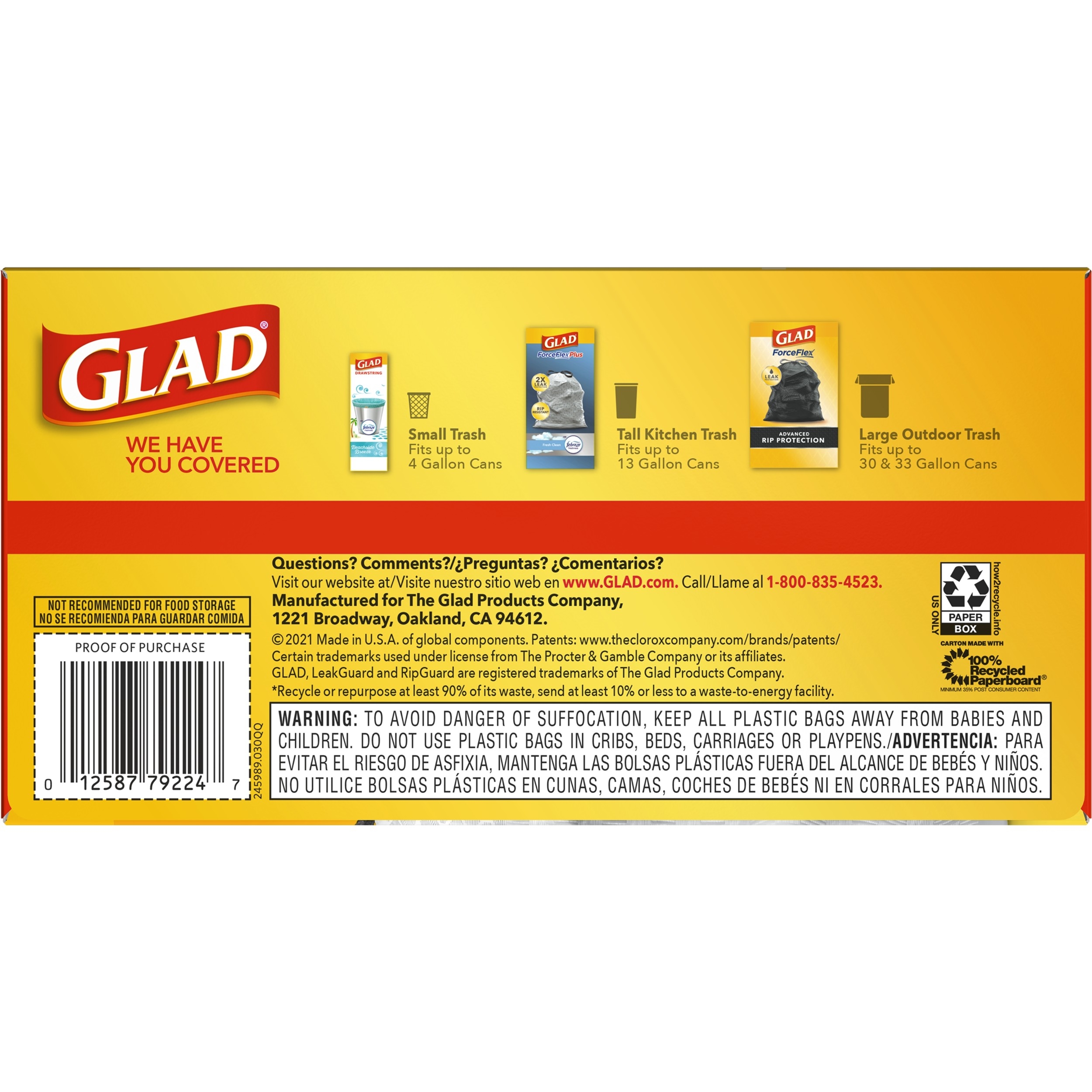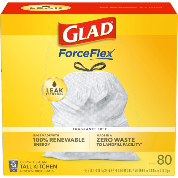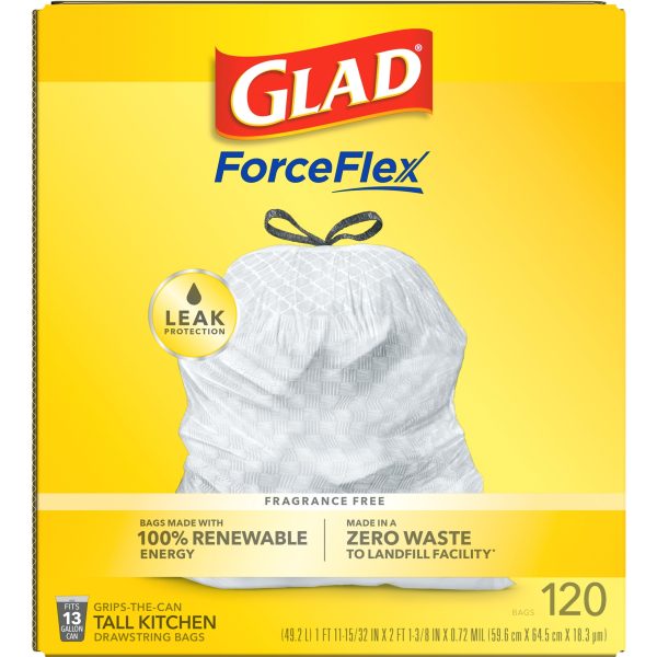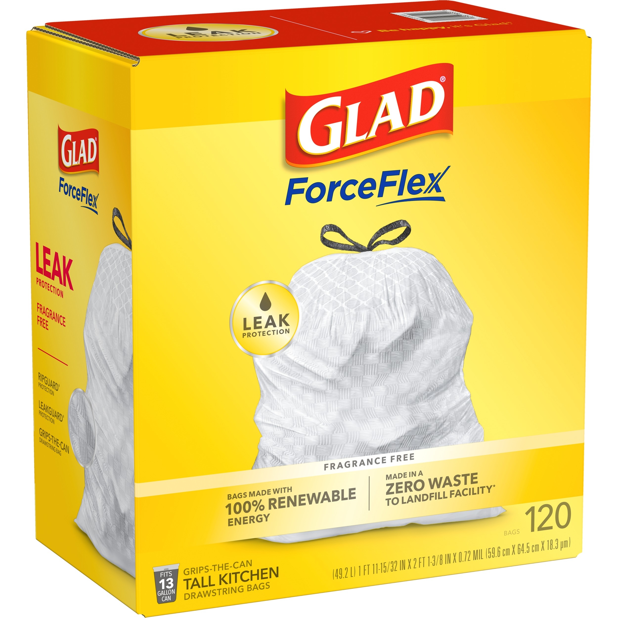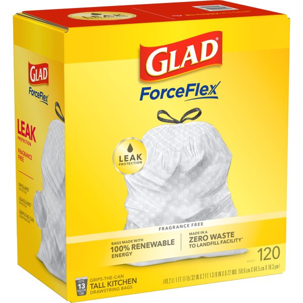 These tall kitchen garbage bags are a more sustainable choice. The bags are made with 100% renewable energy in a zero waste to landfill facility that means that 90% of our waste gets recycled or repurposed and 10% or less gets sent to a waste-to-energy facility. Heres something cool: if everyone in the U.S. chose Glad drawstring trash bags, it would save 100 million pounds of plastic from going into landfills every year. Glad tall kitchen trash bags are designed with ForceFlex technology to give extra flex as it expands around sharp edges and heavy loads, so you can pack it in without ripping. These dual-layered garbage bags feature leak protection technology to resist punctures, rips and tears and the seepage of liquids. Let the stretchable strength of Glad handle all the messes our busy daily life can throw at it and then some. The durable Grips-The-Can Drawstring ensures that the bag stays in place, and provides a sturdy 3-ply handle, making it easy to lift, carry and toss the bag. Tough and resilient, Glad can handle some abuse, so shake the trash deeper into the bag while keeping everything contained. Take on trash with the confidence of Glad.