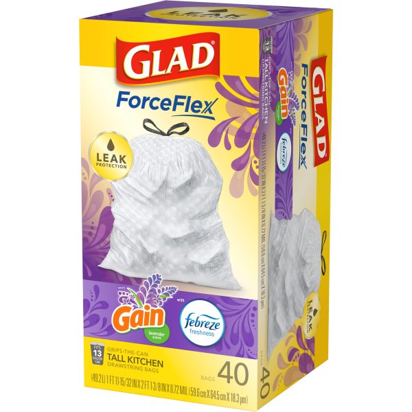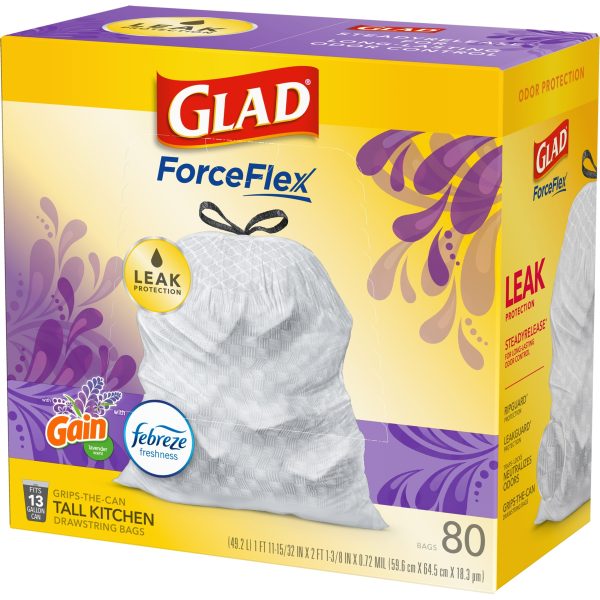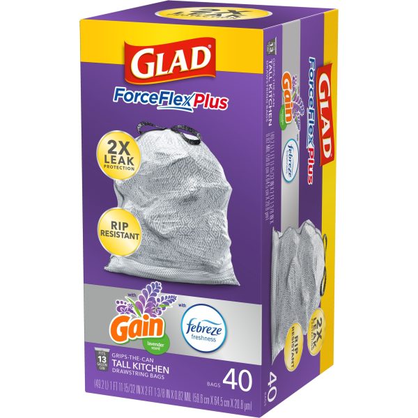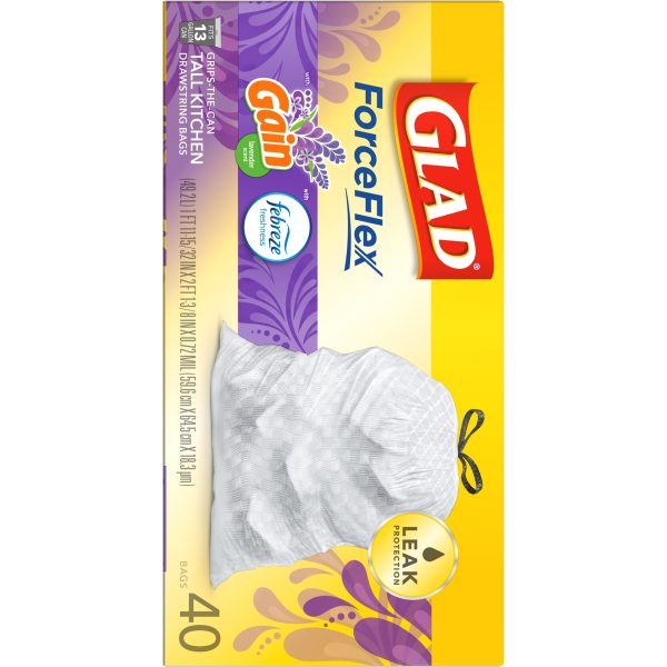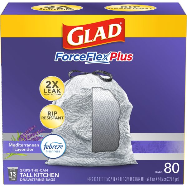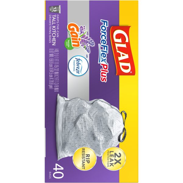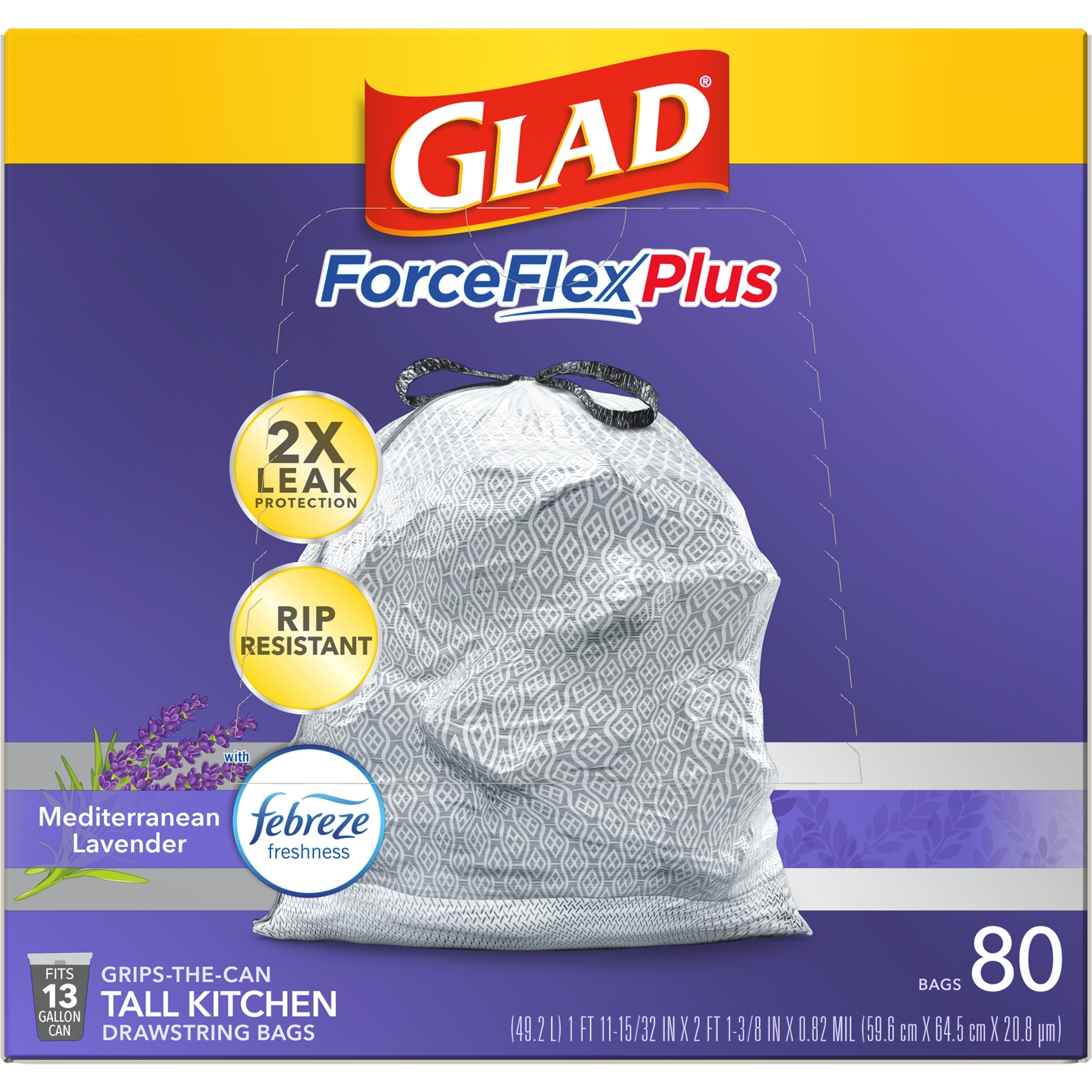 Glad ForceFlexPlus Tall Kitchen Drawstring Trash Bags provide 2X leak protection with double side seams and a reinforced bottom to guard against leaks and trap liquids in the bag. Designed with ForceFlexPlus technology, these trash bags provide two layers of strength and stretch for 2X Leak Protection. Plus, they trap, lock and neutralize odors with lasting Febreze freshness in Lavender scent. What goes in the trash, stays in the trash with Glad, featuring RipGuard and LeakGuard technology. Glads two durable layers handle the most demanding trash, with an outer layer to protect against leaks and a strong inner layer to prevent rips and tears. The Grips-The-Can Drawstring ensures that the bag stays in place, making it easy to close and carry out the trash.