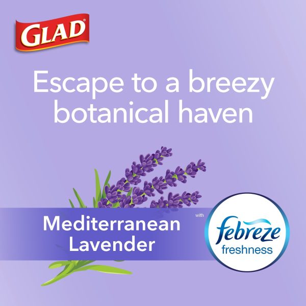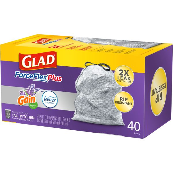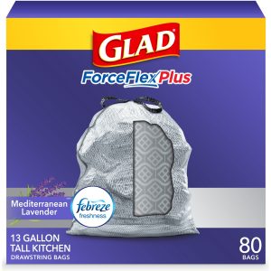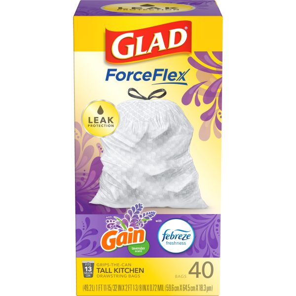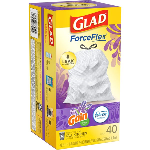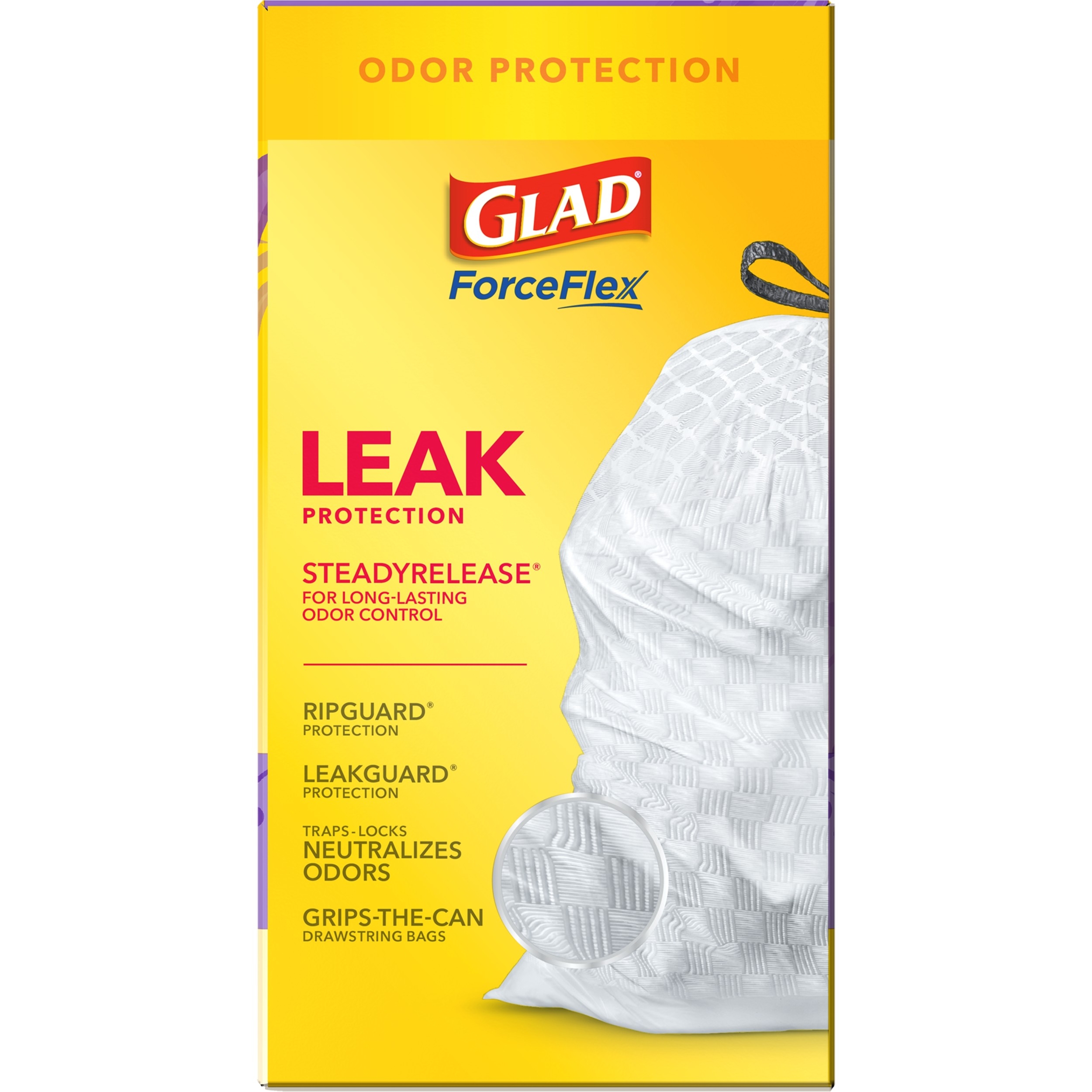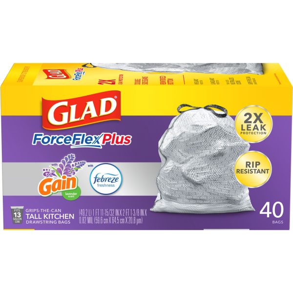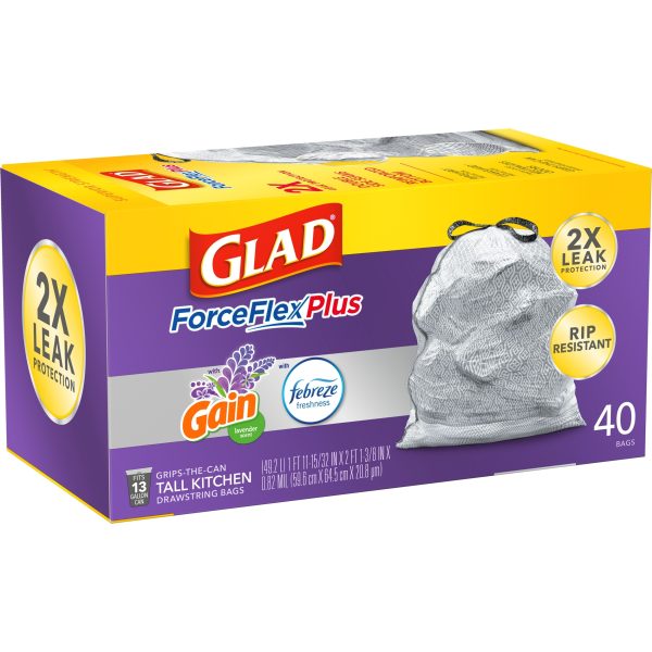 Glad ForceFlexPlus Tall Kitchen Drawstring Trash Bags provide 2X leak protection with double side seams and a reinforced bottom to guard against leaks and trap liquids in the bag. Designed with ForceFlexPlus technology, these trash bags provide two layers of strength and stretch for 2X Leak Protection. Plus, they trap, lock and neutralize odors with lasting Febreze freshness in Lavender scent. What goes in the trash, stays in the trash with Glad, featuring RipGuard and LeakGuard technology. Glads two durable layers handle the most demanding trash, with an outer layer to protect against leaks and a strong inner layer to prevent rips and tears. The Grips-The-Can Drawstring ensures that the bag stays in place, making it easy to close and carry out the trash.