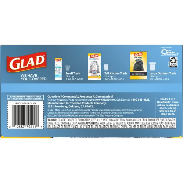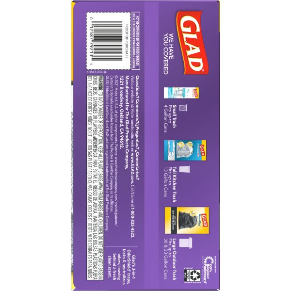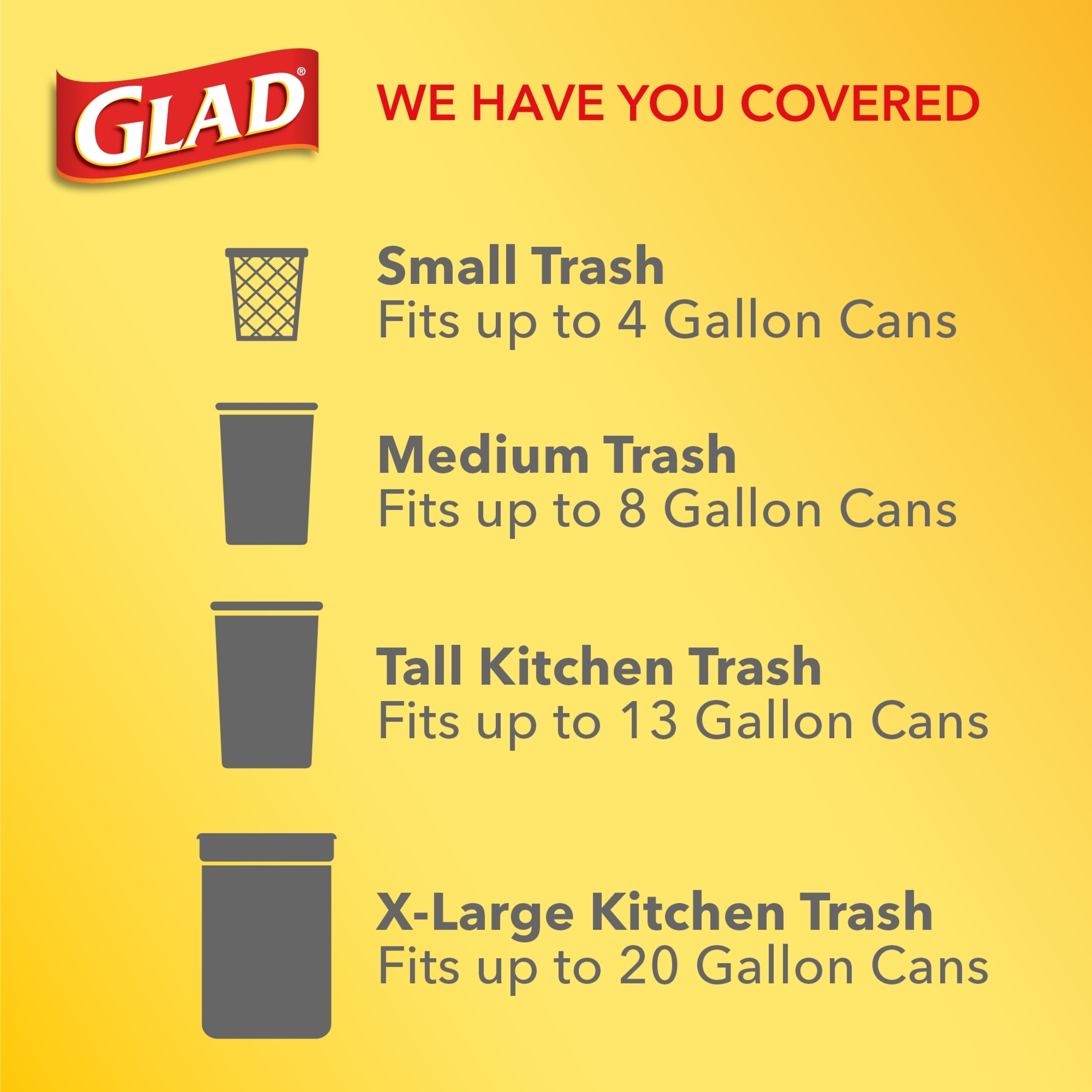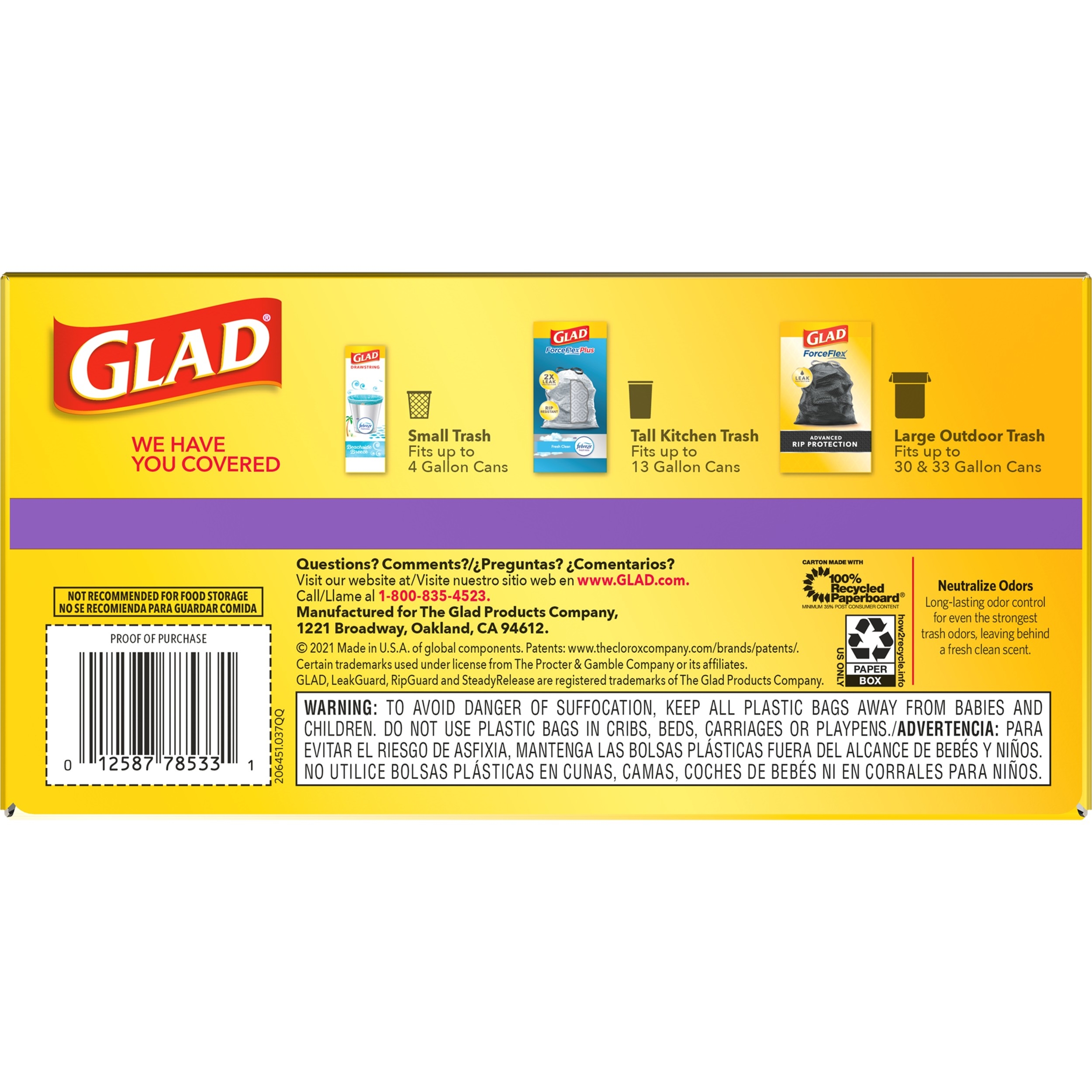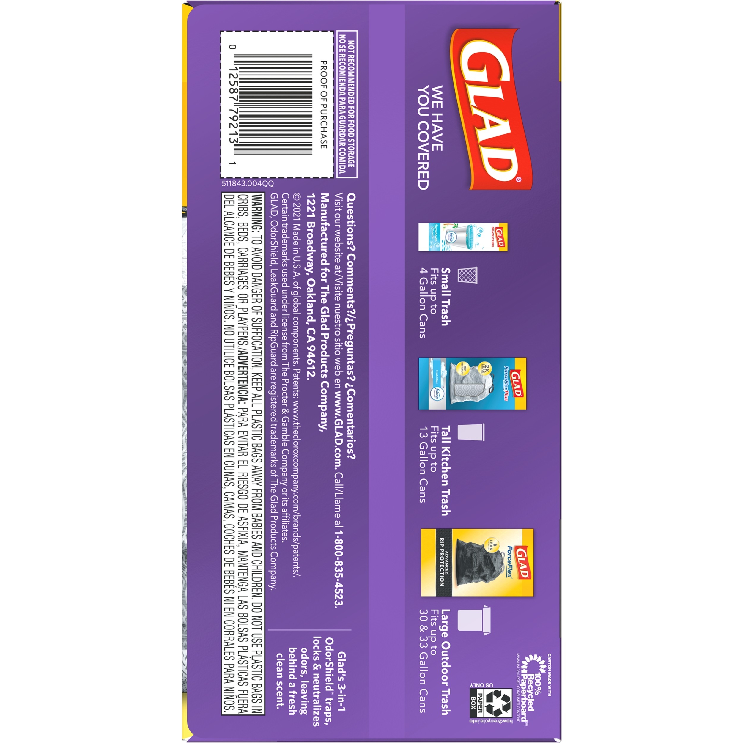 Fight nasty kitchen odors with the exclusive Glad trash bag combination of steady release Febreze freshness and irresistible Lavender scent only offered by Gain. Glad Tall Kitchen Drawstring Trash Bags are designed with ForceFlex technology to give extra flex as it expands around sharp edges and heavy loads, so you can pack it in while resisting tears, rips and punctures. These Glad trash bags leave behind a lasting Febreze freshness and a Gain Lavender scent. Let the stretchable strength of Glad ForceFlex handle all the messes our busy daily life can throw at it and then some. These trash bags are designed with RipGuard and LeakGuard technology to prevent seepage of liquids and keep trash contained. The durable Grips-The-Can Drawstring ensures a tight grip on the trash can to keep it in place. Take the trash to the curb with no fear of leaks and tears, and no frustration. Keep your kitchen smelling clean with the stretchable strength of Glad. Comparable to simple human H, Q, K, M, N, J liners and fit simple human trash cans. The durable drawstring ensures that the bag stays in place.