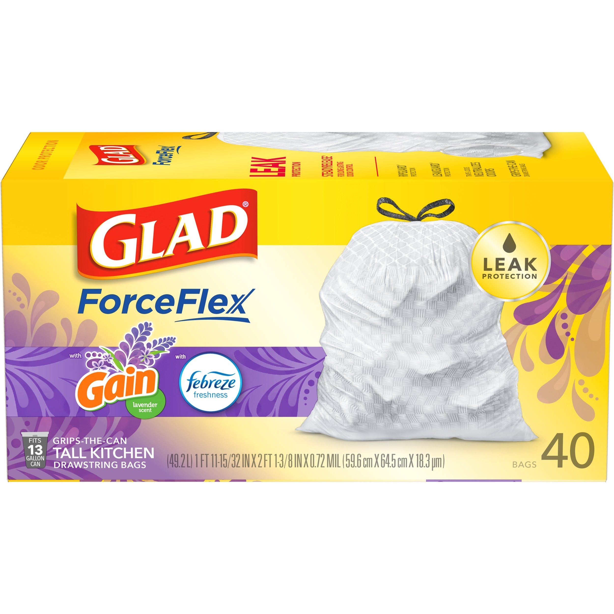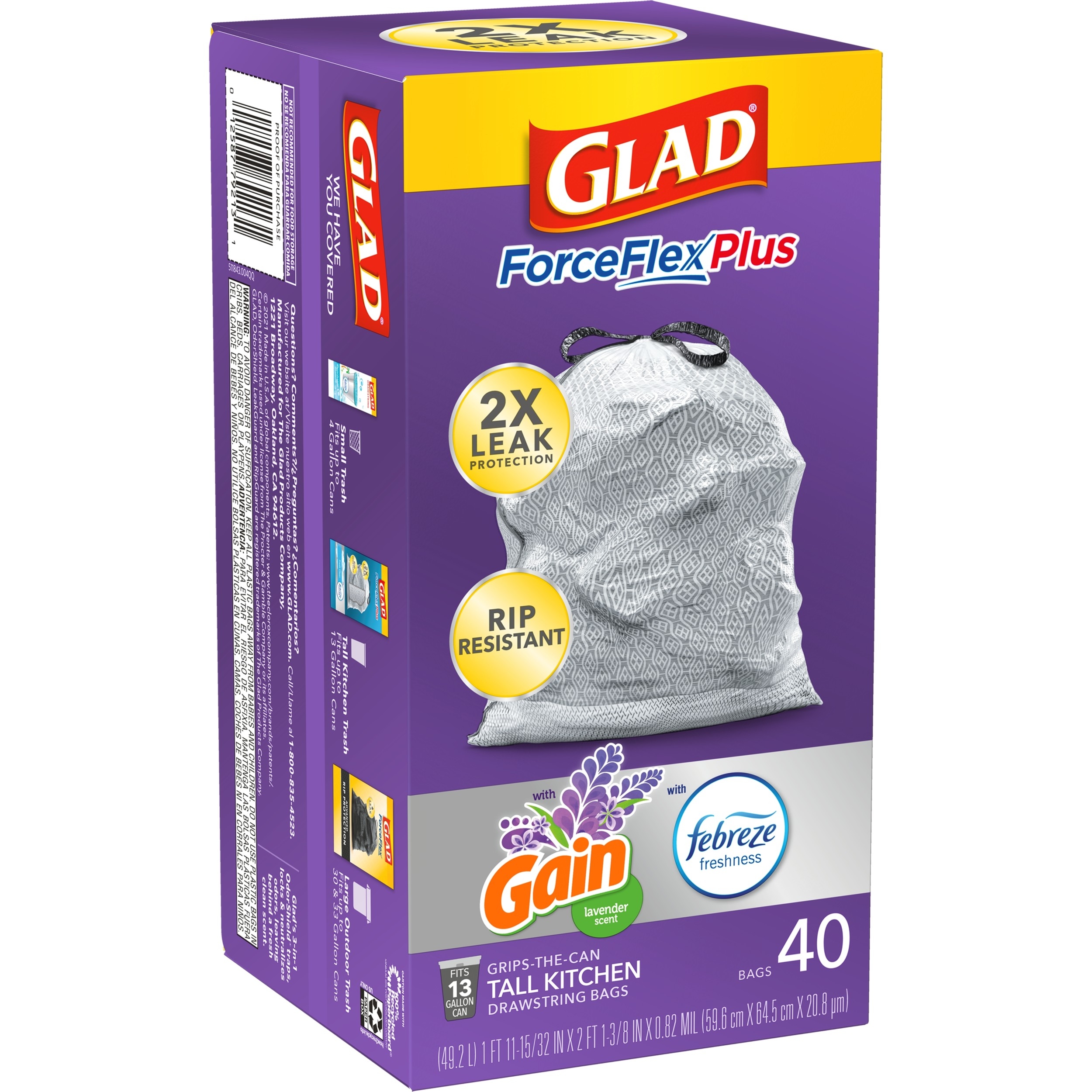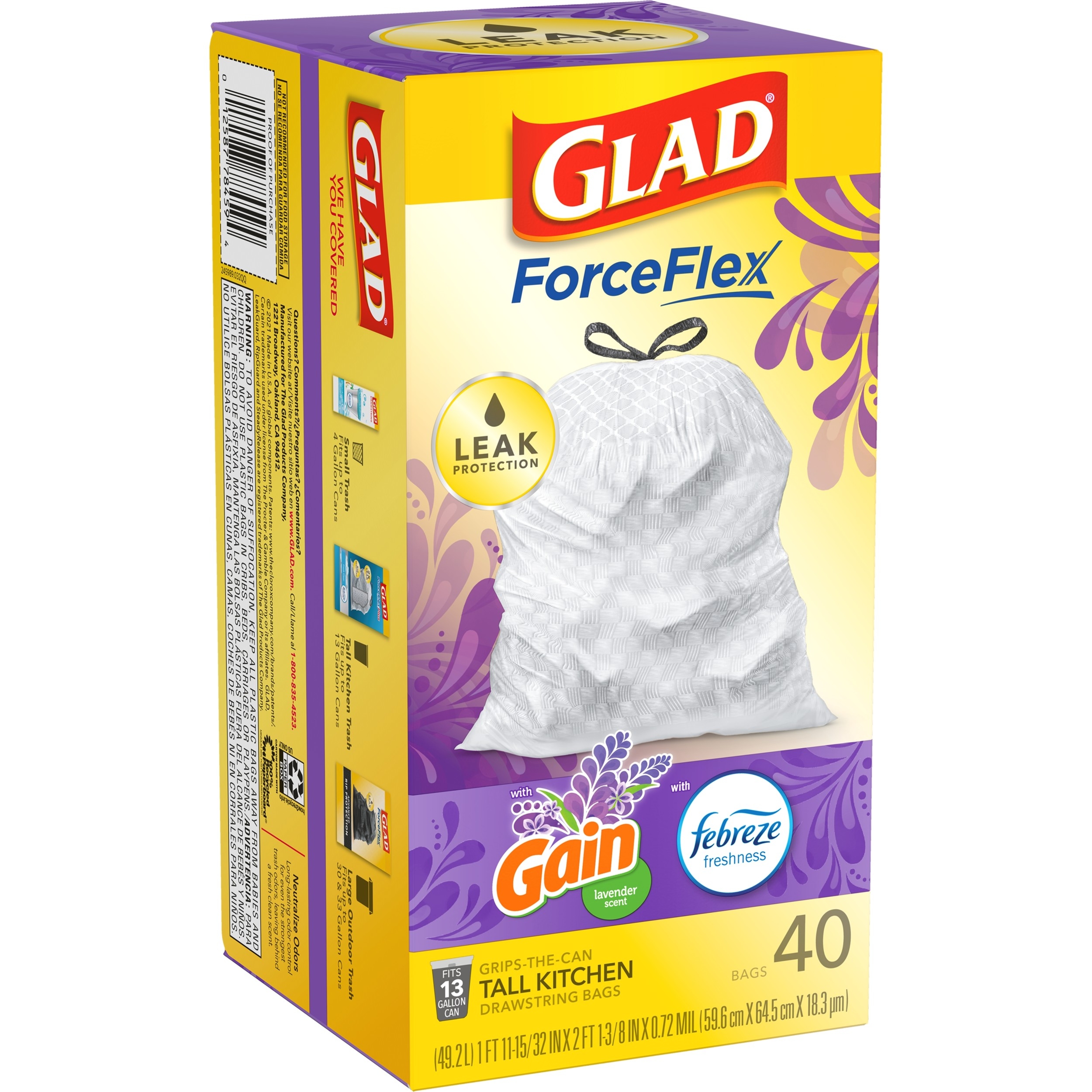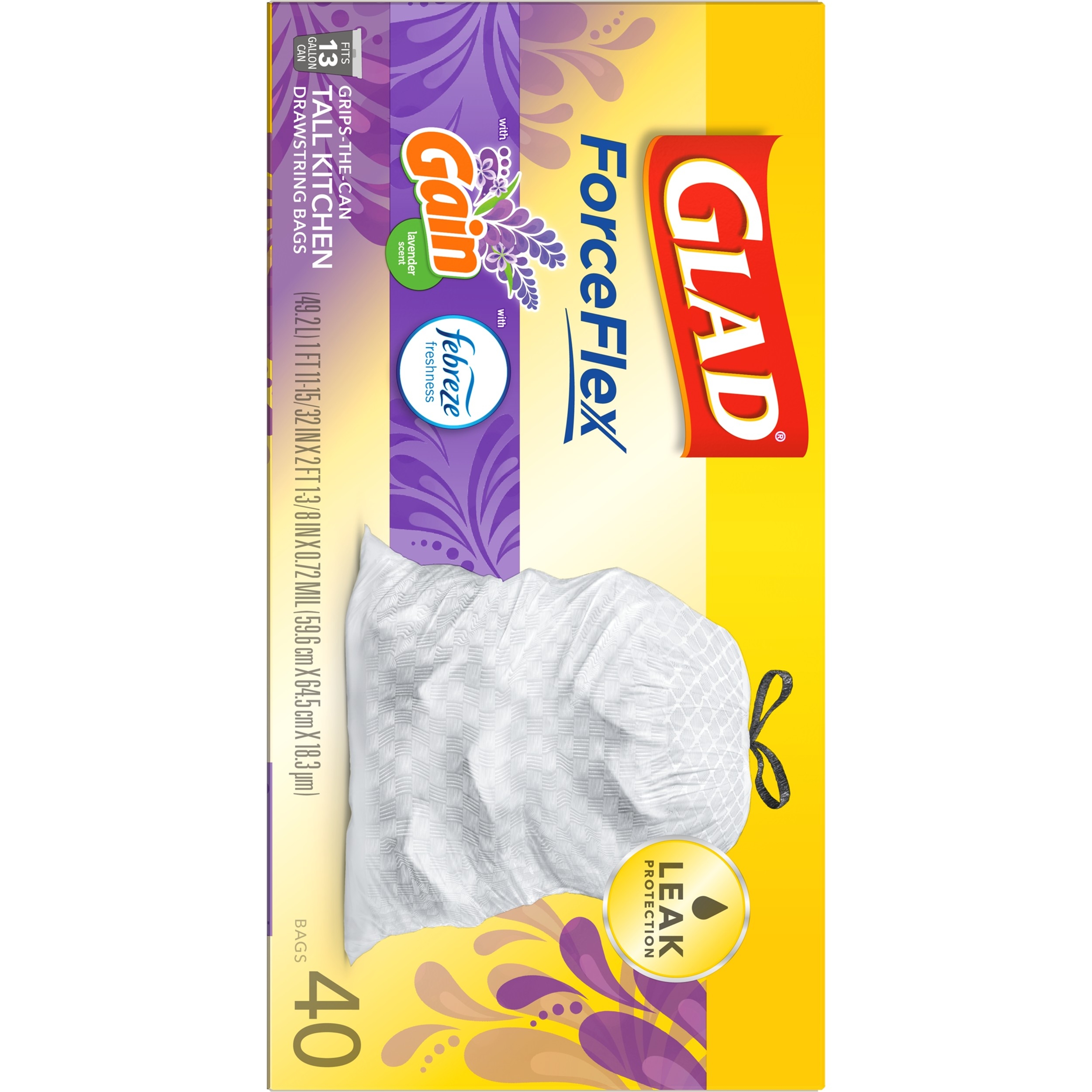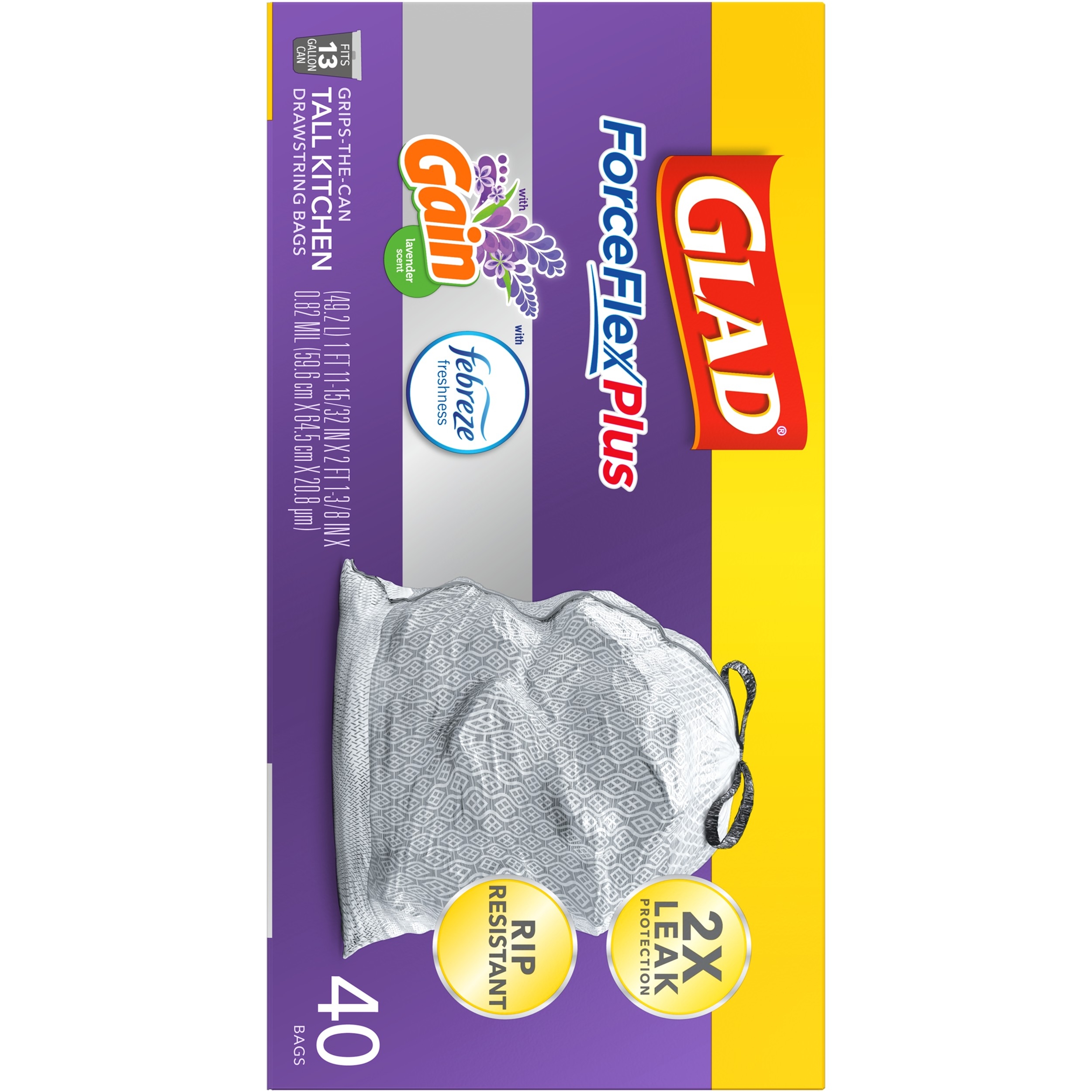 Your favorite Gain Lavender scent and Glads strongest kitchen trash bag* design have joined forces to handle your toughest trash needs. Glad ForceFlexPlus Tall Kitchen Drawstring Trash Bags provide 2X leak protection with double side seams and a reinforced bottom to guard against leaks and trap liquids in the bag. Designed with ForceFlexPlus technology, these trash bags provide two layers of strength and stretch for 2X Leak Protection. These Glad trash bags leave behind a lasting Febreze freshness and a Gain Lavender scent. What goes in the trash, stays in the trash with Glad, featuring RipGuard and LeakGuard technology. Glads two durable layers handle the most demanding trash, with an outer layer to protect against leaks and a strong inner layer to prevent rips and tears. The Grips-The-Can Drawstring ensures that the bag stays in place, making it easy to close and carry out the trash. These bags are comparable to simple human H, Q, K, M, N, J liners and fit simple human trash cans. *Compared to a standard 13-gallon Glad kitchen bag.