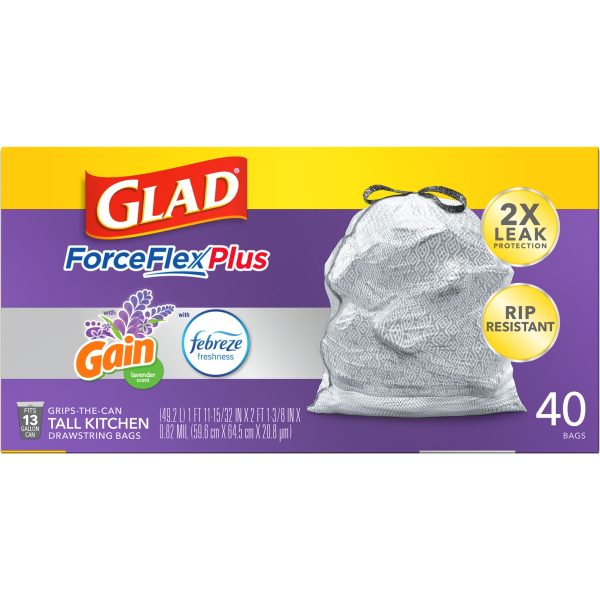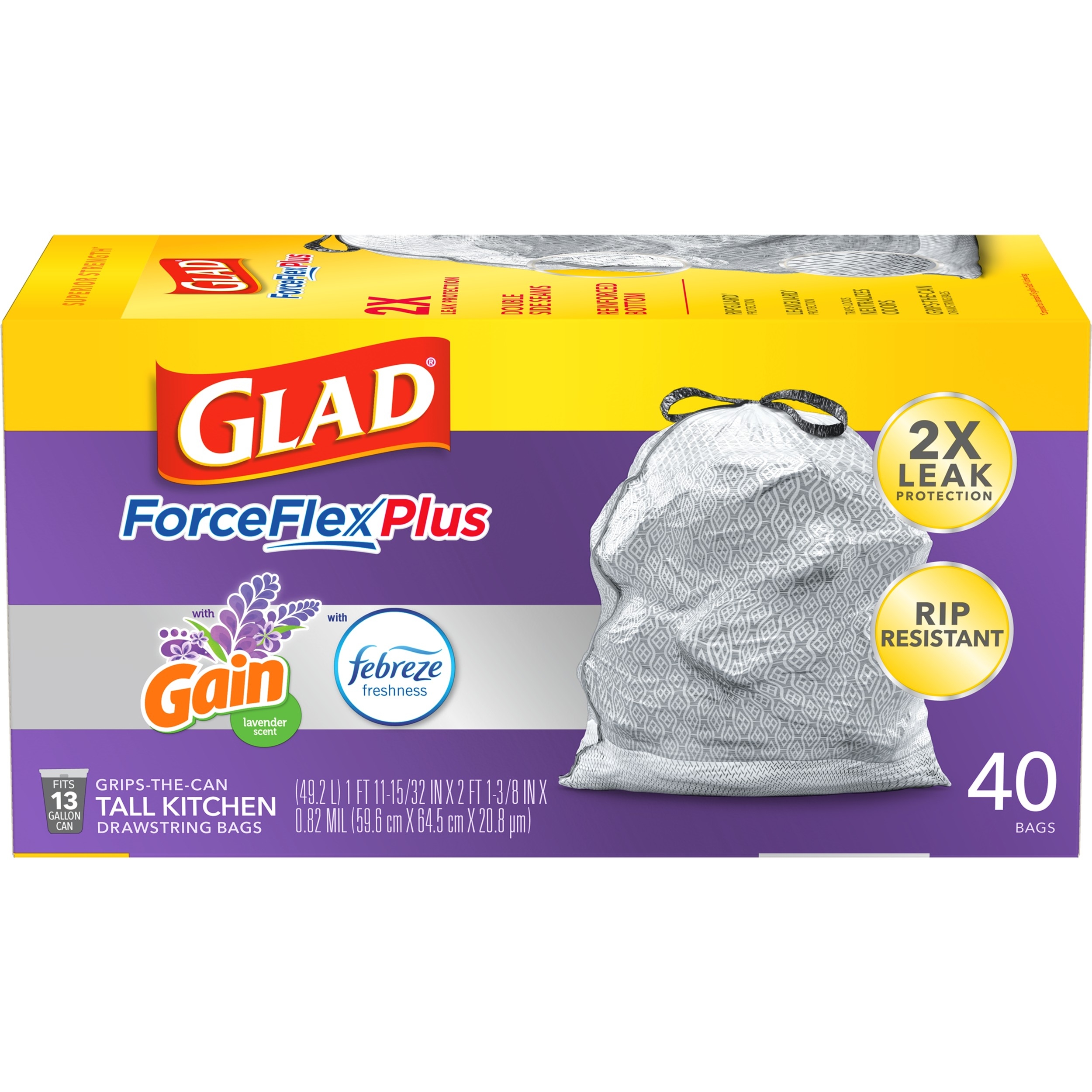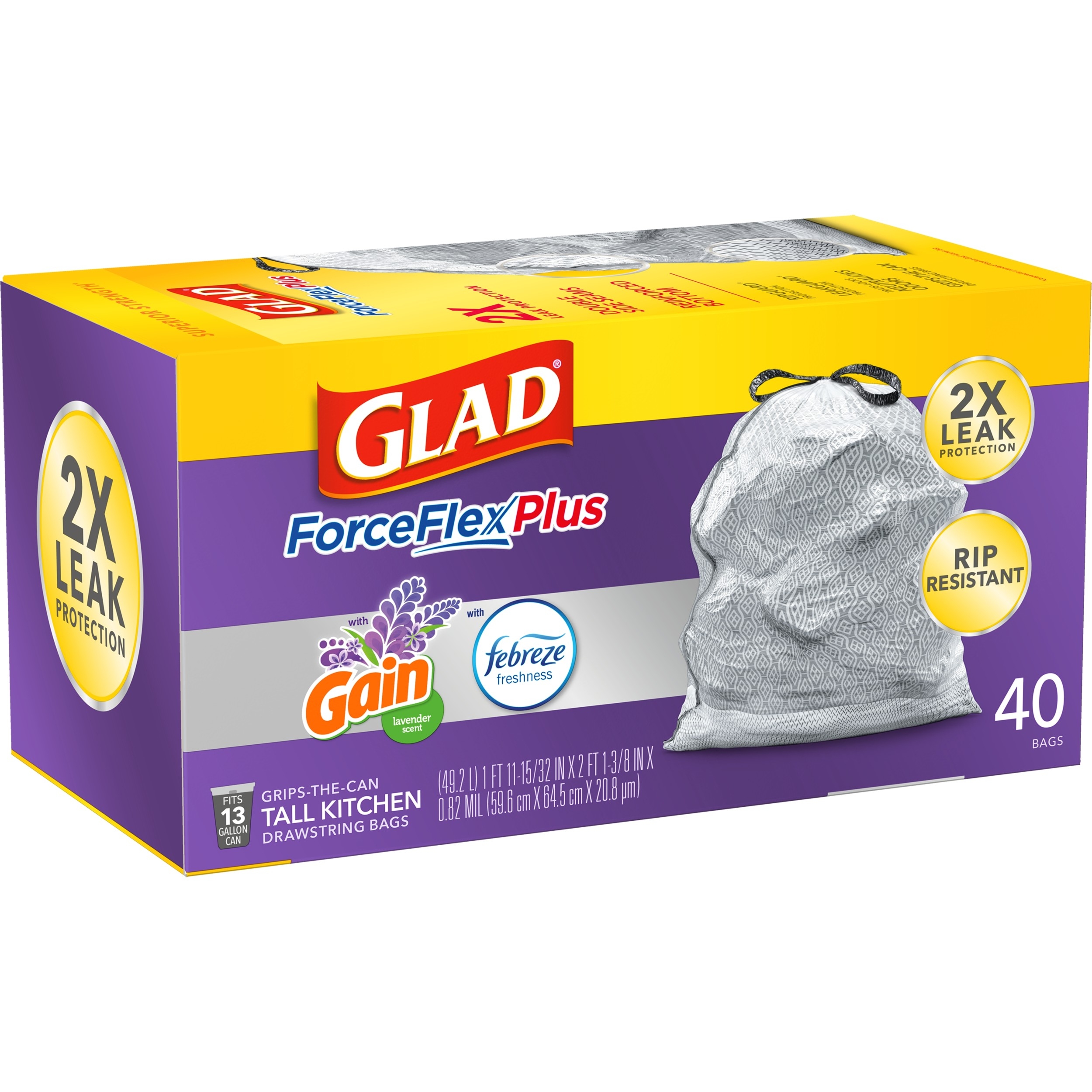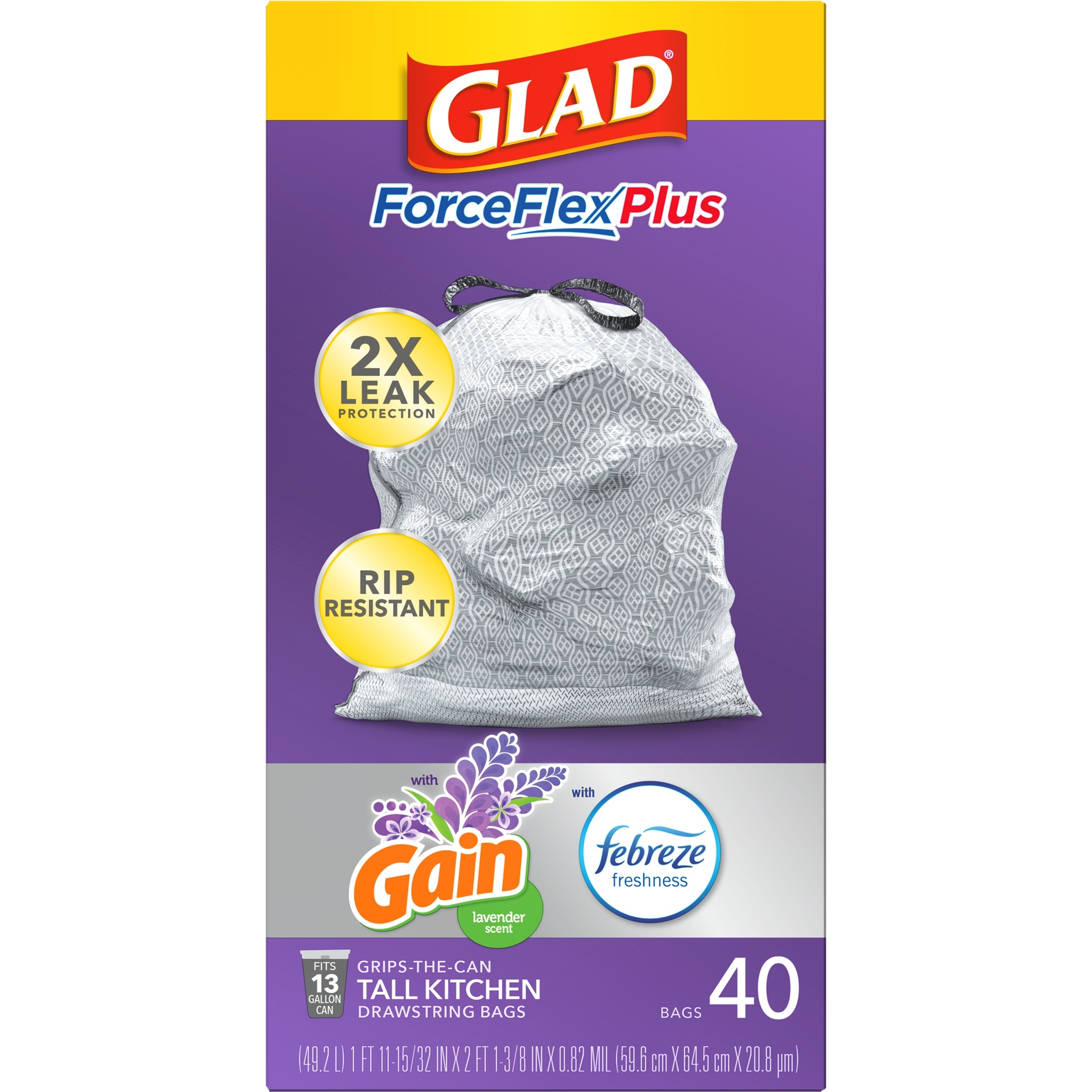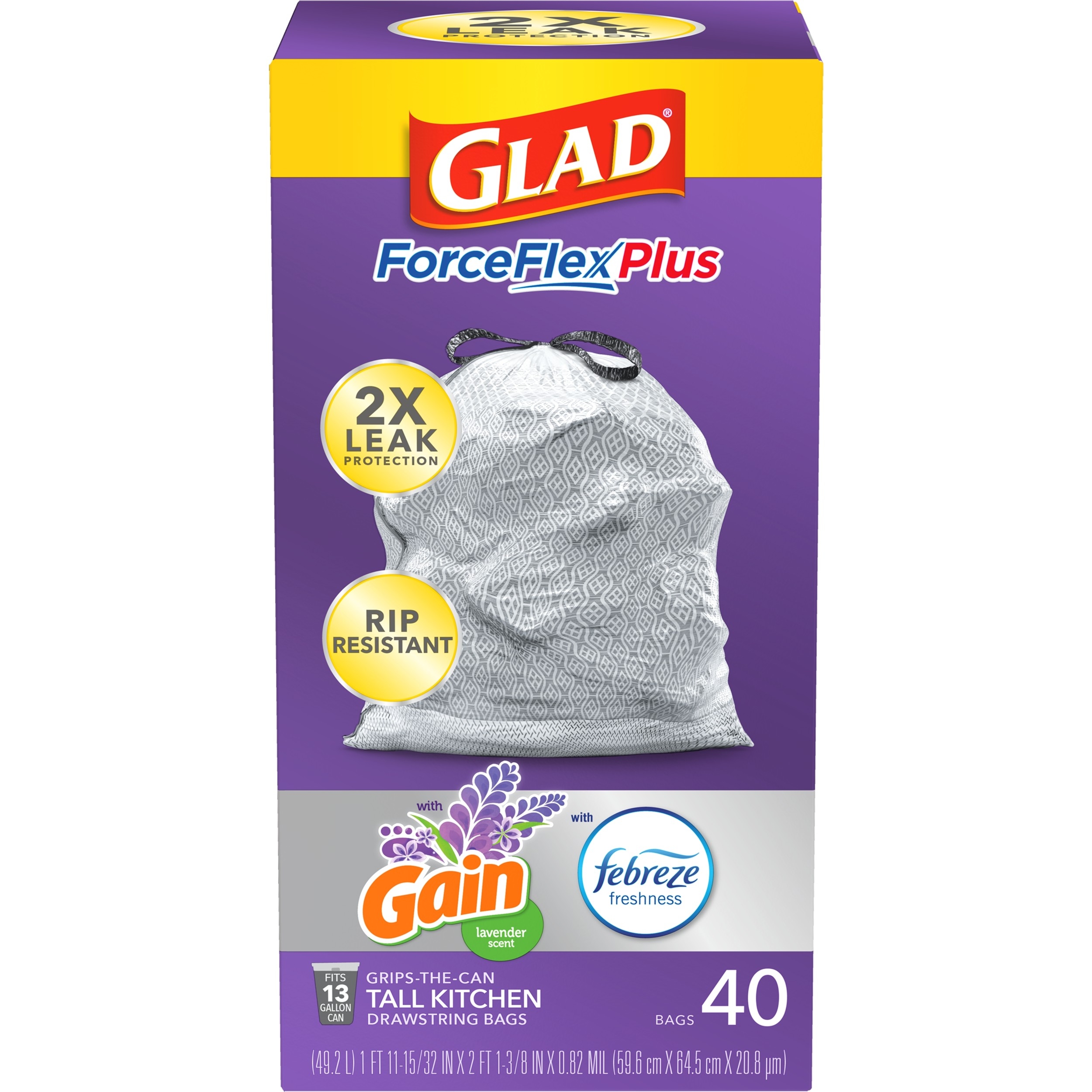 Your favorite Gain Lavender scent and Glads strongest kitchen trash bag* design have joined forces to handle your toughest trash needs. Glad ForceFlexPlus Tall Kitchen Drawstring Trash Bags provide 2X leak protection with double side seams and a reinforced bottom to guard against leaks and trap liquids in the bag. Designed with ForceFlexPlus technology, these trash bags provide two layers of strength and stretch for 2X Leak Protection. These Glad trash bags leave behind a lasting Febreze freshness and a Gain Lavender scent. What goes in the trash, stays in the trash with Glad, featuring RipGuard and LeakGuard technology. Glads two durable layers handle the most demanding trash, with an outer layer to protect against leaks and a strong inner layer to prevent rips and tears. The Grips-The-Can Drawstring ensures that the bag stays in place, making it easy to close and carry out the trash. These bags are comparable to simple human H, Q, K, M, N, J liners and fit simple human trash cans. *Compared to a standard 13-gallon Glad kitchen bag.