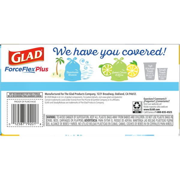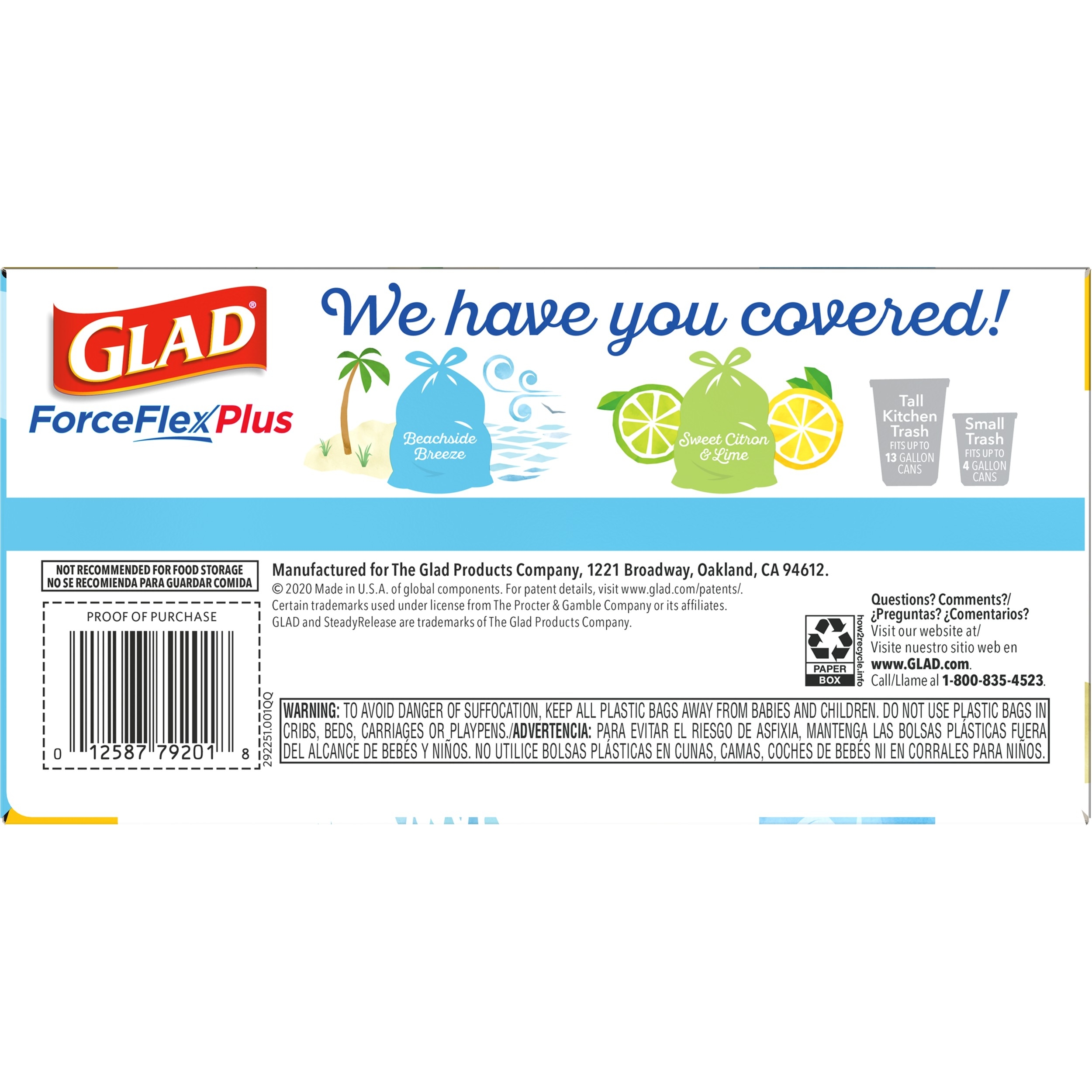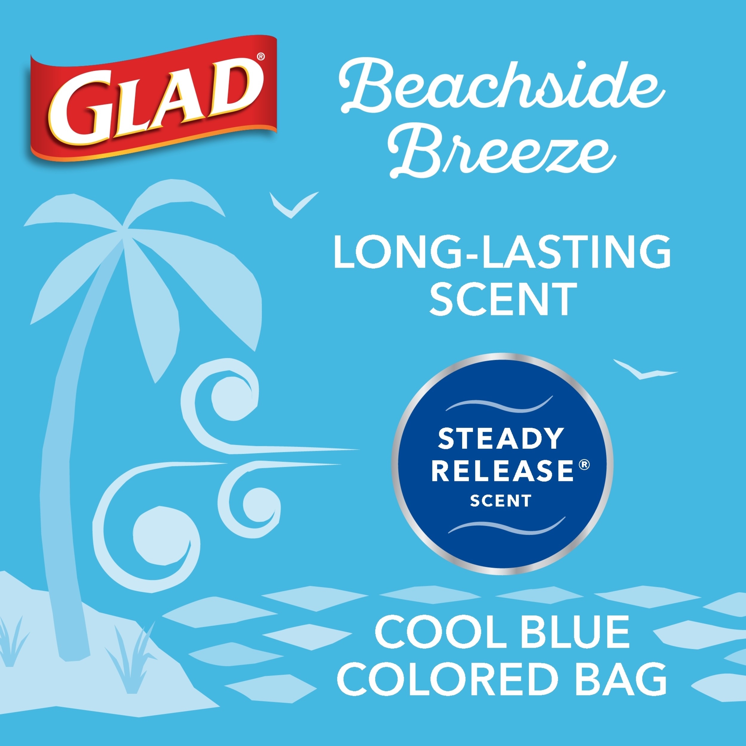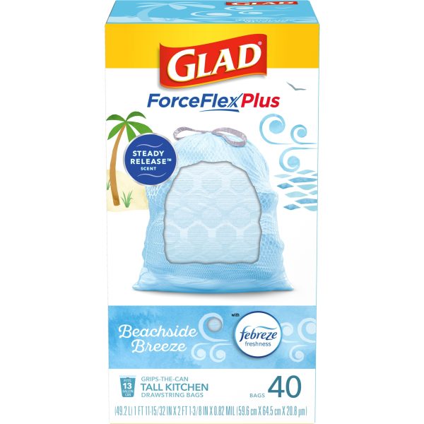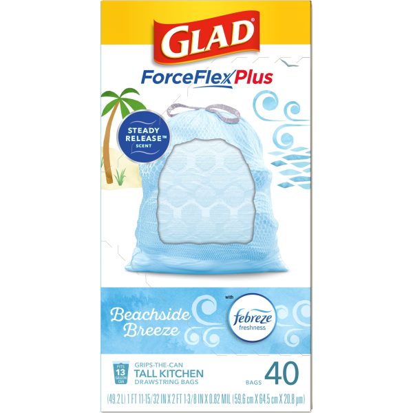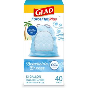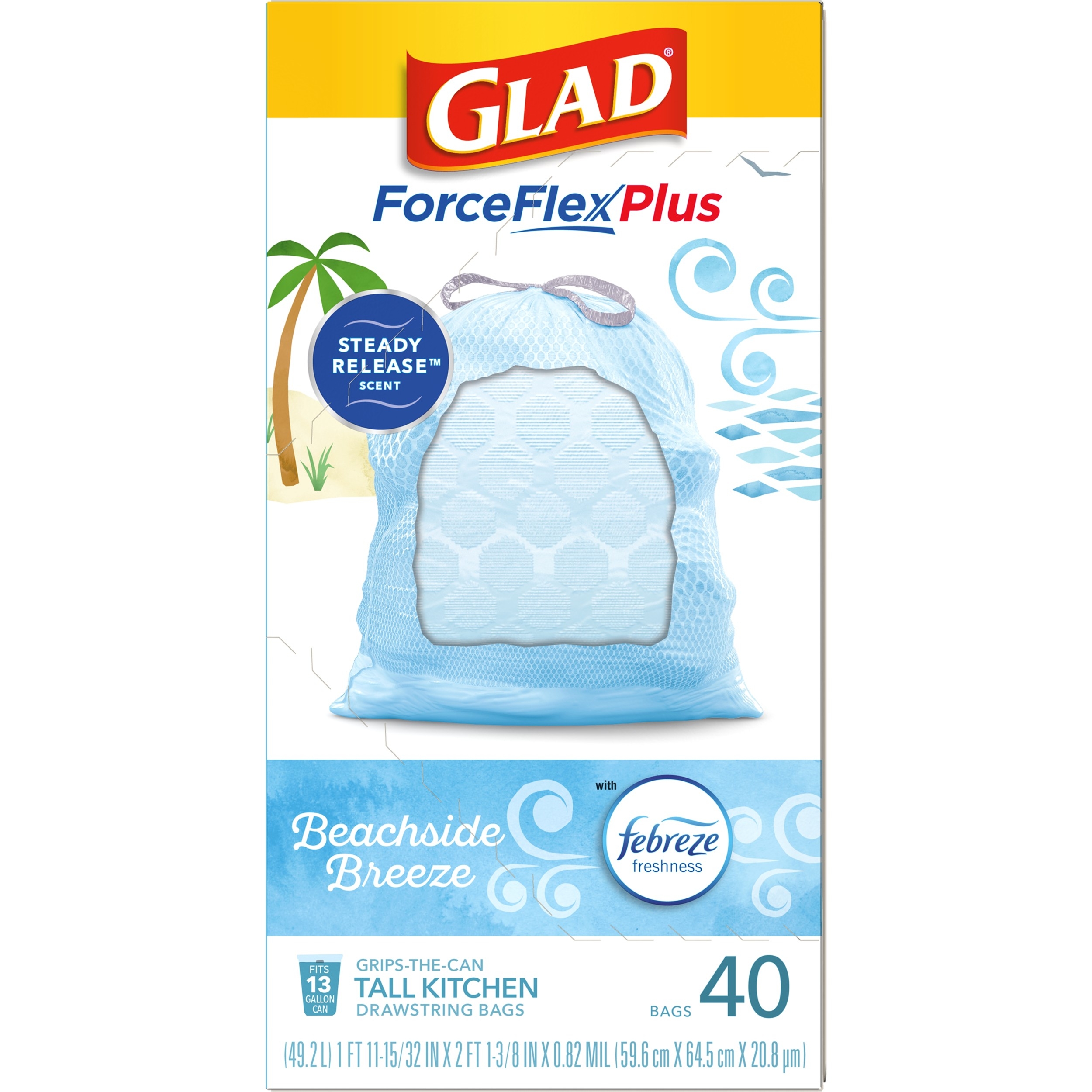 Glad ForceFlexPlus Tall Kitchen Trash Bags provide strength and Febreze odor control, to keep your home feeling fresh and clean. These 13 gallon trash bags are dual layered and equipped with LeakGuard, RipGuard, and ForceFlex technology that work together to provide complete protection against your toughest kitchen disasters. The outer layer is equipped with LeakGuard while the inner layer stretches to prevent rips and tears with the trusted stretchable strength of Glad ForceFlexPlus technology. SteadyRelease technology and Febreze freshness in a signature Beachside Breeze scent provide continuous odor neutralization while the light blue bag adds an aesthetic touch to your kitchen. The drawstring grips to the trash can, keeping the bag in place until you’re ready to take it out. Just a quick cinch of the durable drawstring makes trash removal simple and ideal for your seasonal cleaning like Spring Cleaning and Back to School.