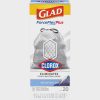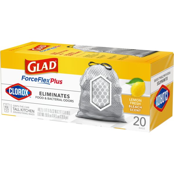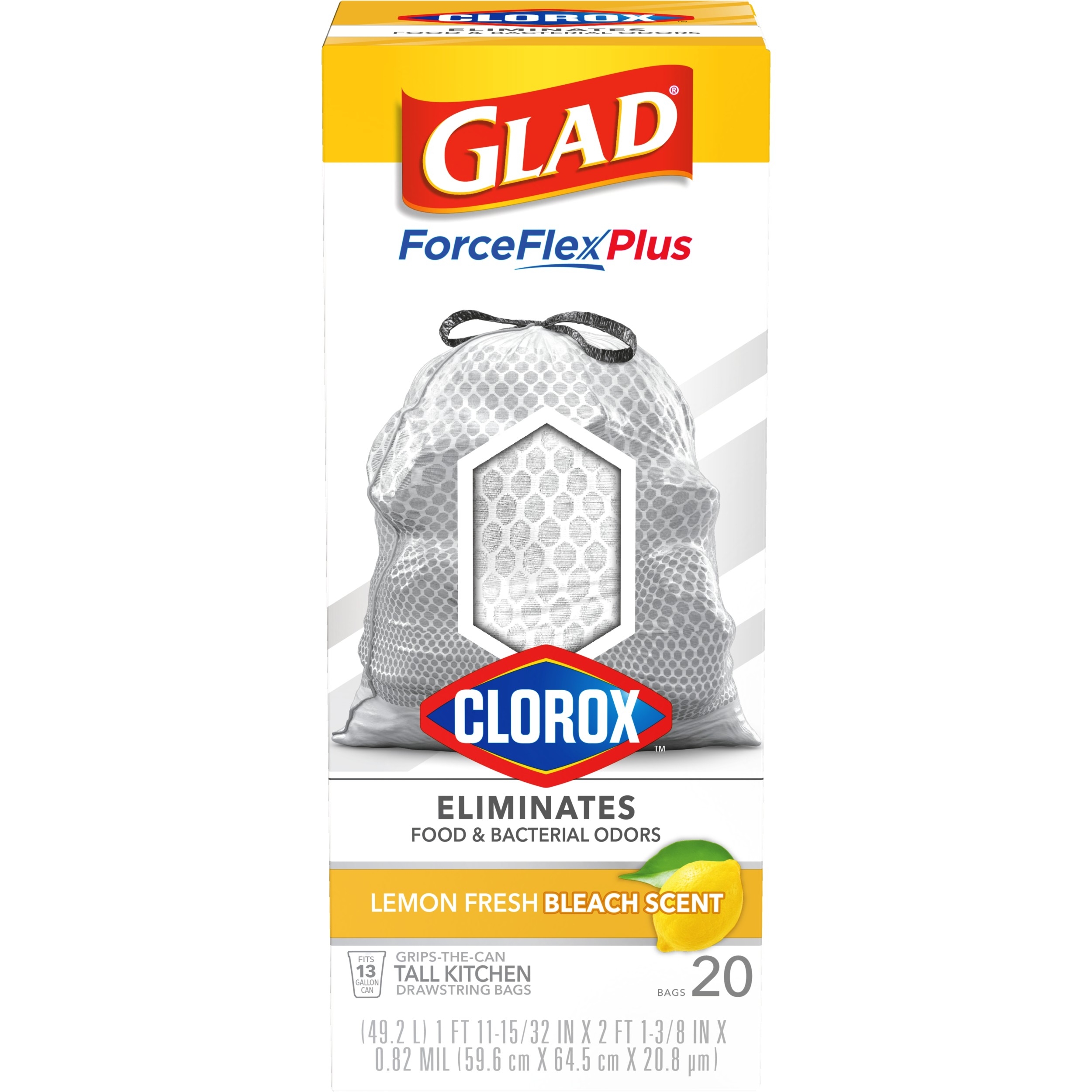 Glad and Clorox have joined forces to create a trash bag with the strength of Glad and the odor-fighting power of Clorox. Glad ForceFlex Plus with Clorox Tall Kitchen Trash Bags eliminate food and bacterial odors to keep your home feeling clean and healthy. These 13 gallon kitchen trash bags are dual layered with a unique hexagon pattern to provide complete protection against your toughest kitchen disasters. The outer layer is equipped with LeakGuard and double side seams for added leak protection, while the inner RipGuard layer stretches to prevent rips and tears with the trusted stretchable strength of Glads ForceFlex Plus technology. These versatile garbage bags feature the clean smell of Lemon Fresh Bleach Scent and are ideal for use in the kitchen or for spring cleaning. The drawstring grips to the trash can, keeping the bag in place until you’re ready to take it out. Just a quick cinch of the durable drawstring makes trash removal simple.