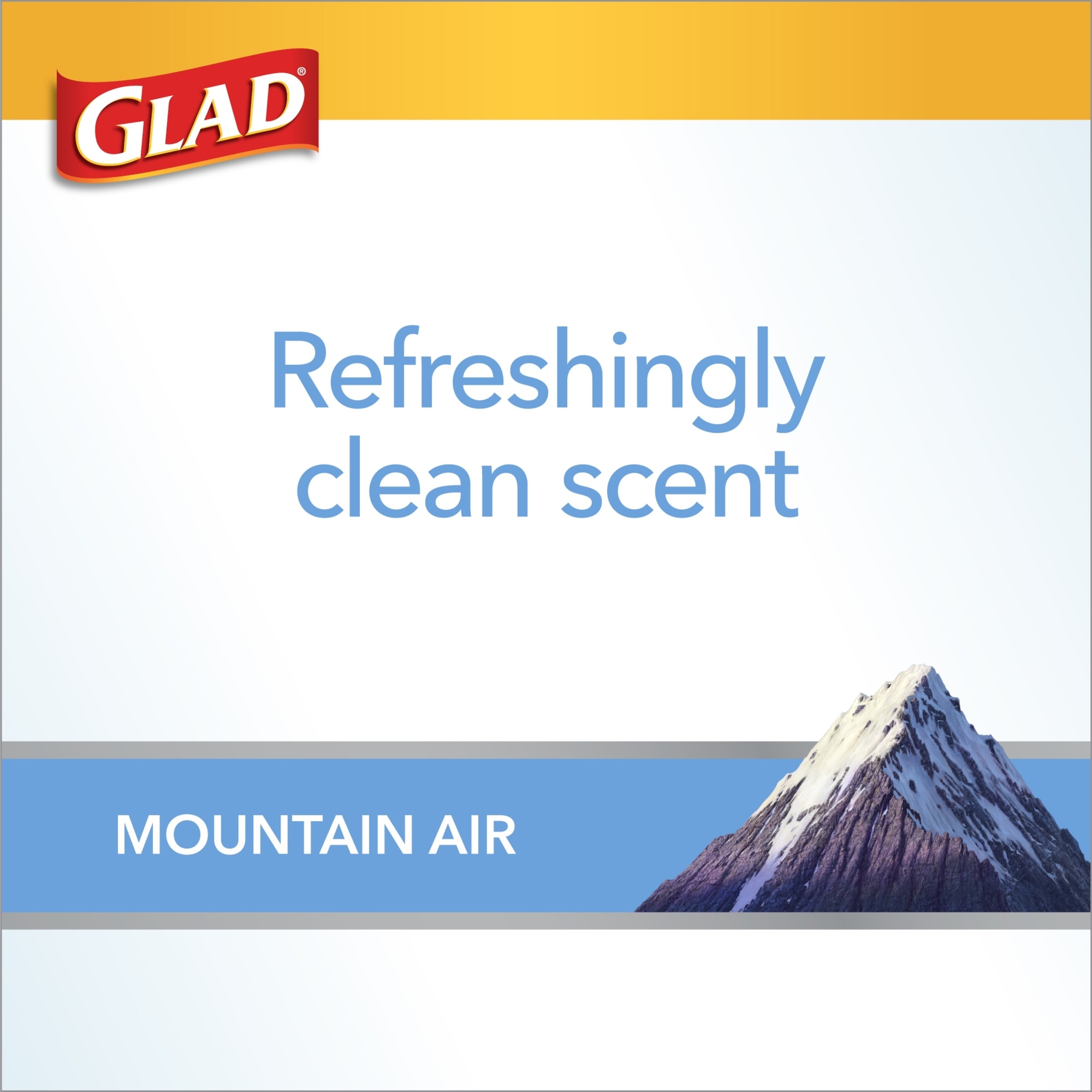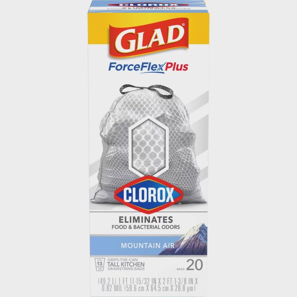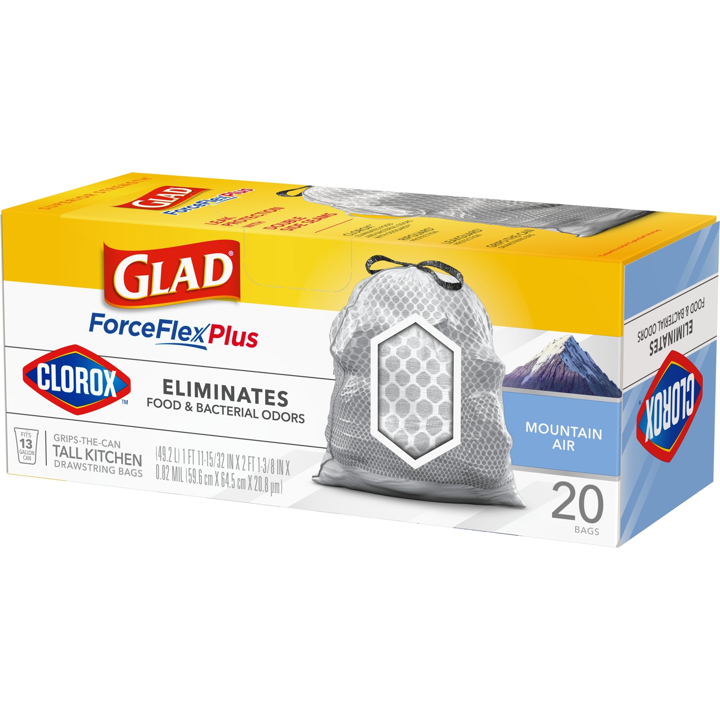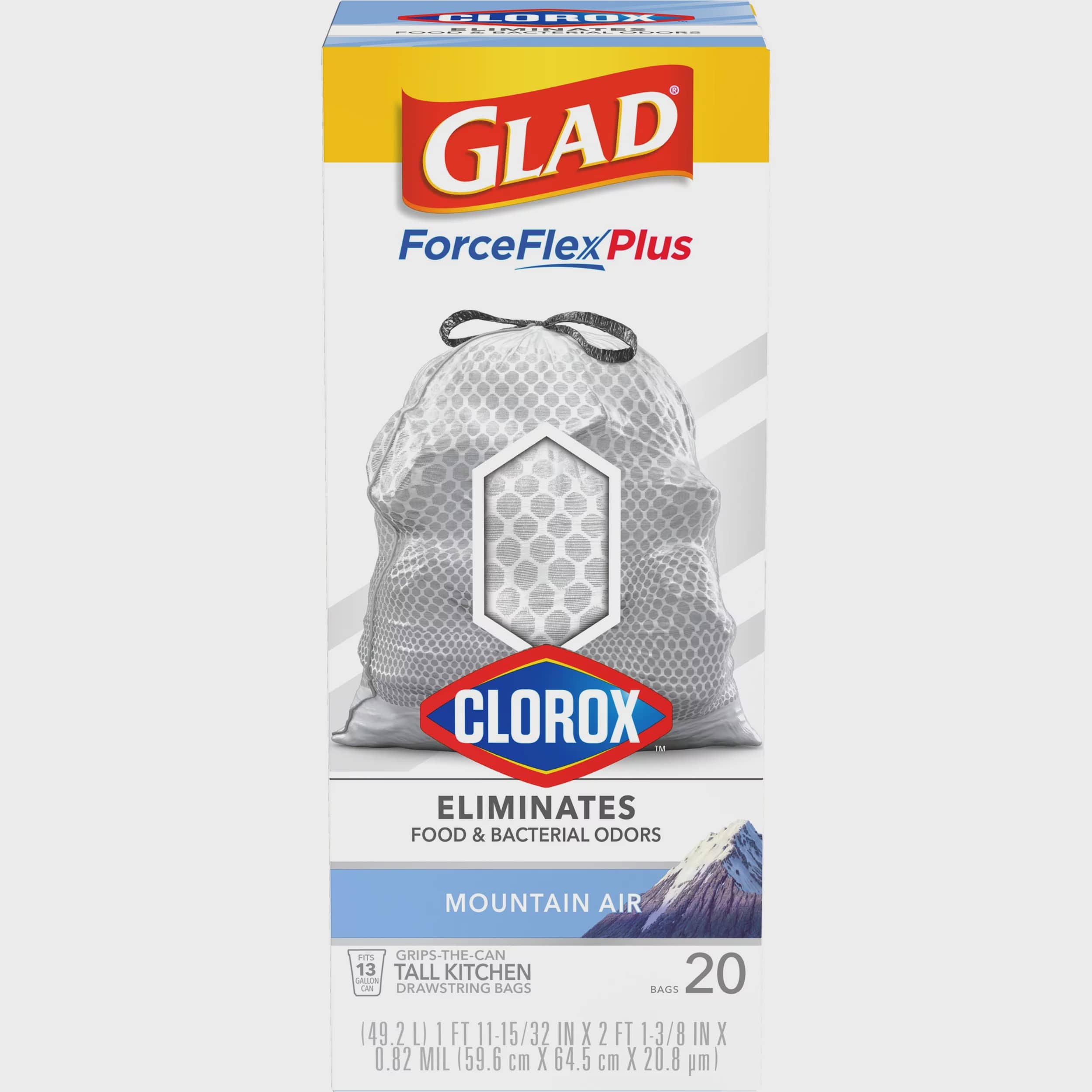 The strength of Glad plus the trusted power of Clorox have joined forces. Glad ForceFlex Plus with Clorox Tall Kitchen Trash Bags eliminate food and bacterial odors to keep your home feeling clean and healthy. These 13 gallon kitchen trash bags are dual layered with a unique hexagon pattern to provide complete protection against your toughest kitchen disasters. The outer layer is equipped with LeakGuard and double side seams for added leak protection, while the inner RipGuard layer stretches to prevent rips and tears with the trusted stretchable strength of Glads ForceFlex Plus technology. These versatile garbage bags feature the clean and gentle scent of Mountain Air and are ideal for use in the kitchen or for spring cleaning. The drawstring grips to the trash can, keeping the bag in place until you’re ready to take it out. Just a quick cinch of the durable drawstring makes trash removal simple.