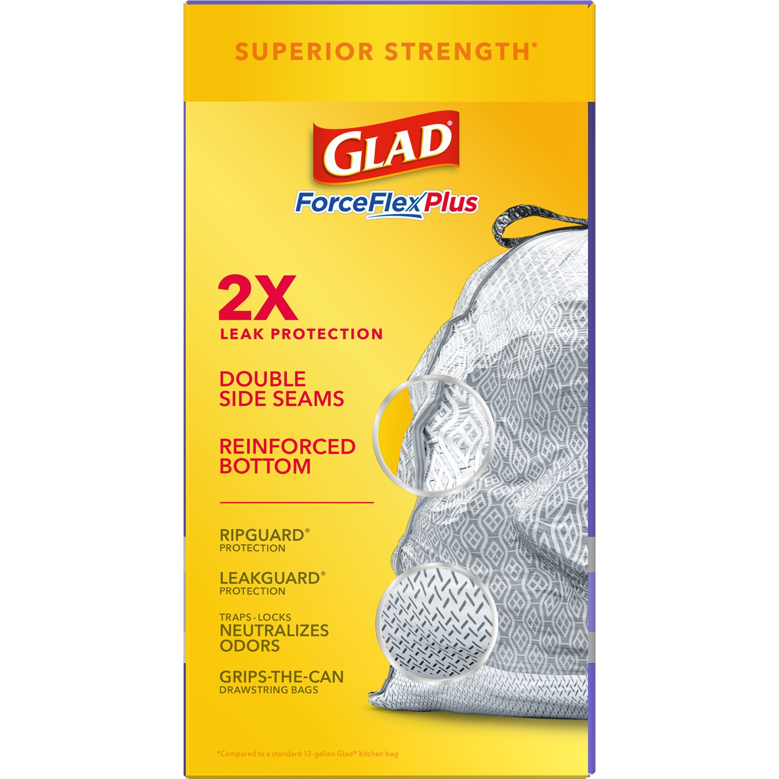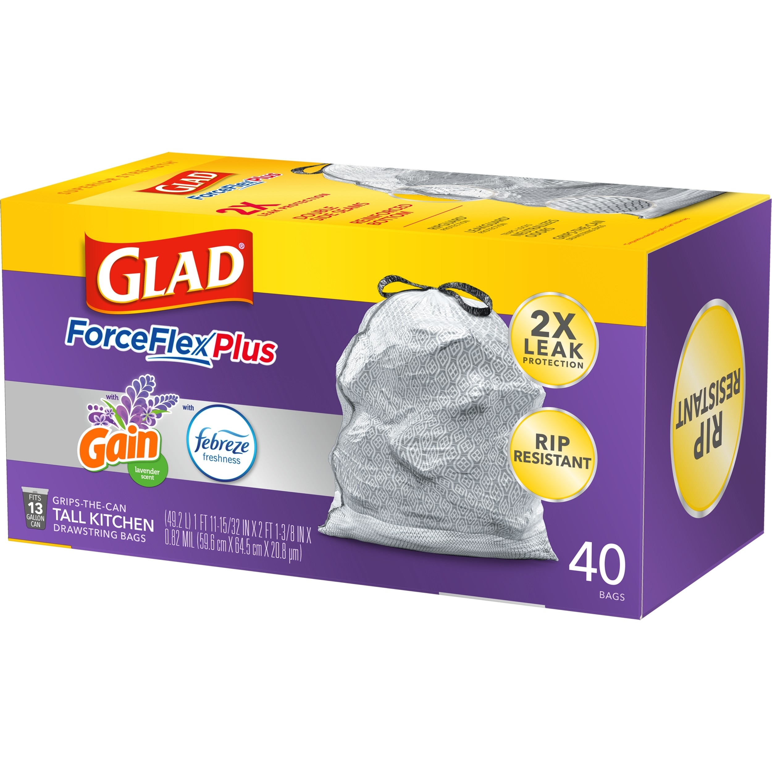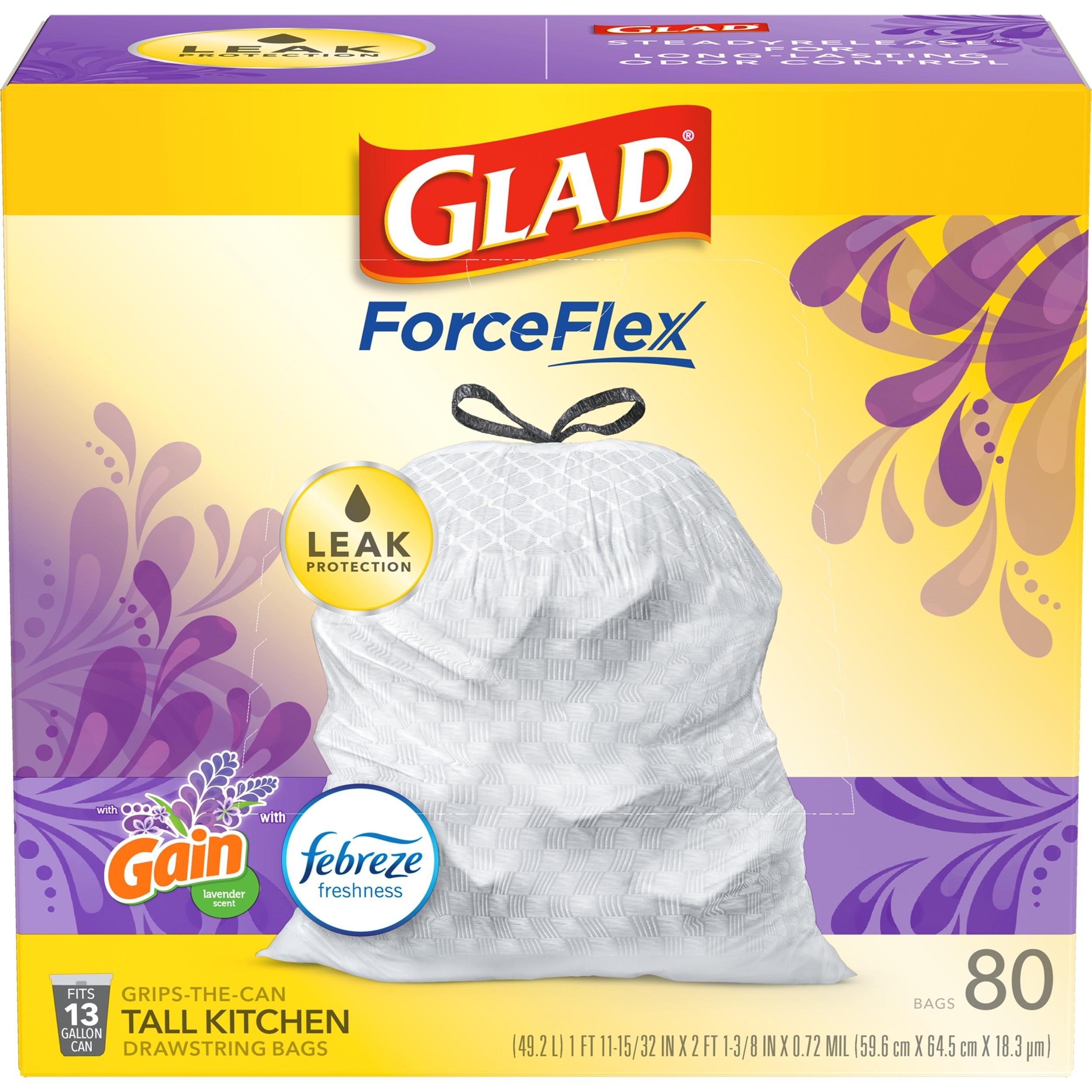 Glad ForceFlexPlus Tall Kitchen Drawstring Trash Bags provide 2X leak protection with double side seams and a reinforced bottom to guard against leaks and trap liquids in the bag. Designed with ForceFlexPlus technology, these trash bags provide two layers of strength and stretch for 2X Leak Protection. Plus, they trap, lock and neutralize odors with lasting Febreze freshness in Gain Original scent. What goes in the trash, stays in the trash with Glad, featuring RipGuard and LeakGuard technology. Glads two durable layers handle the most demanding trash, with an outer layer to protect against leaks and a strong inner layer to prevent rips and tears. The Grips-The-Can Drawstring ensures that the bag stays in place, making it easy to close and carry out the trash.