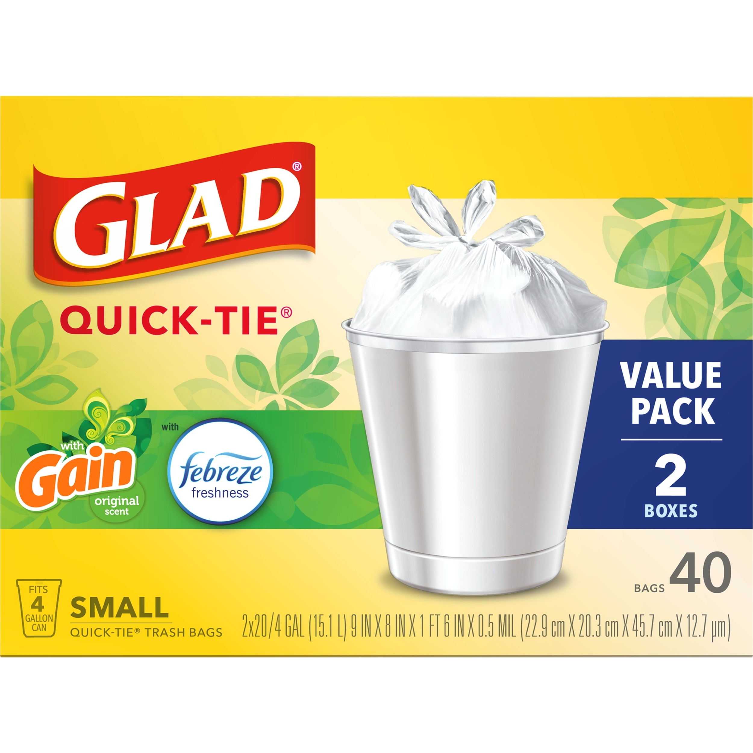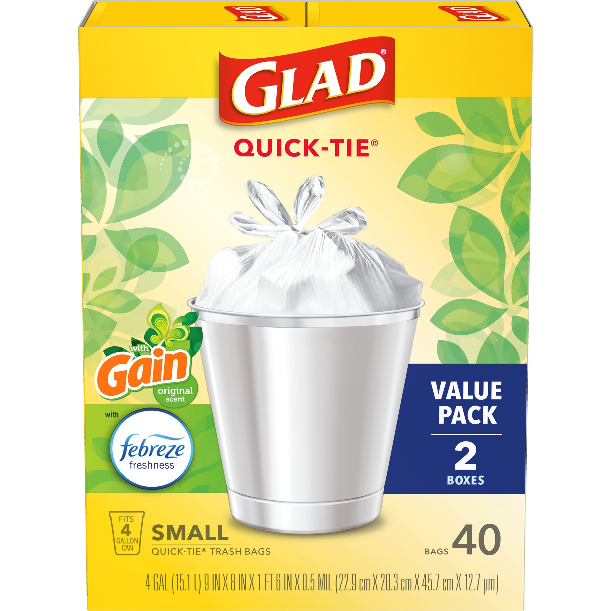 Glad Small Trash Bags, 4 Gallon, 40 Bags (Gain Original Scent, Febreze Freshness, Quick Tie)