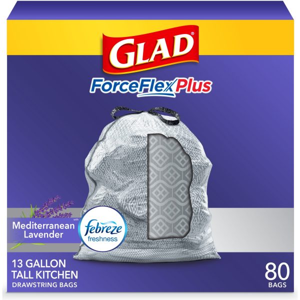 Glad ForceFlexPlus Tall Kitchen Trash Bags, 13 Gallon, 80 Bags (Mediterranean Lavender Scent, Febreze Freshness)