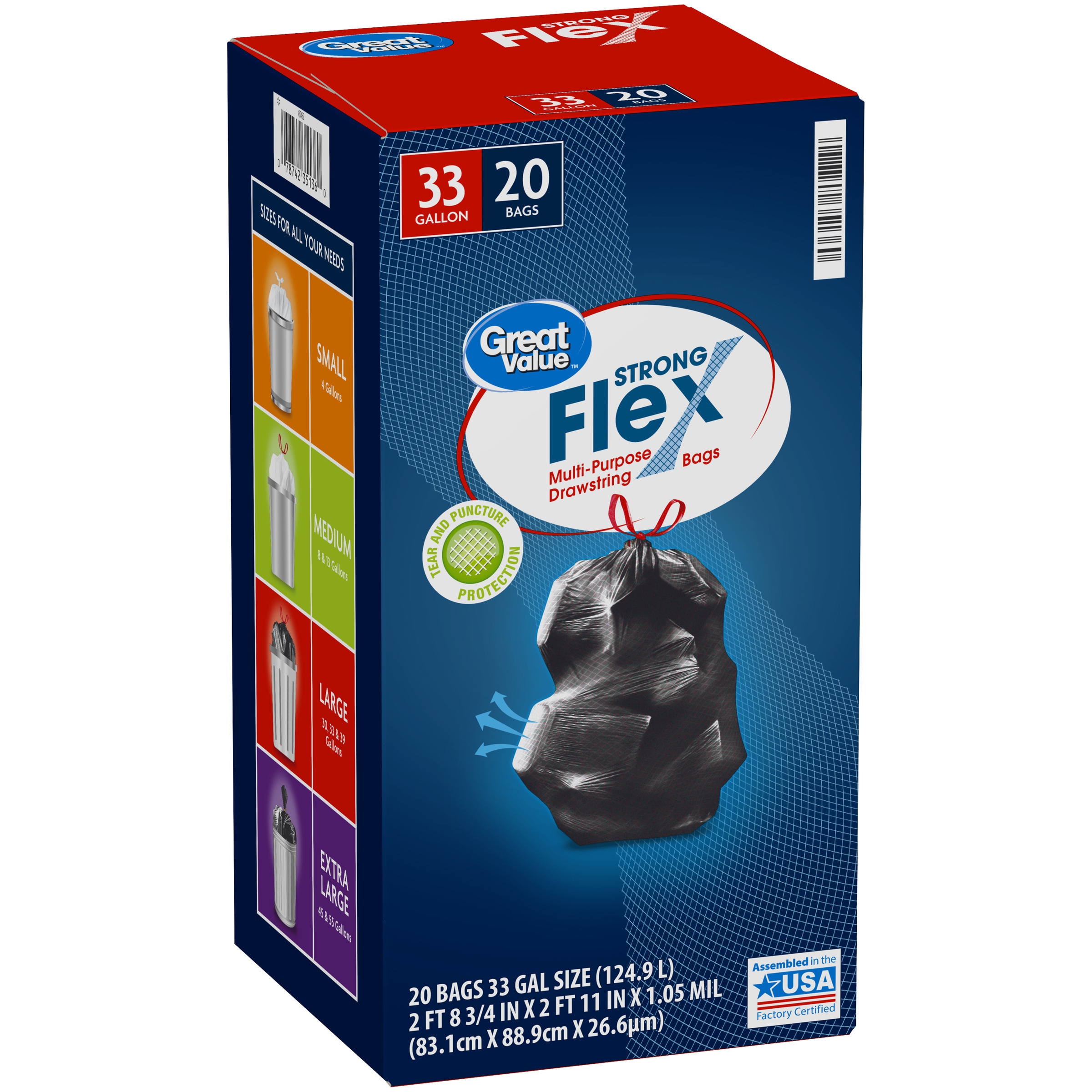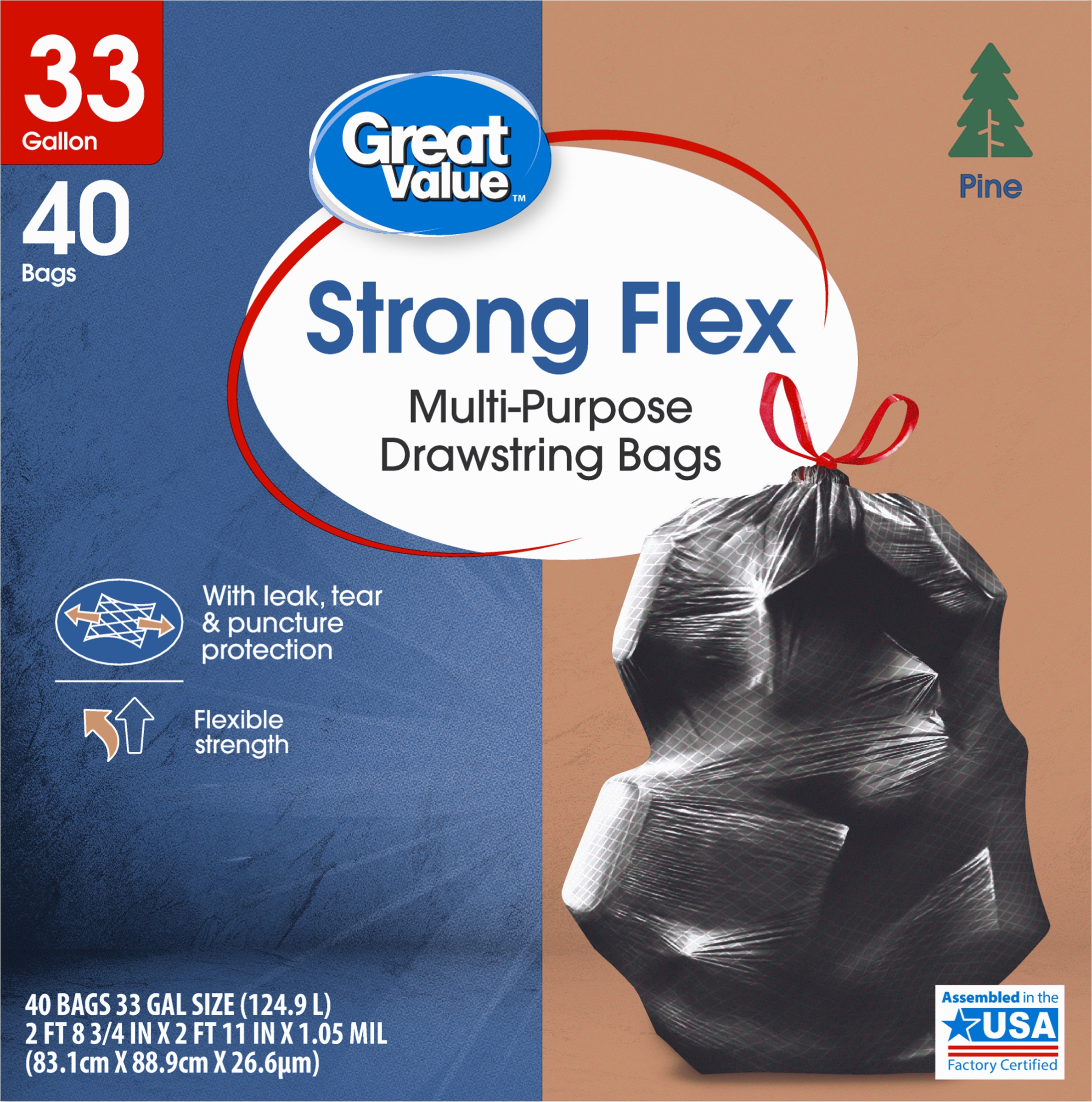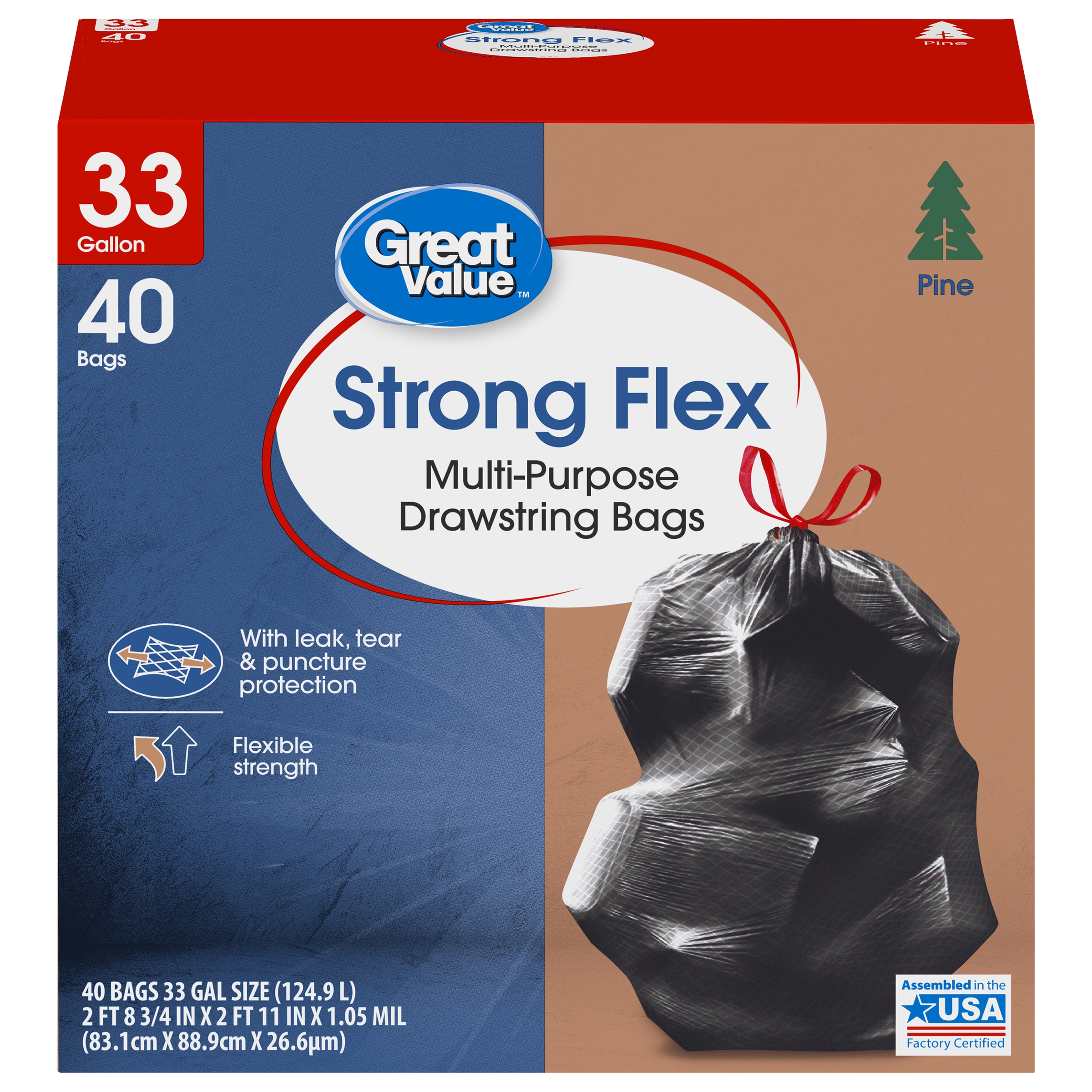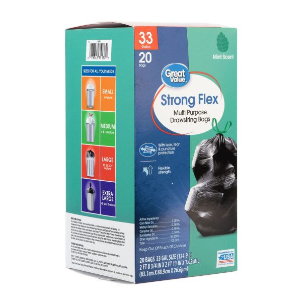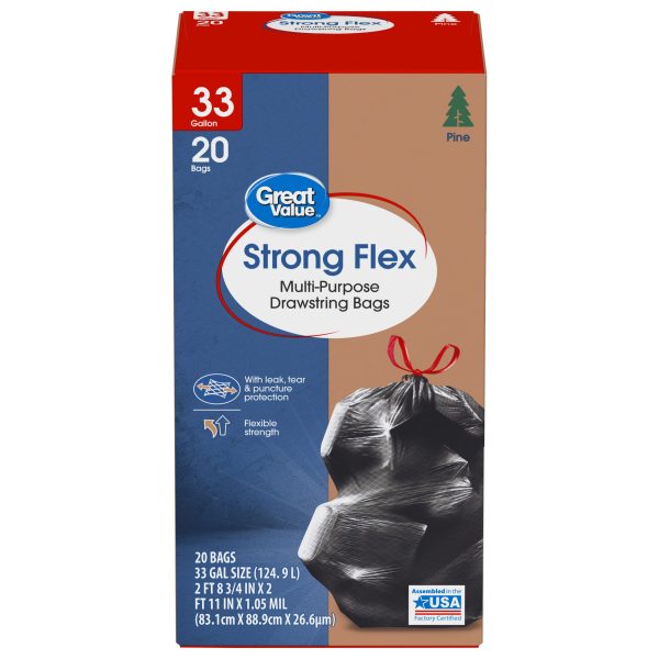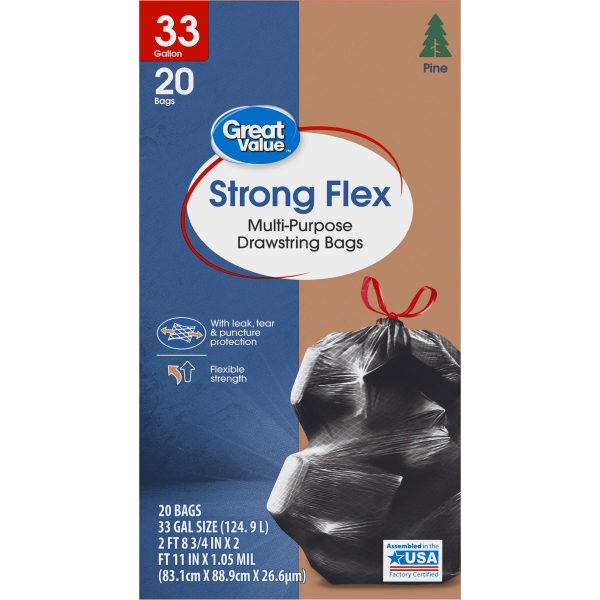 Take charge of large trash loads with Great Value Strong Flex Multi-Purpose Drawstring Trash Bags with Pine Scent. These 33-gallon trash bags have ample space to dispose of bulky loads and each package comes with 20 strong bags, ideal for offices, schools, hotels, hospitals, or outdoor use. The dark color keeps unsightly waste out of view and the drawstring ties make for easy and secure closure. Check out other Great Value products for all of your cleaning and organizing needs. Take control of garbage with Great Value Strong Flex Multi-Purpose Drawstring Trash Bags with Pine Scent. Great Value products provide families with affordable, high-quality grocery and household consumable options.