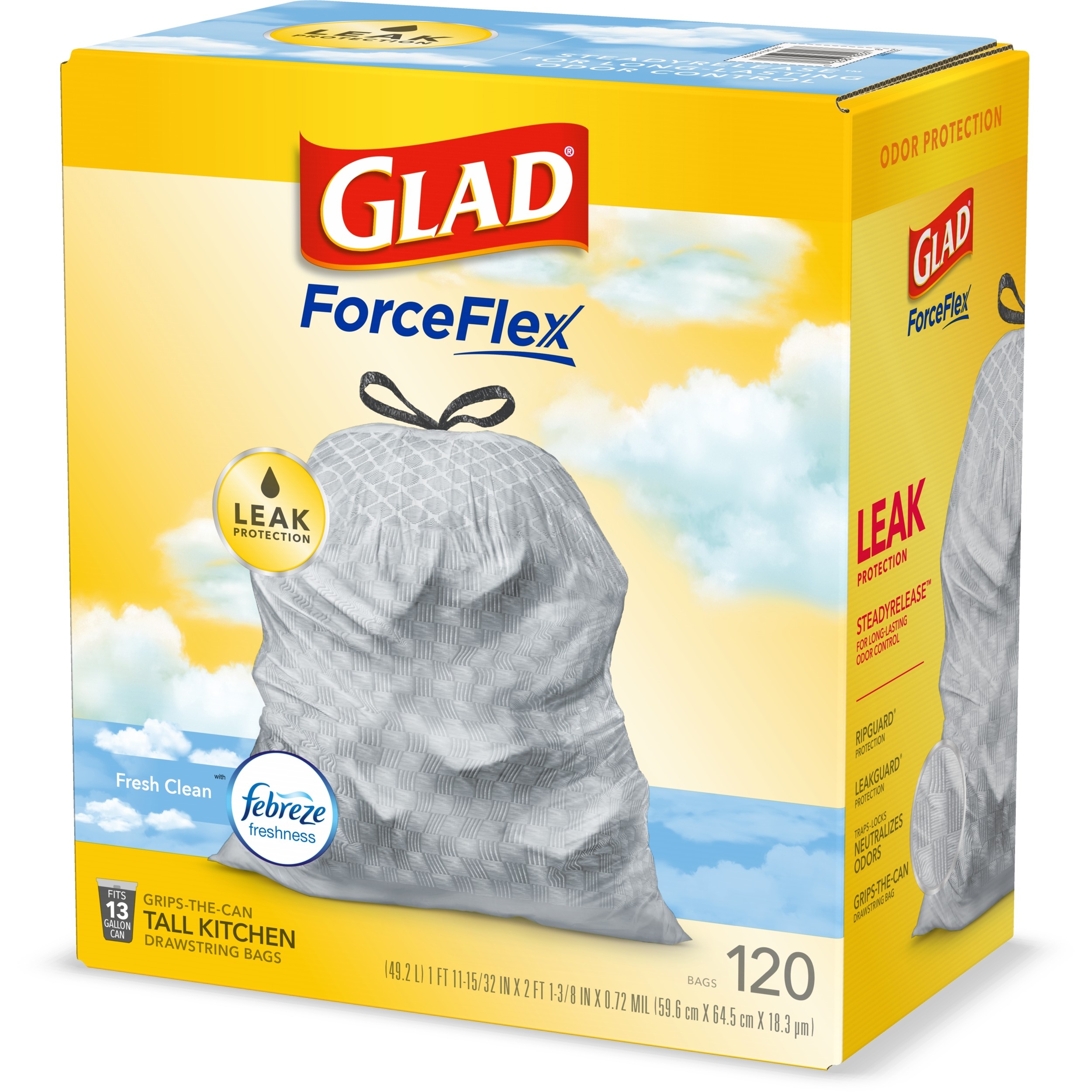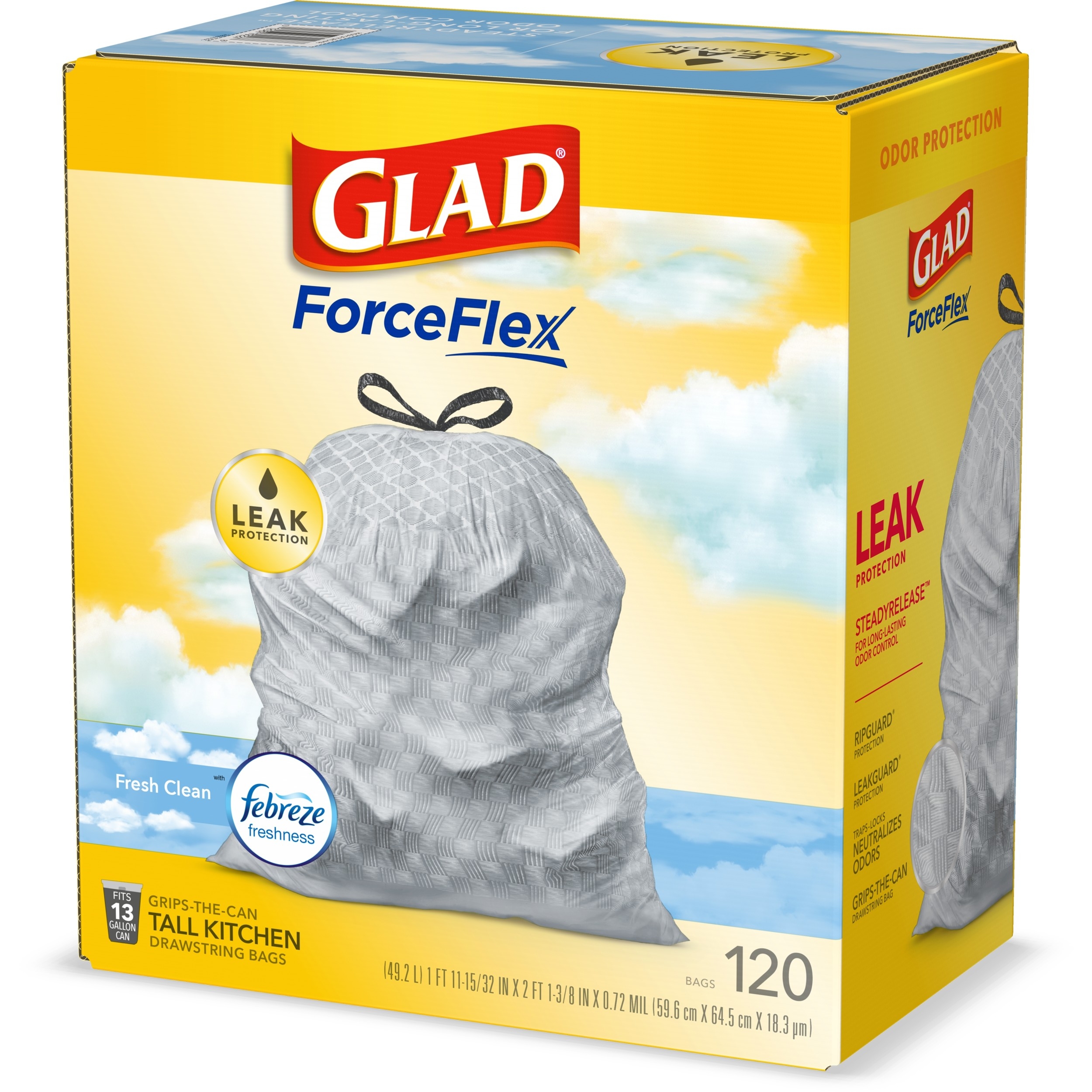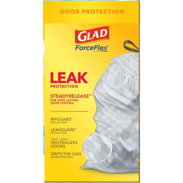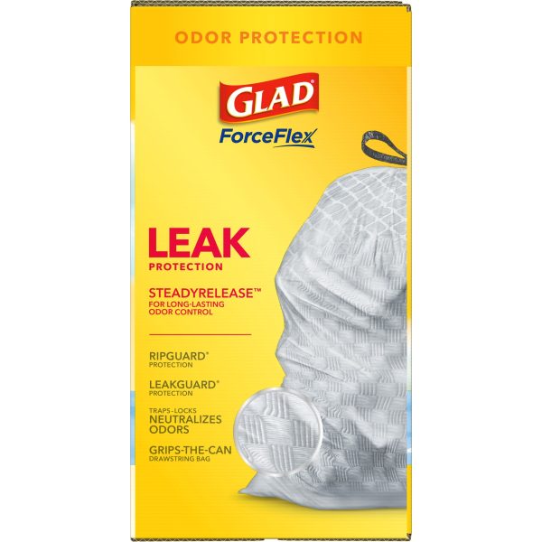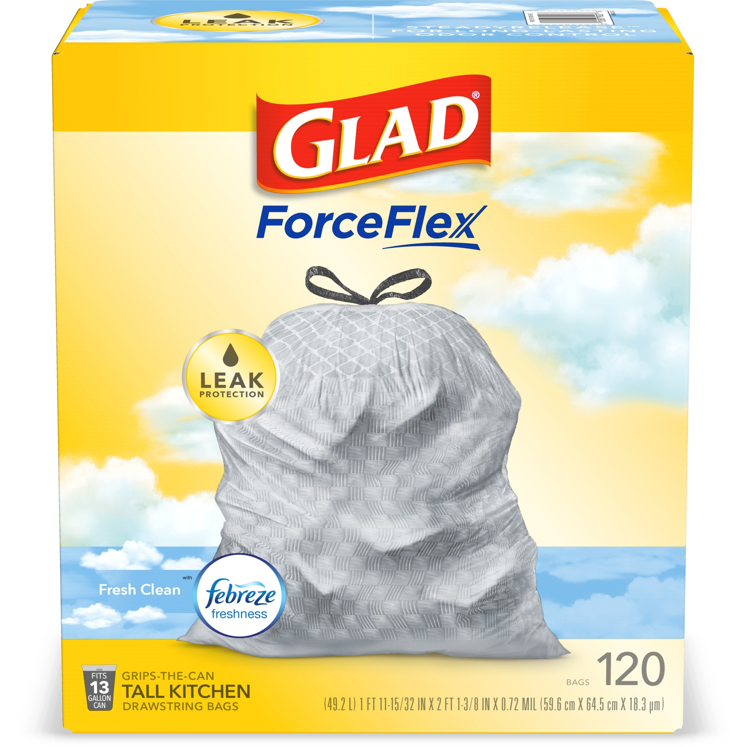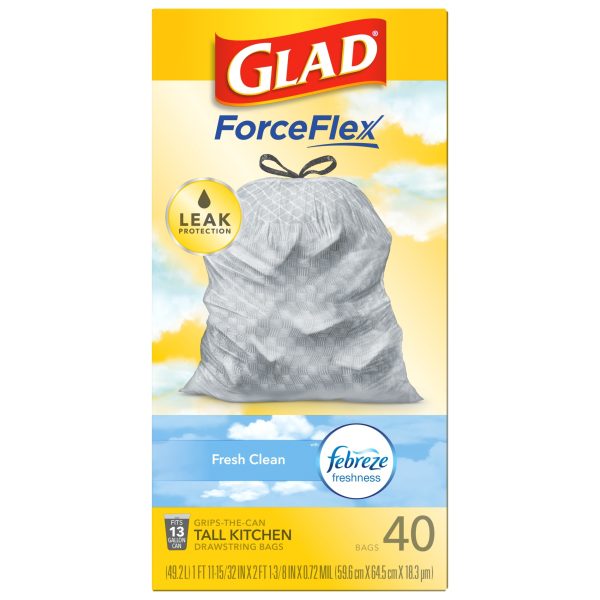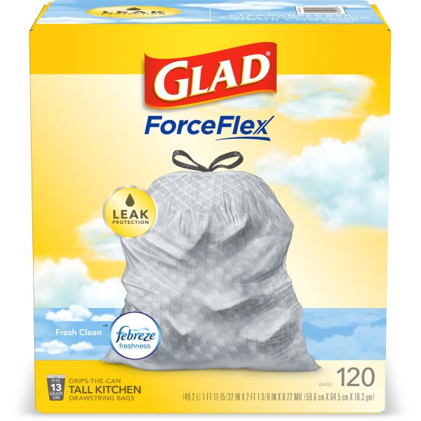 Fight nasty kitchen odors with Glad trash bags and the steady release of Febreze freshness. Glad Tall Kitchen Drawstring Trash Bags are designed with ForceFlex technology to give extra flex as it expands around sharp edges and heavy loads, so you can pack it in while resisting tears, rips and punctures. A steady release a Fresh Clean scent with Febreze Freshness keeps your kitchen pleasantly fresh smelling with long lasting odor control. Let the stretchable strength of Glad handle all the messes our busy daily life can throw at it and then some. With double-sided seals and a reinforced bottom, these bags are designed with RipGuard and LeakGuard technology to prevent seepage of liquids and keep trash contained. The durable Grips-The-Can Drawstring ensures a tight grip on the trash can to keep it in place. Take the trash to the curb with no fear of leaks and tears, and no frustration. Keep your kitchen smelling clean with the stretchable strength of Glad.